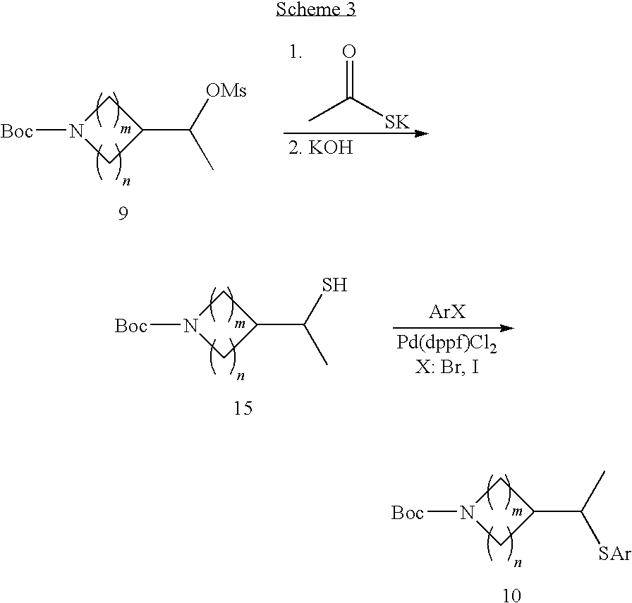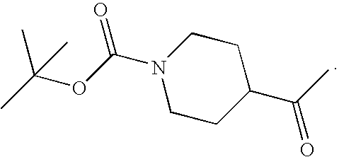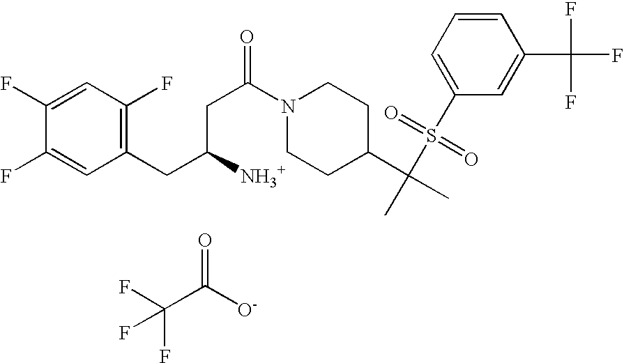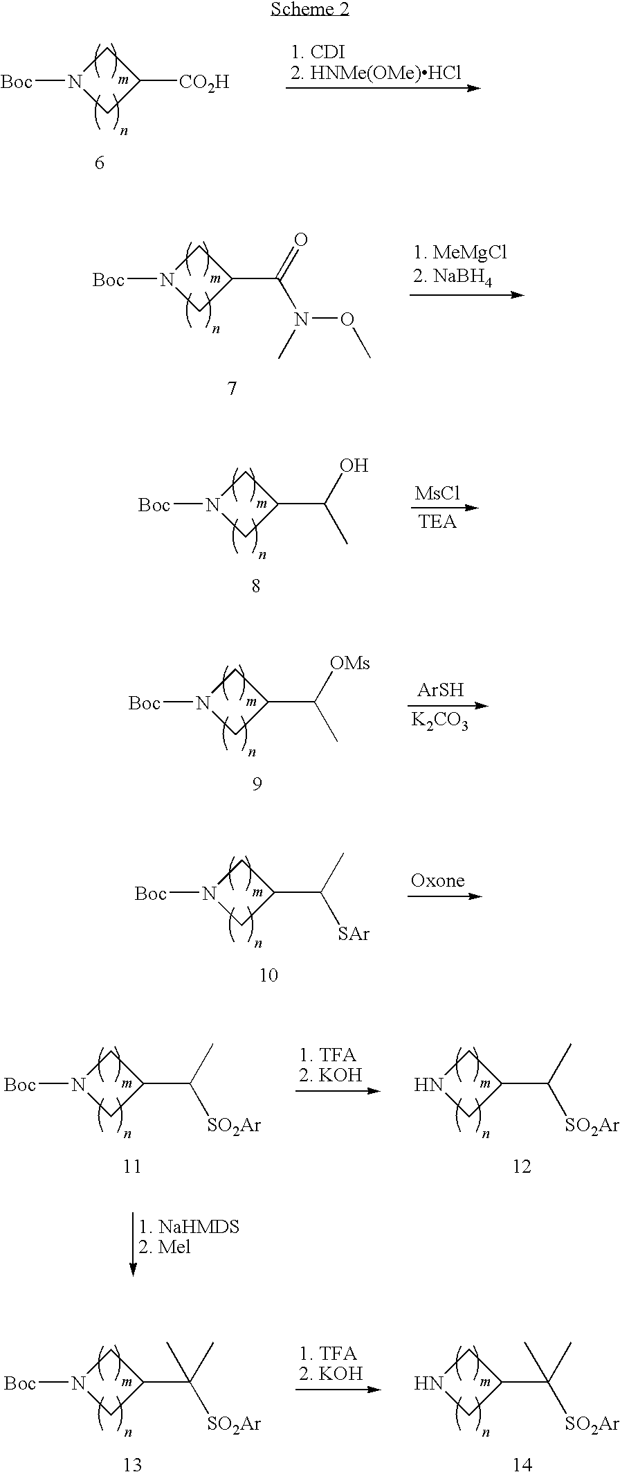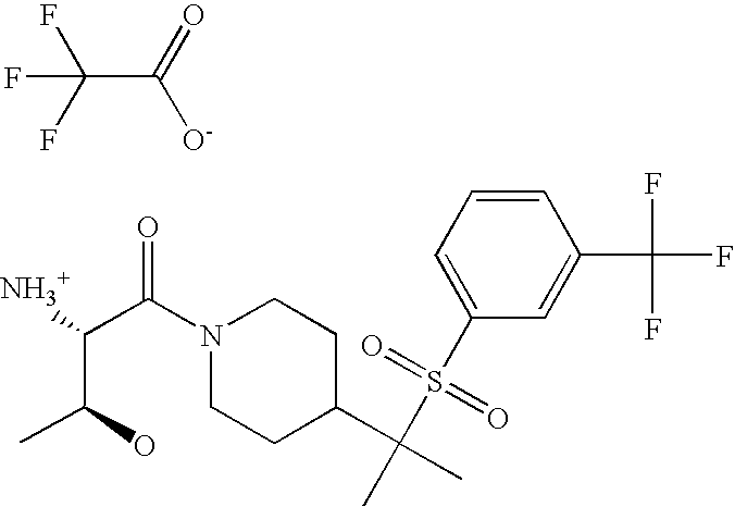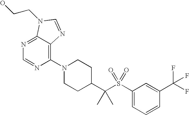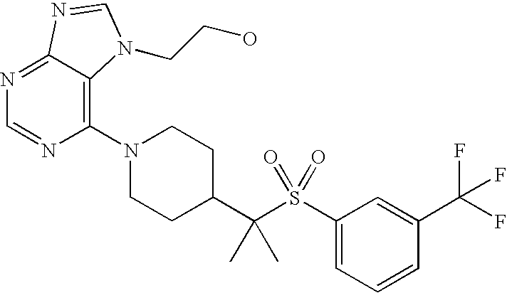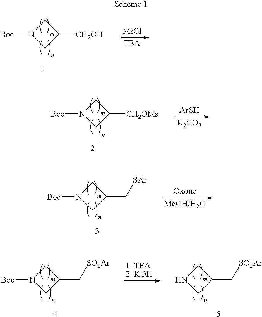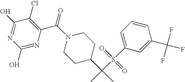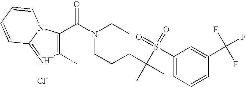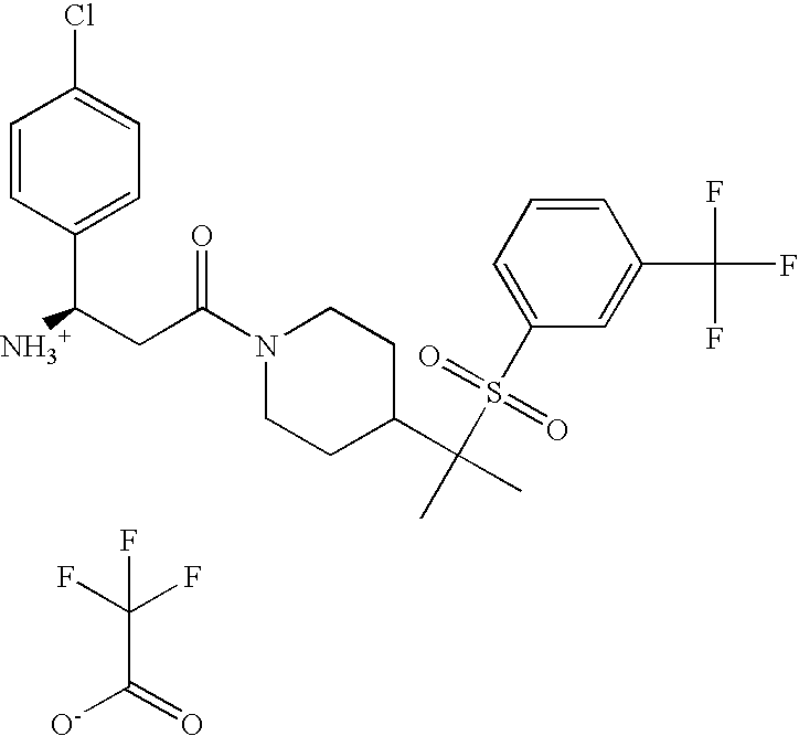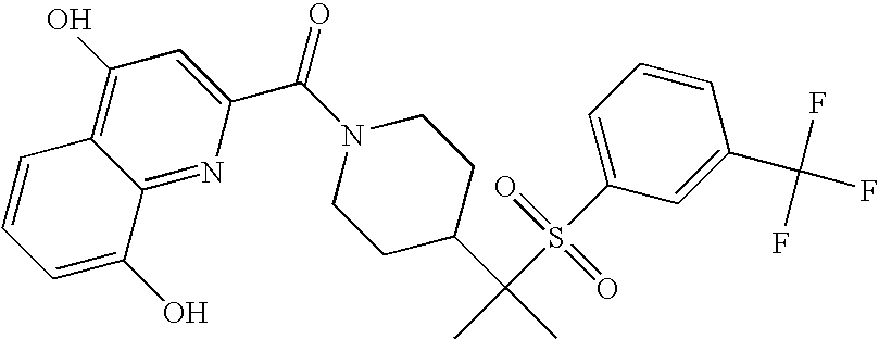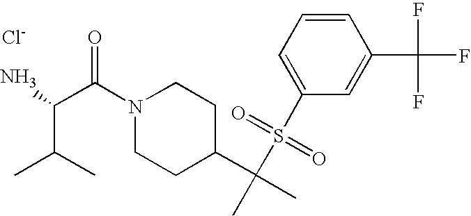 9 1-[4-(methylsulfonyl)-2- (trifluoromethoxy)benzoyl]- 4-({[3-(trifluoromethyl)- phenyl]sulfonyl}methyl)- piperidine 574 10 1-[5-fluoro-2- (methylsulfonyl)benzoyl]-4- ({[3-(trifluoromethyl)- phenyl]sulfonyl}methyl) piperidine 508 11 1-[2-(methylsulfonyl)-4- (trifluoromethyl)benzoyl]- 4-({[3-(trifluoromethyl)- phenyl]sulfonyl}methyl)- piperidine 558 12 1-[2-chloro-4- (methylsulfonyl)benzoyl]-4- ({[3-(trifluoromethyl)- phenyl]sulfonyl}methyl) piperidine 524 13 1-[5-fluoro-2-(methyl- sulfonyl)benzoyl]-4- ({[4-fluorophenyl)sulfonyl]- methyl}piperdinehyl} piperidine 458 14 4-{[(4-fluorophenyl)- sulfonyl]methyl}-1-[4- (methylsulfonyl)-2- (trifluoromethoxy)benzoyl] piperidine 524 15 4-{[(4-chlorophenyl)- sulfonyl]methyl}-1-[5- fluoro-2-(methyl- sulfonyl)benzoyl]piperidine 475 16 4-{[(4- chlorophenyl)sulfonyl] methyl}-1-[4-(methylsulfonyl)-2- (trifluoromethoxy)benzoyl] piperidine 541 17 4-{[(3- chlorophenyl)sulfonyl]methyl}- 1-[4-(methylsulfonyl)-2- (trifluoromethoxy)benzoyl] piperidine 541 18 1-(3,5-di-tert-butyl-4- methoxybenzoyl)-4-{[(4- fluorophenyl)sulfonyl]methyl} piperidine 504 19 4-{[(4- chlorophenyl)sulfonyl]methyl}- 1-(3,5-di-tert-butyl-4- methoxybenzoyl)piperidine 520 20 1-[4-(difluoromethoxy)-2- (methylsulfonyl)benzoyl]-4- ({[3-(trifluoromethyl)- phenyl]sulfonyl}methyl) piperidine 556 21 4-{[(4-fluorophenyl)- sulfonyl]methyl}-1-[2- (methylsulfonyl)-4- (trifluoromethyl)benzoyl] piperidine 508 22 1-[4-(difluoromethoxy)-2- (methylsulfonyl)benzoyl]-4- {[(4- fluorophenyl)sulfonyl]methyl} piperidine 506 23 4-{[(4- chlorophenyl)sulfonyl]methyl}- 1-[2-(methylsulfonyl)-4- (trifluoromethyl)benzoyl] piperidine 524 24 4-{[(4- chlorophenyl)sulfonyl]methy1}-1- [4-(difluoromethoxy)-2- (methylsulfonyl)benzoyl] piperidine 522 25 1-[2-(methylsulfonyl)-4- (trifluoromethoxy)benzoyl]- 4-({{3- (trifluoromethyl)phenyl] sulfonyl}methyl)piperidine 574 26 4-{[(4- chlorophenyl)sulfonyl]methyl}- 1-[2-(methylsulfonyl)-4- (trifluoromethoxy)benzoyl] piperidine 540 27 4-{[(4- fluorophenyl)sulfonyl]methyl}- 1-[2-(methylsulfonyl)-4- (trifluoromethoxy)benzoyl] piperidine 524 28 1-[4-(methylsulfonyl)-2- (trifluoromethoxy)benzoyl]- 4-(1-{[3-(trifluoromethyl) phenyl]sulfonyl}ethyl) piperidine 588 29 1-[4-(methylsulfonyl)-2- (trifluoromethoxy)benzoyl]- 4-((1S)-1-{[3-(trifluoromethyl) phenyl]sulfonyl}ethyl)piperidine 588 30 1-[4-(methylsulfonyl)-2- (trifluoromethoxy)benzoyl]- 4-((1R)-1-{[3- (trifluoromethyl) phenyl]sulfonyl} ethyl)piperidine 588 31 4-{1-[(4- fluorophenyl)sulfonyl]ethyl}-1- [4-(methylsulfonyl)-2- (trifluoromethoxy)benzoyl] piperidine 538 32 4-{1-[(4- chlorophenyl)sulfonyl]ethyl}- 1-[4-(methylsulfonyl)-2- (trifluoromethoxy)benzoyl] piperidine 555 33 4-{1-[(4- chlorophenyl)sulfonyl]ethyl}- 1-[5-fluoro-2-(methylsulfonyl) benzoyl]piperidine 488 34 1-[5-fluoro-2- (methylsulfonyl)benzoyl]- 4-(1-{[3-(trifluoromethyl)phenyl] sulfonyl}ethyl)piperidine 522 35 1-[2-(methylsulfonyl)-4- (trifluoromethyl)benzoyl]- 4-(1-{[3- (trifluoromethyl) phenyl]sulfonyl} ethyl)piperidine 572 36 tert-butyl4-(1-{[3- (trifluoromethyl)phenyl] sulfonyl}ethyl)piperidine-1- carboxylate 422 37 1-[2-(methylsulfonyl)-4- (trifluoromethoxy)benzoyl]- 4-((1S)-1-{[3- (trifluoromethyl)phenyl] sulfonyl}ethyl)piperidine 588 38 1-[4-(difluoromethoxy)-2- (methylsulfonyl)benzoyl]- 4-((1S)-1-{[3- (trifluoromethyl)phenyl] sulfonyl}ethyl)piperidine 570 39 1-[2-(methylsulfonyl)-4- (trifluoromethoxy)benzoyl]- 4-((1R)-1-{[3- trifluoromethyl)phenyl] sulfonyl}ethyl)piperidine 588 40 1-[4-(difluoromethoxy)-2- (methylsulfonyl)benzoyl]- 4-((1R)-1-{[3- (trifluoromethyl)phenyl] sulfonyl}ethyl)piperidine 570 41 1-[4-(cyclopropyloxy)-2,6- bis(methylsulfonyl)benzoyl]- 4-((1S)-1-{[3-(trifluoromethyl) phenyl] sulfonyl}ethyl)piperidine 638 42 1-[4-(cyclopropyloxy)-2,6- bis(methylsulfonyl)benzoyl]- 4-((1R)-1-{[3- (trifluoromethyl)phenyl] sulfonyl}ethyl)piperidine 638 43 2-(cyclopropylsulfonyl)-6- (trifluoromethyl)-3- {[4-((1S)-1-{[3- (trifluoromethyl)phenyl] sulfonyl}ethyl)piperidin-1- yl]carbonyl}pyridine 599 44 2-(cyclopropylsulfonyl)-6- (trifluoromethyl)-3- {[4-((1R)-1-{[3- (trifluoromethyl)phenyl] sulfonyl}ethyl)piperidin-1- yl]carbonyl}pyridine 599 45 3-chloro-5- (trifluoromethyl)-2-{[4- ((1S)-1-{[3- (trifluoromethyl)phenyl] sulfonyl}ethyl)piperidin-1- yl]carbonyl}pyridine 529 46 3-chloro-5- (trifluoromethyl)-2-{[4- ((1S)-1-{[3- (trifluoromethyl)phenyl] sulfonyl}ethyl)piperidin-1- yl]carbonyl}pyridine 529 47 3-(methylsulfonyl)-5- (trifluoromethyl)-2-{[4- ((1S)-1-{[3- (trifluoromethyl)phenyl] sulfonyl}ethyl)piperidin-1- yl]carbonyl}pyridine 573 48 3-(methylsulfonyl)-5- (trifluoromethyl)-2-{[4- ((1S)-1-{[3- (trifluoromethyl)phenyl] sulfonyl}ethyl)piperidin-1- yl]carbonyl}pyridine 573 49 3-(cyclopropylsulfonyl)-5- (trifluoromethyl)-2- {[4-((1S)-1-{[3- (trifluoromethyl)phenyl] sulfonyl}ethyl)piperidin-1- yl]carbonyl}pyridine 599 50 3-(cyclopropylsulfonyl)-5- (trifluoromethyl)-2- {[4-((1S)-1-{[3- (trifluoromethyl)phenyl] sulfonyl}ethyl)piperidin-1- yl]carbonyl}pyridine 599 51 4-(cyclopropyl{[3- (trifluoromethyl)phenyl] sulfonyl}methyl)-1-[5-fluoro- 2- (methylsulfonyl)benzoyl] piperidine 548 52 4-(cyclopropyl{[3- (trifluoromethyl)phenyl] sulfonyl}methyl)-1-[4- (methylsulfonyl)-2- (trifluoromethoxy)benzoyl] piperidine 514 53 1-[4-(methylsulfonyl)-2- (trifluoromethoxy)benzoyl]- 4-(1-methyl-1-{[3- (trifluoromethyl)phenyl] sulfonyl}ethyl)piperidine 602 54 1-[2-(methylsulfonyl)-4 (trifluoromethyl)benzoyl]- 4-(1-methyl-1-{[3- (trifluoromethyl)phenyl] sulfonyl}ethyl)piperidine 586 55 1-[5-fluoro-2- (methylsulfonyl)benzoyl]- 4-(1-methyl-1-{[3- (trifluoromethyl)phenyl] sulfonyl}ethyl)piperidine 536 56 1-(3-fluorobenzoyl)-4-(1- methyl-1-{[3- (trifluoromethyl)phenyl] sulfonyl}ethyl)piperidine 458 57 1-(3-methylbenzoyl)-4- (1-methyl-1-{[3- (trifluoromethyl)phenyl] sulfonyl}ethyl)piperidine 454 58 1-(3-methoxybenzoyl)-4- (1-methyl-1-{[3- (trifluoromethyl)phenyl] sulfonyl}ethyl)piperidine 470 59 1-(4-isopropylbenzoyl)-4- (1-methyl-1-{[3- (trifluoromethyl)phenyl] sulfonyl}ethyl)piperidine 