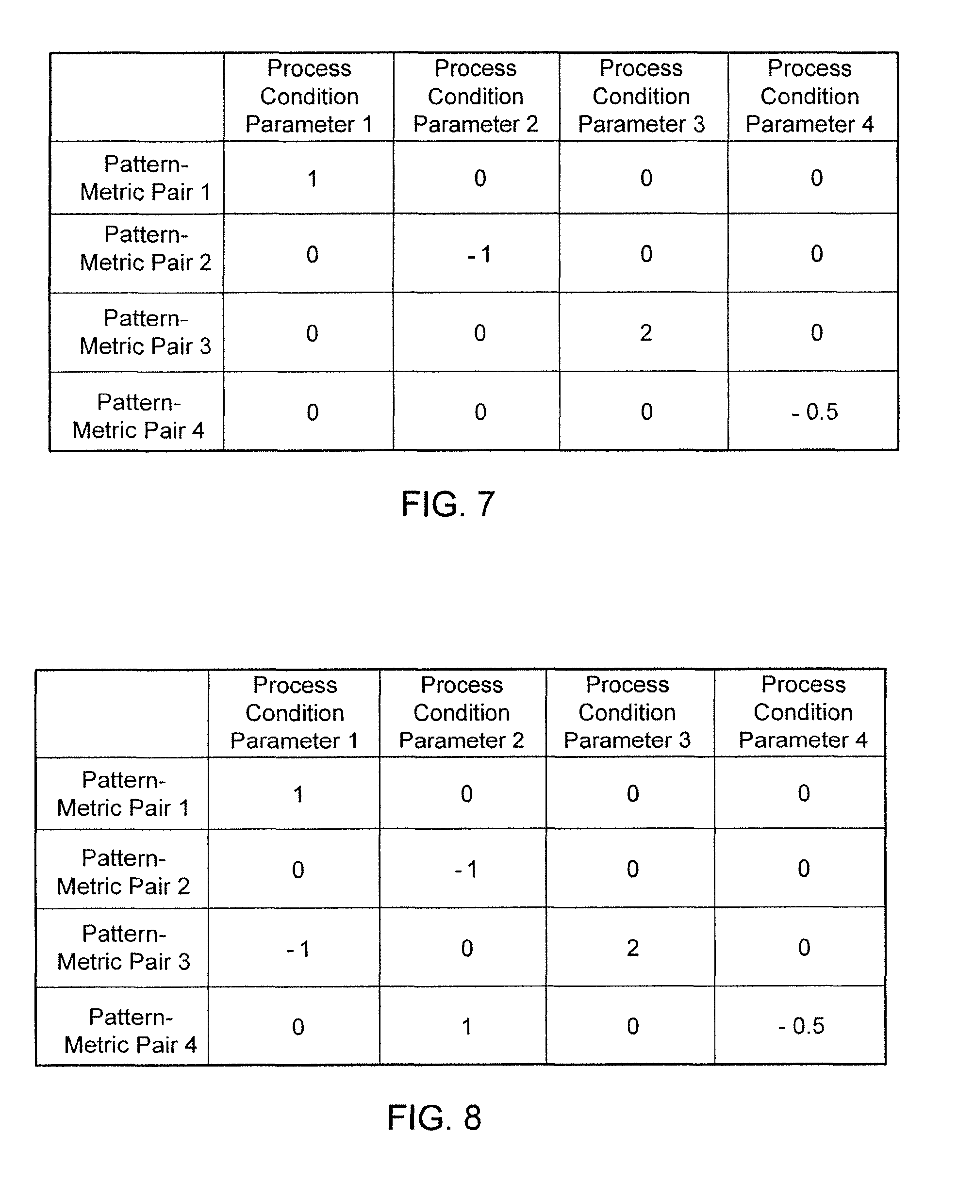 where G(F,E) is the difference measure as a function of the location in the process window (here values of focus, F, and exposure dose, E), N is the number of the signature patterns, where there is one metric measured for each signature pattern, Wiis a weighting factor, Mwafer(i)is a measured value of metric M of the i-th signature pattern, and Msim(i)(F,E) is a simulated value of metric M of the i-th signature pattern at a location (F,E) in the process window. The location in the process window, i.e., the values of focus and exposure dose (F,E), that results in the minimum value for G(F,E) is identified. In one example, determining the minimum value of G(F,E) may be performed by selecting an arbitrary location in the process window, solving for G(F,E) for that location, and iterating these steps until the minimum value of G(F,E) is determined. Any appropriate techniques for determining the minimum value of G(F,E) are within the scope of the invention, for example using a steepest decent algorithm or using a look-up table.