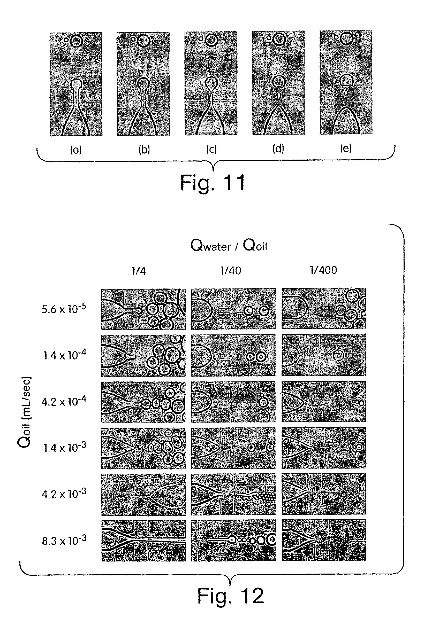 Referring now to FIG. 5, one general principle for droplet formation of the invention is illustrated schematically. In FIG. 5 a plurality of subject droplets 60 flow in a direction indicated by arrow 62. Droplets 60 are dispersed-phase droplets contained within a dispersant (surrounding droplets 60, but not specifically indicated in the figure). Droplets 60 are caused to flow against and impact upon an obstruction 62, whereupon droplet 60 is broken up into smaller droplets 64 downstream of the obstruction. Droplets 60 can be directed toward and urged against obstruction 62, and thereby broken up into droplets 64 using any suitable technique including microfluidic techniques described herein.