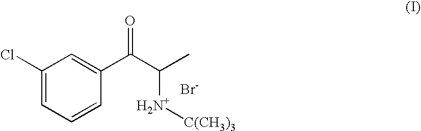 Bupropion HBr about 30.0% by weight of the matrix Hydroxypropylmethylcellulose E50 about 10.0% by weight of the matrix Hydroxypropylmethylcellulose about 30.0% by weight of the matrix K15M Calcium phosphate dehydrate about 9.5% by weight of the matrix ATMUL ™ 84S about 20.0% by weight of the matrix (mono/di/tri glycerides) Magnesium stearate about 0.5% by weight of the matrix Bupropion HBr about 45.0 g hydroxypropylmethylcellulose about 35.0 g (METHOCEL ® K 100M-Colorcon) mannitol about 10.0 g ethylcellulose (high viscosity-BDH) about 3.75 g 3.75 g magnesium stearate about 1.0 g 5:1 ethanol-chloroform mixture about 75.0 ml Bupropion Hydrobromide about 50% PEO WSR Coagulant about 15% (polyethylene oxide) METHOCEL ® K100M about 15% (hydroxypropylmethyl cellulose) Avicel PH101 about 19% (microcrystalline cellulose) Magnesium Stearate about 1%
