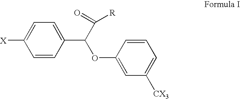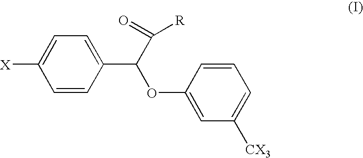 14. The method of claim 1, wherein hydrolysis of the ester provides (−) 4-chlorophenyl-(3-trifluoromethylphenoxy) acetic acid.