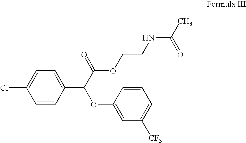 The preferred compound of Formula III is known as “(−) 2-acetamidoethyl 4-chlorophenyl-(3-trifluoromethylphenoxy)-acetate” or “(−) halofenate.”