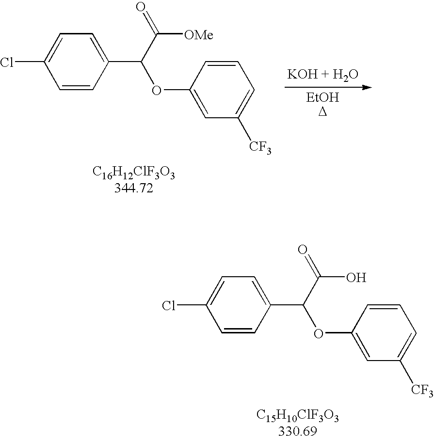A 12-L Morton reactor with magnetic stirrer, pot temperature controller, a reflux condenser and under a nitrogen atmosphere was charged with methyl 4-chlorophenyl-(3-trifluoromethylphenoxy)-acetate (810 gm, 2.3 moles) and absolute ethanol (5.8 L) and heated with stirring to 57° C. to dissolve the solid. A solution of KOH (520 gm, 9.3 moles) in 0.98 L water was added. The solution was refluxed for 30 min. and solvent was stripped by a rotary evaporator to obtain 2.03 kg of a mixture of two nearly colorless liquids. These were dissolved in water (16 L) and treated with 16 gm neutral Norit, then filtered through a pad of infusorial earth retained on Whatman #1 filter paper. The pH of the filtrate was lowered from an initial range of 13 to a range of 1 to 2 by adding a total of 2.75 L of 3 M HCl (8.25 moles). A very sticky solid formed after the addition of the first 2.30 L of acid and ether (7 L) was added at this point. The two layers were separated and the organic layer was dried over MgSO4(230 gm) and filtered through Whatman #1 filter paper. The solvent was then stripped to obtain 0.85 kg water-white syrup. The material was then recrystallized on the rotary evaporator by adding methylcyclohexane (800 ml) and cooling to 18° C. with slow rotation. The temperature was then dropped to 5° C., the crystals were filtered, and washed 5 times with 0.10 L portions of cold (0° C.) methylcyclohexane to obtain 0.59 kg wet crystals. The wet crystals were dried to obtain 0.48 kg (62% yield) product with no p-chlorophenylacetic acid detectable in the proton NMR. The product proton NMR (CDCl3, 300 MHz) shows shifts at 5.65 (s, 1H), 7.02-7.58 (m, 8H) and 10.6 (s, 1H).