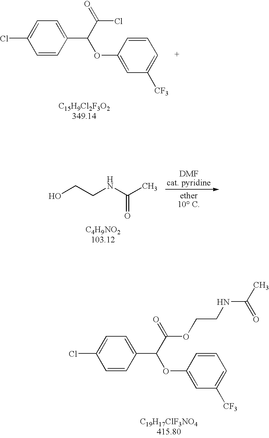 A 3-L round-bottom flask with magnetic stirrer, pot thermometer, under a nitrogen atmosphere and in an ice-water bath was charged with DMF (365 ml), pyridine (33 ml, 32.3 g, 0.41 mole) and N-acetoethanolamine (34 ml, 3.8.1 g, 0.37 mole). The mixture was cooled to 0° to 5° C. and a solution of crude (+) 4-chlorophenyl-(3-trifluoromethylphenoxy)-acetyl chloride (139 gm, 0.37 mole based on 100% yield of previous step) in ether (155 ml) was added over a 25 min. period so as to maintain the pot temperature below 13° C. The mixture was stirred at ambient temperature 40 hours and dissolved by adding water (850 ml) followed by ethyl acetate (550 ml). The water addition proceeded exothermically raising the temperature from 24° to 34° C. Ethyl acetate addition caused a temperature drop to 30° C. The layers were separated and the aqueous phase extracted once with ethyl acetate (110 ml). The combined organic layers were washed twice with 55 ml portions of water and then five times with 55 ml portions of 25% (w:w) aqueous NaCl and dried over 30 g MgSO4and filtered through Whatman #1 filter paper. Solvent was stripped using a rotary evaporator to obtain 168 g yellow liquid corresponding to an 86% yield based on the proton nmr that shows 79% product, 9% EtOAc, 8% non-brominated amide, and 4% DMF. The product was crystallized in an 800-ml beaker by dissolving in MTBE (200 ml) at ambient temperature, cooling at −15° for 1.4 hours, adding 200 ml 85% hexanes and then chilling 1 hour. The solid mass was scraped out onto a Buchner funnel fitted with Whatman #1, packed down and washed once with 1:1 (v:v) MTBE:hexanes (100 ml) to obtain 201 gm wet product. The product was dried under nitrogen flow and triturated with 85% hexanes (700 ml) using an overhead stirrer. The material was filtered and dried to obtain 87 gm product. [α]D+2.769° (c.=0.048 in methyl alcohol). [α]D-2.716° (c.=0.049 in methyl alcohol). The (+) and (−) enantiomers were also analyzed by HPLC using a 250×4.6 mm R,R-WhelkO-1 column at ambient temperature. Injected samples were 20 μl of 2 mg/ml solutions of the samples in ethanol. The column was eluted with 60:40, isopropanol:hexane at a flow of 1 ml/min. Detection was at 220 nm. The (+) enantiomer eluted at 5.0 to 5.2 min. and the (−) enantiomer at 5.7 to 5.9 min.