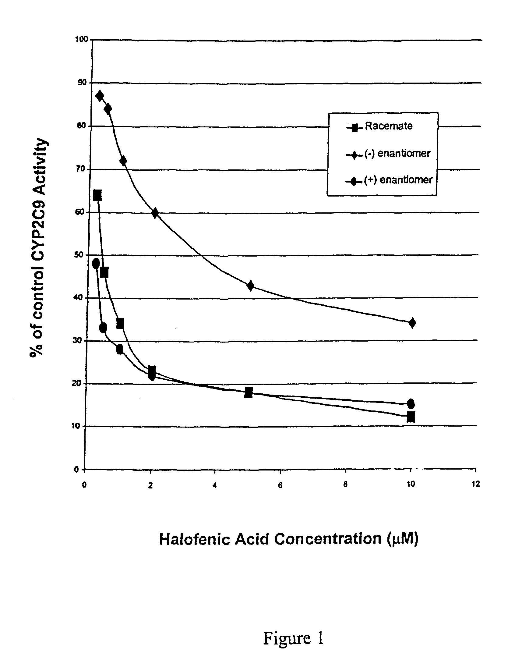 Tolbutamide hydroxylation activity (100 μM14C-tolbutamide; 1 mM NADPH) was assayed in pooled human liver microsomes (0.6 mg protein/ml)) for 60 minutes at 37° C. both with and without test compounds. Racemic halofenic acid, (−) halofenic acid and (+) halofenic acid were tested (0.25 μM to 40 μM). As shown in FIG. 1, racemic halofenic acid inhibited CYP2C9-mediated tolbutamide hydroxylation activity in human liver microsomes with an apparent IC50of 0.45 μM. A substantial difference was noted in the ability of the enantiomers of halofenic acid to inhibit CYP2C9. The (+) halofenic acid had an apparent IC50of 0.22 μM whereas the (−) halofenic acid was almost 20-fold less potent with an apparent IC50of 3.6 μM.