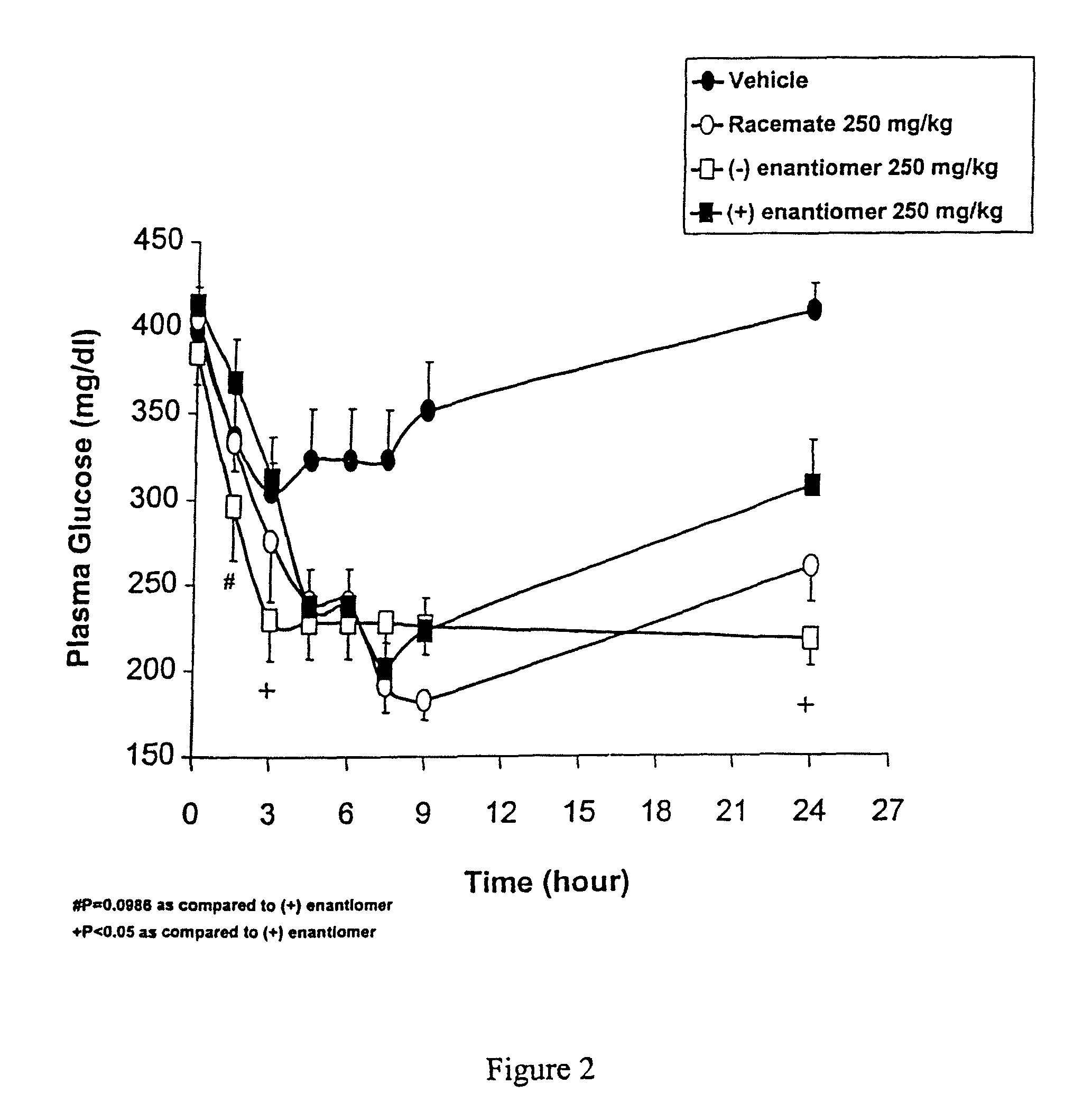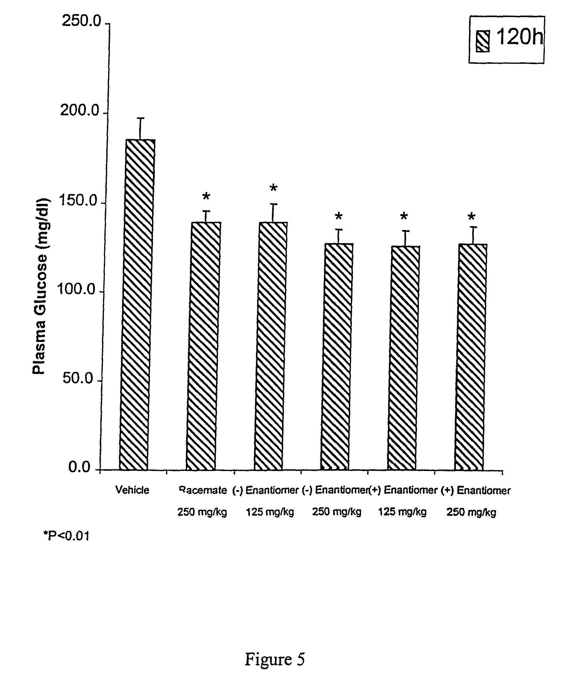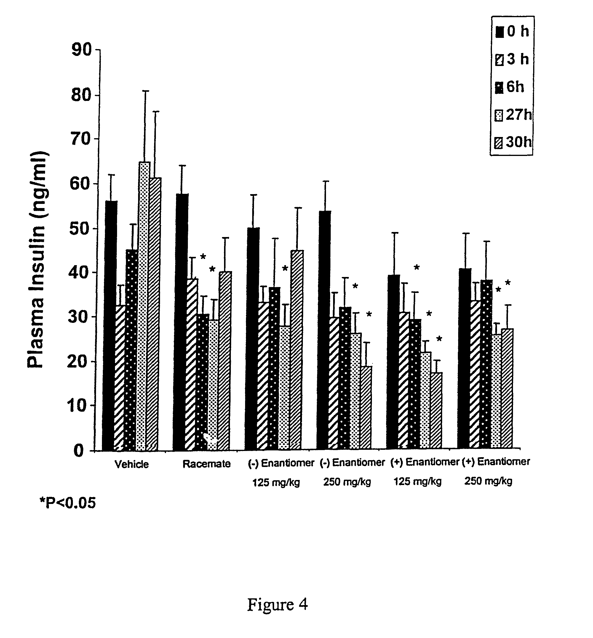 FIG. 3 shows the ability of racemic halofenate and both the (−) and (+) enantiomers of halofenate to lower plasma glucose in diabetic ob/ob mice following daily oral administration. The racemate was given at a dose of 250 mg/kg/day and the enantiomers were given at doses of 125 mg/kg/day and 250 mg/kg/day. Significant decreases in glucose levels relative to control animals were observed in animals treated with racemic halofenate and both the (−) and (+) enantiomers. At the low dose (125 mg/kg) of treatment with the (−) and (+) enantiomers, the (−) enantiomer was significant at 6, 27 and 30 hours whereas the (+) enantiomer was significant at only 6 and 27 hours.
