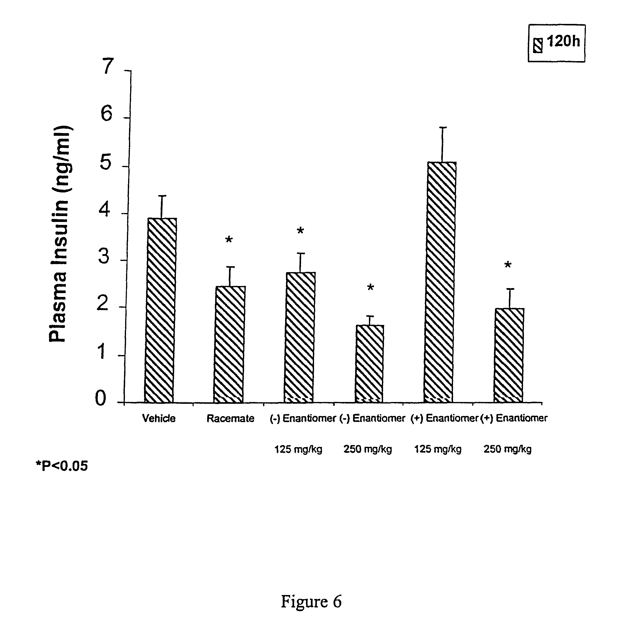 As illustrated in FIG. 3, (−) halofenate significantly reduced plasma glucose concentrations at 6, 27 and 30 hours. (−) Halofenate at both dosage levels significantly lowered plasma glucose concentrations at 6, 27 and 30 hours. The high-dose (250 mg/kg) was also active at 3 hours. (+) Halofenate at 125 mg/kg showed plasma glucose reduction at 6 and 27 hours, where at 250 mg/kg, lowered plasma glucose concentrations were observed at 3, 6, 27 and 30 hours. Plasma insulin levels are shown in FIG. 4. Racemic halofenate significantly reduced insulin at 6 and 27 hours. Plasma insulins were significantly reduced in the (−) halofenate group at 27 hours at both doses and was significantly reduced at 30 hours in the animals treated with 250 mg/kg/day. (+) halofenate significantly reduced insulin at 27 and 30 hours at both doses. At 125 mg/kg/day a significant reduction was also observed after 6 hours. After fasting overnight (at 120 hours), all treatments reduced plasma glucose concentrations significantly (FIG. 5). Plasma insulins were significantly reduced in all halofenate treated groups except the (+) halofenate at 125 mg/kg/day (FIG. 6).