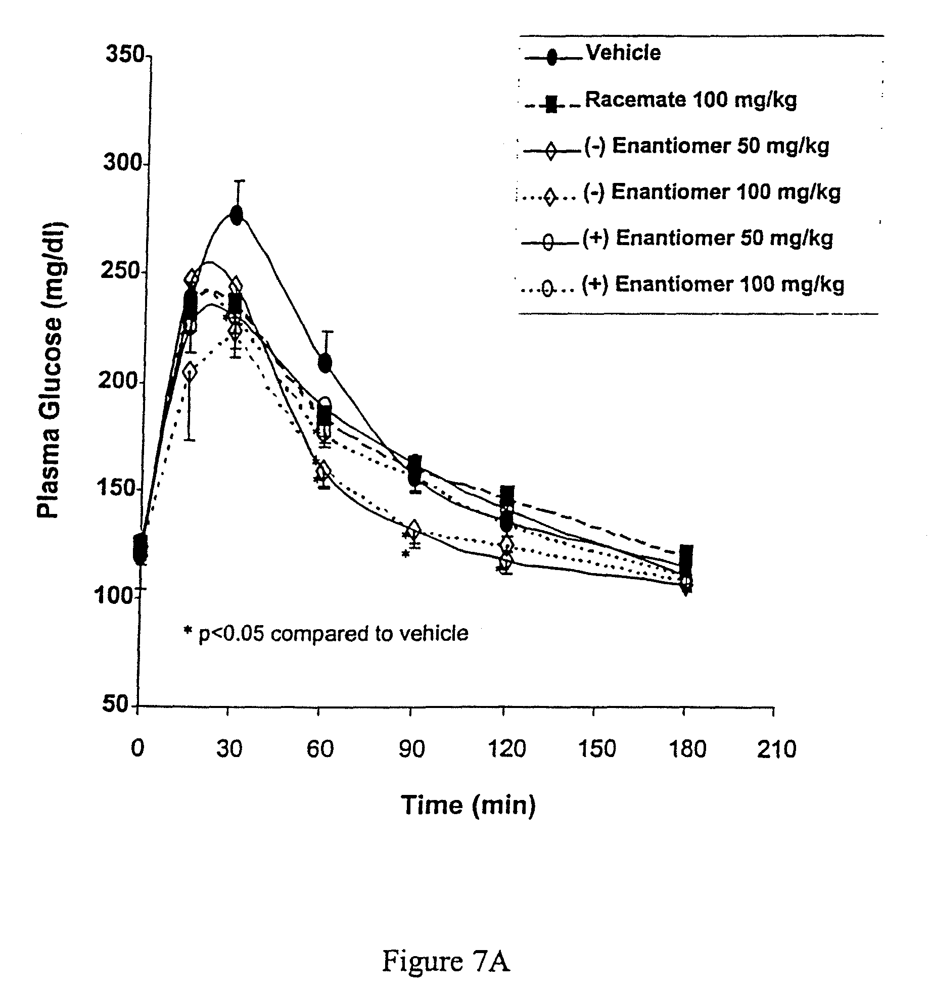 As illustrated in FIG. 7A, Zucker fatty rats with Impaired Glucose Tolerance had lower plasma glucose levels after a glucose challenge following treatment with halofenate. The (−) halofenate was the most effective in lowering the glucose and had an effect that persisted longer than the racemate or (+) enantiomer. FIG. 7B shows the incremental area under the curve (AUC) for all the treatment groups. The animals treated with the (−) halofenate showed significant reductions in the glucose area relative to vehicle-treated controls. Although the AUC was decreased in the groups treated with the racemate or (+) halofenate, the effects were not as great as in the (−) halofenate-treated rats and the differences were not statistically significant.