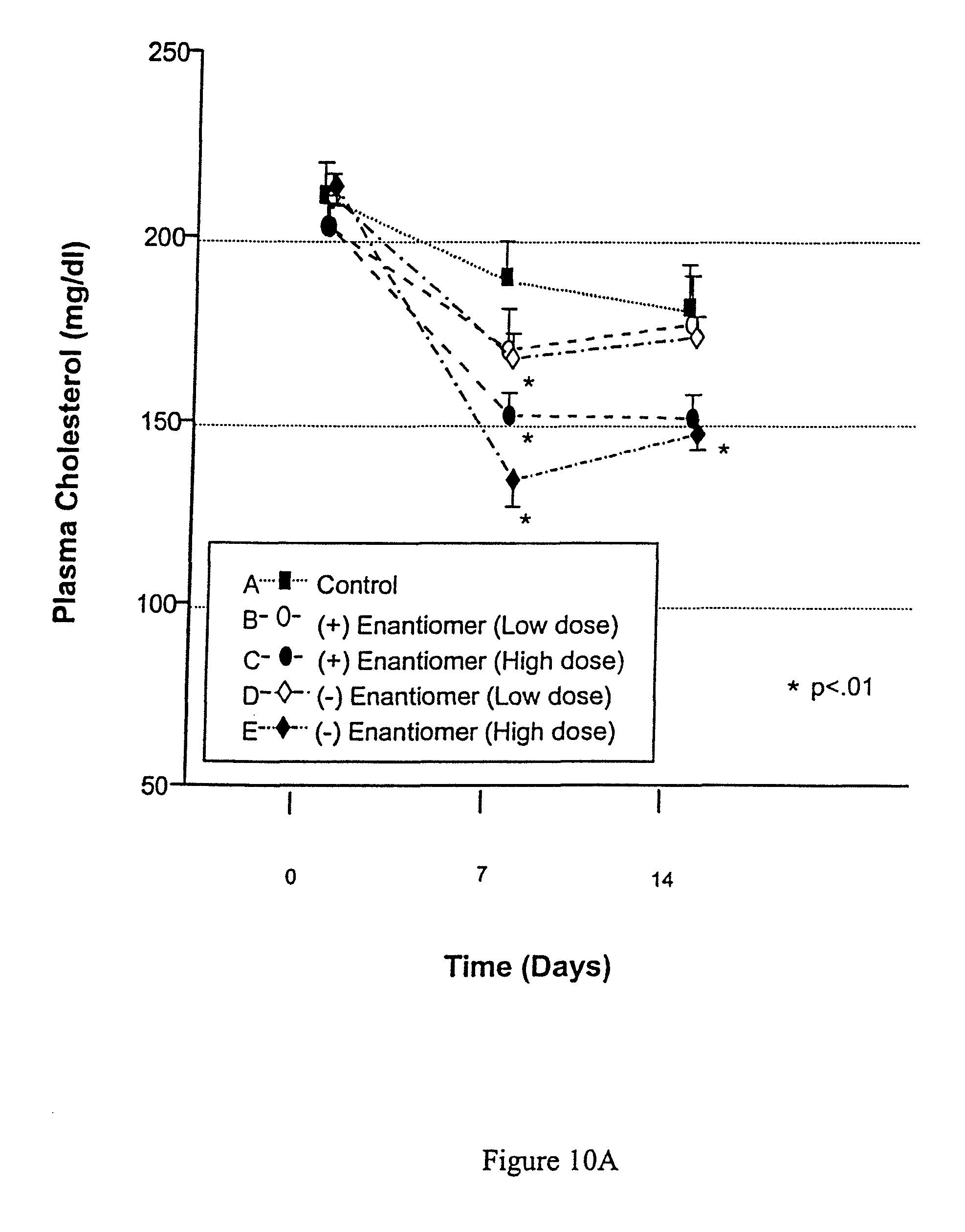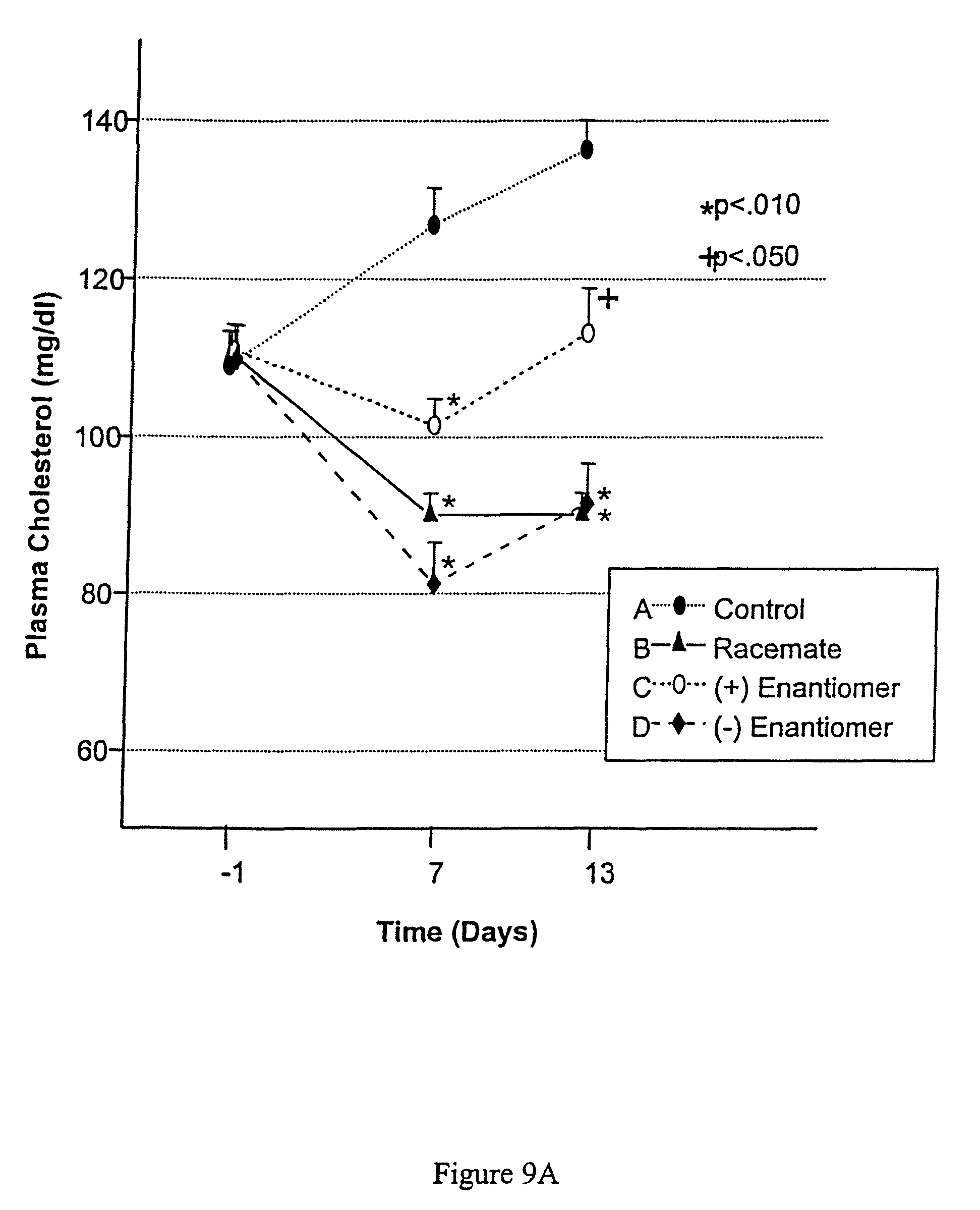 In experiment I animals received a dose of 25 mg/kg/day. As shown in FIG. 9A and FIG. 9B, a significant decrease in plasma cholesterol was noted only in animals treated with the (O)halofenate after 7 and 13 days of treatment. In Experiment II, animals at 107 days of age received daily doses of either 12.5 mg/kg/day or 37.5 mg/kg/day of the (−) and (+) enantiomers of halofenate. As shown in FIG. 10A and FIG. 10B, the plasma cholesterol was significantly lower on the high dose after 7 days but not after 14 days of treatment with the (+) halofenate. In contrast, for the (−) halofenate at the low dose, a significant decrease in cholesterol was observed after 7 days. At the high dose a much greater decline in plasma cholesterol was noted that was apparent both after 7 and 14 days of treatment. As shown in FIG. 11A and FIG. 11B, a significant decrease in plasma triglyceride was also noted 7 days after treatment at the high dose which was of greater magnitude in animals treated with the (−) enantiomer of halofenate.