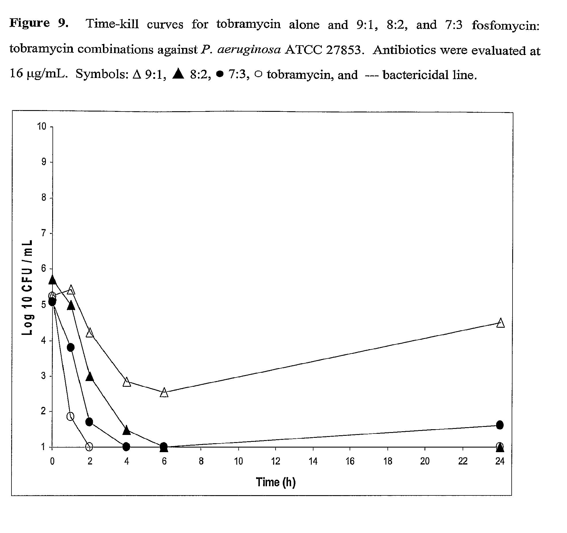 7.9165 g of fosfomycin disodium (6.0007 g of fosfomycin free acid) and 1.5382 g of 97.5% tobramycin base (1.4997 g of pure tobramycin base) were dissolved in 50 mL water. The pH was adjusted to 7.62 by the addition of 2.3 mL of 6 M HCl. The combined solution was diluted to 100 mL. The final pH was 7.64, the osmolality was 1215 mOsmol/kg, the final chloride concentration was 138 mM, and the fosfomycin/tobramycin ratio was 8:2. A fosfomycin solution was prepared by dissolving 5.891 g of fosfomycin disodium (4.465 g of fosfomycin free acid) in water and diluting to 100 mL. The pH was 9.42, and the osmolality was 795 mOsmol/kg. A tobramycin solution was prepared by dissolving 1.869 g of 97.5% tobramycin base (1.822 g of pure tobramycin base) in 60 mL water, adjusting the pH to 4.90 by adding 18.8 mL of 1 M HCl, and diluting to 100 ml with water. The pH was 4.89, and the osmolality was 148 mOsmol/kg. 1 mL of the fosfomycin solution and 1 mL of the tobramycin solution were combined. For the combined drug product solution, the pH was 7.30, the osmolality was 477 mOsmol/kg, the chloride concentration was 94.0 mM, and the fosfomycin/tobramycin ratio was 7:3. 3.1665 g of fosfomycin disodium (FOSFO, 2.4002 g of fosfomycin free acid) was dissolved in two 5 mL (60 mg/mL) ampoules of Tobramycin Solution for Inhalation (TOBI, 600 mg of tobramycin base) plus 40 mL water. The initial pH of the solution was 7.50. To the solution was added 667 μl of 4.5 M NaCl. The combined solution was diluted to 100 mL with water. The final formulation had the following properties; pH 7.49, osmolality 502 mOsmol/kg, chloride concentration 33.8 mM, and the fosfomycin/tobramycin ratio was 8:2, and drug concentration of 24 mg/mL fosfomycin and 6 mg/mL of trobramycin. Examples 5-10 set forth the procedures that have been used to generate the date presented in the Tables and Figures of this application. The efficacy of antibiotics and antibiotic combinations against Gram-positive and Gram-negative bacteria representative of species that cause respiratory infections in patients with cystic fibrosis, bronchiectasis, sinusitis, and ventilator-associated pneumonia were evaluated in MIC assays. Method A: The MICs of fosfomycin alone, tobramycin alone, or combinations of fosfomycin plus tobramycin were determined by the agar-plate dilution method according to NCCLS guidelines (NCCLS, 2003). Bacterial strains were streaked onto Trypic Soy Agar plates (PML Microbiologicals, Wilsonville, Or.) containing 5% defibrinated sheep blood (hereafter referred to as blood agar plates) and incubated overnight at 35° C. Two to three bacterial colonies from the overnight cultures were inoculated into 3 mL of sterile normal saline, vortexed briefly, and adjusted to a 0.5 McFarland standard (NCCLS, 2003). The bacterial suspension was diluted 1:40 in sterile normal saline and served as the inoculum. Mueller-Hinton agar plates (hereafter referred to as MHA) were prepared by combining 16 g of agarose (Becton-Dickinson, Sparks, Md.), 22 g of Mueller-Hinton broth powder (Becton-Dickinson, Sparks, Md.), and adjusted to 1 L with distilled water. The agar was sterilized by autoclaving, cooled to 55° C., and supplemented with 25 μg/mL of glucose-6-phosphate (Sigma-Aldrich, St. Louis, Mo.). Twenty-five mL of cooled agar was aliquoted into 50 mL conical tubes and supplemented with appropriate concentrations of antibiotic to achieve concentrations ranging from 0.06 μg/mL to 512 μg/mL. After gently mixing the agar and antibiotic, the suspension was poured into sterile 100 mm petri dishes and allowed to solidify at room temperature. The antibiotic agar plates were inoculated with approximately 2×104CFU/spot with a 48-point inoculator (Sigma-Aldrich, St. Louis, Mo.). The MIC was defined as the lowest concentration of antibiotic (s) that prevented visible growth after incubation for 18-20 hours at 35° C. The efficacy of a particular antibiotic or antibiotic combination on large populations of Potential interactions between fosfomycin and amikacin, arbekacin, dibekacin, gentamicin, kanamycin B, neomycin, netilimicin, streptomycin, or tobramycin were determined by the checkerboard method (Eliopoulos and Moellering, 1996). Two-fold serial dilutions of fosfomycin and aminoglycosides, which bracketed the expected MIC value for both compounds, were evaluated. Bacterial strains were streaked onto blood agar plates and incubated at 35° C. for 18-24 hours. Two to three bacterial colonies from the overnight cultures were inoculated into 3 mL of sterile normal saline, vortexed briefly, and adjusted to a 0.5 McFarland standard (NCCLS, 2003). Fifty microliters of bacterial inoculum (approximately 2×105CFU/mL) was pipeted into individual wells of 96-well plates containing 50 μl of CAMHB supplemented with 2-fold dilutions of the two antibiotics of interest. The fractional inhibitory concentration (FIC) was calculated as the MIC of compound #1 in combination with a second compound, divided by the MIC of compound #1 alone. A summation of FIC (SFIC) was calculated for each drug combination as the sum of the individual FICs of compound #1 and #2. The FIC was calculated as the lowest concentration of antibiotics that that prevented visible growth after incubation at 18-20 hours at 35° C. Synergy was defined as an SFIC of ≦0.5, indifference as an SFIC>0.5 and <4, and antagonism as an SFIC>4. The lowest SFIC was used for final interpretation of drug interactions. Time-kill experiments were performed in the presence of 2% porcine gastric mucin to evaluate the effect of mucin and protein binding on antibiotic activity. Two to three bacterial colonies were inoculated into 10 mL CAMHB and incubated at 35° C. in a shaking water bath (250 rpm) for 18-24 hours. A 1:40 dilution of the overnight culture was made in 10 mL of fresh CAMHB and incubated at 35° C. in a shaking water bath (250 rpm) for 1-2 hours. The resulting culture was adjusted to a 0.5 McFarland standard (NCCLS, 20