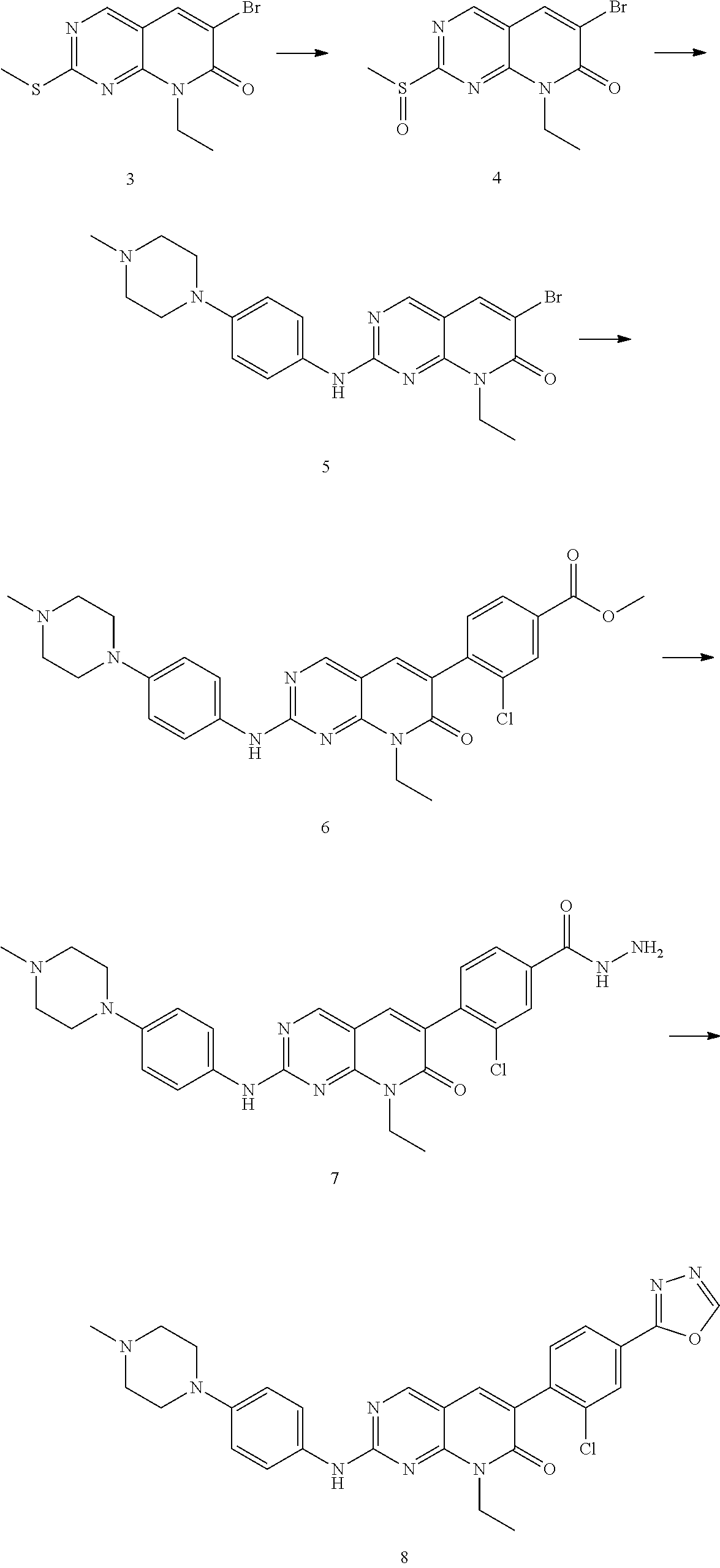 Synthesis of 6-(2-chloro-4-[1,3,4]oxadiazol-2-yl-phenyl)-8-ethyl-2-[4-(4-methyl-piperazin-1-yl)-phenylamino]-8H-pyrido[2,3-d]pyrimidin-7-one (8)