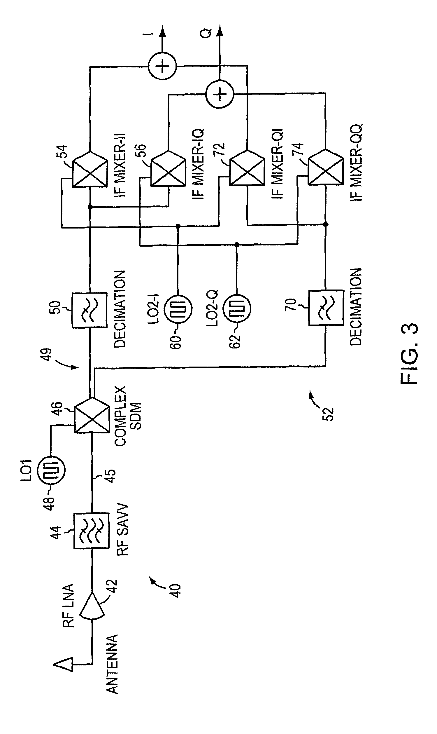 FIG. 3 illustrates schematically a heterodyne receiver 40 including a quadrature SDM 46 used to down-convert a plurality of I and Q signals using a complex noise shaping loop. Receiver 40 receives the modulated RF signal that is amplified by a low noise amplifier (LNA) 42 and provided to an optional band pass filter 44 (for example, a surface acoustic wave filter, SAW) to attenuate unwanted out of band signals. A quadrature SDM 46 receives the filtered modulated RF signal and provides quantized I and Q signals, at an intermediate frequency, having a high sample rate of 2.376 GHz and a low bit depth of 6 levels (2.5 bits). The linearity of the feedback DAC within the SDM ADC typically limits system linearity so correction methods can be used.