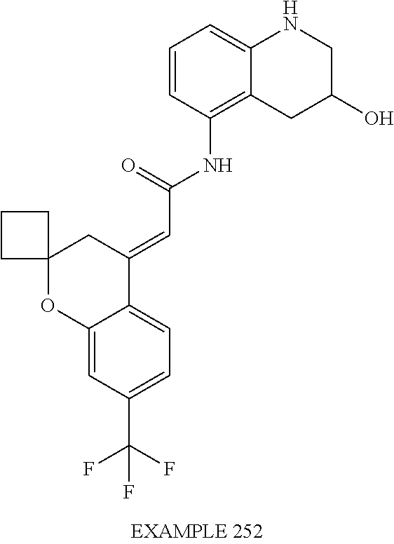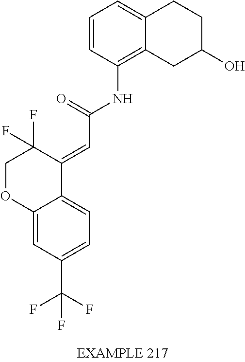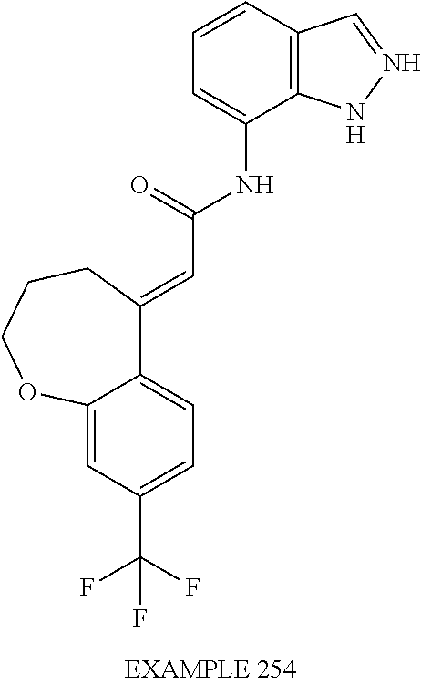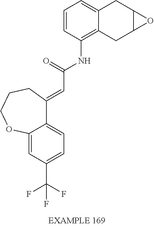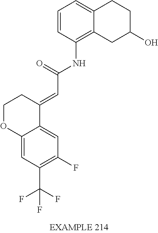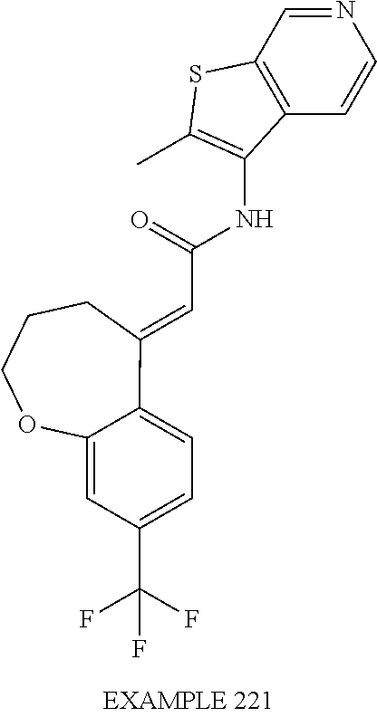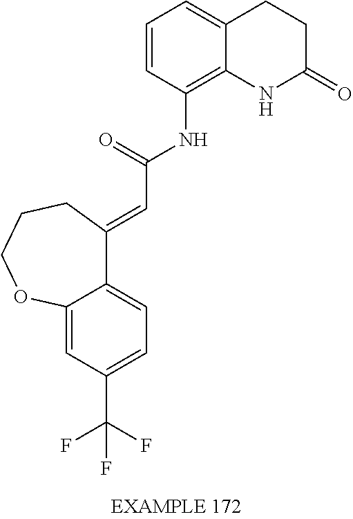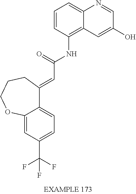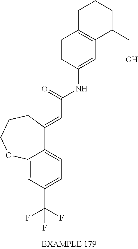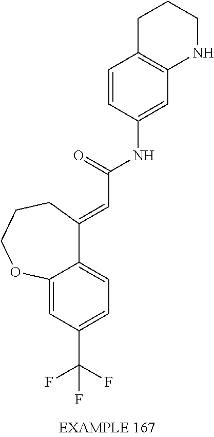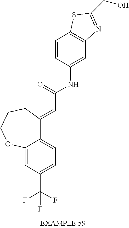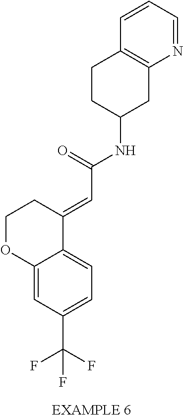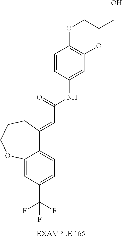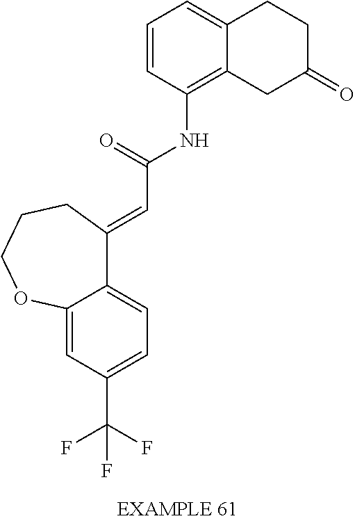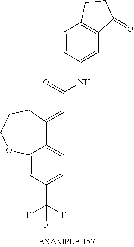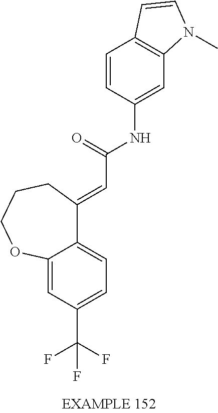 (E)-2-(chroman-4-ylidene)-N-(2,3-dihydrobenzo[b][1,4]dioxin-6-yl)acetamide; (E)-2-(chroman-4-ylidene)-N-(isoquinolin-5-yl)acetamide; (E)-2-(7-tert-butyl-chroman-4-ylidene)-N-(5,6,7,8-tetrahydroquinolin-7-yl)acetamide; (E)-2-(7-tert-butyl-chroman-4-ylidene)-N-(isoquinolin-5-yl)acetamide; (E)-2-(7-tert-butyl-chroman-4-ylidene)-N-(quinolin-7-yl)acetamide; (E)-2-(7-(trifluoromethyl)chroman-4-ylidene)-N-(5,6,7,8-tetrahydro-quinolin-7-yl)-acetamide; (E)-2-(7-(trifluoromethyl)chroman-4-ylidene)-N-(isoquinolin-5-yl)-acetamide; (E)-2-(7-(trifluoromethyl)chroman-4-ylidene)-N-(quinolin-7-yl)-acetamide; (E)-2-(8-trifluoromethyl-3,4-dihydrobenzo[b]oxepin-5(2H)-ylidene)-N-(2,3-dihydrobenzo[b][1,4]dioxin-6-yl)acetamide; (E)-2-(8-trifluoromethyl-3,4-dihydrobenzo[b]oxepin-5(2H)-ylidene)-N-(5,6,7,8-tetrahydroquinolin-7-yl)acetamide; (E)-2-(8-trifluoromethyl-3,4-dihydrobenzo[b]oxepin-5(2H)-ylidene)-N-(isoquinolin-5-yl)acetamide; (E)-2-(8-trifluoromethyl-3,4-dihydrobenzo[b]oxepin-5(2H)-ylidene)-N-(quinoxalin-6-yl)acetamide; (E)-2-(8-trifluoromethyl-3,4-dihydrobenzo[b]oxepin-5(2H)-ylidene)-N-(quinolin-7-yl)acetamide; (E)-2-(8-trifluoromethyl-3,4-dihydrobenzo[b]oxepin-5(2H)-ylidene)-N-(1,2,3,4-tetrahydro-1-methylquinolin-7-yl)acetamide; (E)-2-(8-trifluoromethyl-3,4-dihydrobenzo[b]oxepin-5(2H)-ylidene)-N-(2-methyl-1,3-benzothiazolo-5-yl)acetamide; (E)-2-(8-trifluoromethyl-3,4-dihydrobenzo[b]oxepin-5(2H)-ylidene)-N-(2-morpholinopyridin-3-yl)acetamide; (E)-2-(8-trifluoromethyl-3,4-dihydrobenzo[b]oxepin-5(2H)-ylidene)-N-(4-methyl-2-oxo-2H-chromen-7-yl)acetamide; (E)-2-(8-trifluoromethyl-3,4-dihydrobenzo[b]oxepin-5(2H)-ylidene)-N-(6-phenoxypyridin-3-yl)acetamide; (E)-2-(8-trifluoromethyl-3,4-dihydrobenzo[b]oxepin-5(2H)-ylidene)-N-(1,3-dihydro-1-oxoisobenzofuran-6-yl)acetamide; (E)-2-(8-trifluoromethyl-3,4-dihydrobenzo[b]oxepin-5(2H)-ylidene)-N-(1-(pyridin-2-yl)ethyl)acetamide; (E)-2-(8-trifluoromethyl-3,4-dihydrobenzo[b]oxepin-5(2H)-ylidene)-N-(phenyl(pyridin-2-yl)methyl)acetamide; (E)-2-(8-trifluoromethyl-3,4-dihydrobenzo[b]oxepin-5(2H)-ylidene)-N-((2,3-dihydrobenzo[b][1,4]dioxin-6-yl)methyl)acetamide; (E)-2-(8-trifluoromethyl-3,4-dihydrobenzo[b]oxepin-5(2H)-ylidene)-N-(1-(2,3-dihydrobenzo[b][1,4]dioxin-6-yl)ethyl)acetamide; (E)-2-(8-trifluoromethyl-3,4-dihydrobenzo[b]oxepin-5(2H)-ylidene)-N-((2,3-dihydrobenzo[b][1,4]dioxin-2-yl)methyl)acetamide; (E)-2-(8-trifluoromethyl-3,4-dihydrobenzo[b]oxepin-5(2H)-ylidene)-N-((2,3-dihydrobenzofuran-5-yl)methyl)acetamide; (E)-N-((2-(4-chlorophenyl)-4-methylthiazol-5-yl)methyl)-2-(8-trifluoromethyl-3,4-dihydrobenzo[b]oxepin-5(2H)-ylidene)acetamide; (2E)-N-([1,2,4]triazolo[4,3-a]pyridin-3-yl)methyl)-2-(8-trifluoromethyl-3,4-dihydrobenzo[b]oxepin-5(2H)-ylidene)acetamide; (E)-2-(8-trifluoromethyl-3,4-dihydrobenzo[b]oxepin-5(2H)-ylidene)-N-(1-methyl-1H-pyrazolo[3,4-b]pyridin-3-yl)acetamide; (E)-2-(8-trifluoromethyl-3,4-dihydrobenzo[b]oxepin-5(2H)-ylidene)-N-(1H-indazol-3-yl)acetamide; (E)-N-(1-ethyl-1H-benzo[d]imidazolo-2-yl)-2-(8-trifluoromethyl-3,4-dihydrobenzo[b]oxepin-5(2H)-ylidene)acetamide; (2E)-N-([1,2,4]triazolo[1,5-a]pyrimidin-7-yl)-2-(8-trifluoromethyl-3,4-dihydrobenzo[b]oxepin-5(2H)-ylidene)acetamide; (E)-2-(8-trifluoromethyl-3,4-dihydrobenzo[b]oxepin-5(2H)-ylidene)-N-(6,7,8,9-tetrahydro-5H-cyclohepta[b]pyridin-8-yl)acetamide; (E)-N-(1-tert-butyl-3-methyl-1H-pyrazolo-5-yl)-2-(8-trifluoromethyl-3,4-dihydrobenzo[b]oxepin-5(2H)-ylidene)acetamide; (E)-2-(8-trifluoromethyl-3,4-dihydrobenzo[b]oxepin-5(2H)-ylidene)-N-(4-phenylthiazolo-2-yl)acetamide; (E)-2-(8-trifluoromethyl-3,4-dihydrobenzo[b]oxepin-5(2H)-ylidene)-N-(2-hydroxymethyl-1,3-benzothiazolo-5-yl)acetamide; (E)-2-(8-trifluoromethyl-3,4-dihydrobenzo[b]oxepin-5(2H)-ylidene)-N-(3-hydroxy-2-oxo-1,2,3,4-tetrahydroquinolin-5-yl)acetamide; (E)-2-(8-trifluoromethyl-3,4-dihydrobenzo[b]oxepin-5(2H)-ylidene)-N-(3-hydroxy-1,2,3,4-tetrahydroquinolin-5-yl)acetamide; (E)-2-(8-trifluoromethyl-3,4-dihydrobenzo[b]oxepin-5(2H)-ylidene)-N-(1-methyl-3-hydroxy-1,2,3,4-tetrahydroquinolin-5-yl)acetamide; (E)-N-(3-hydroxy-2-oxo-1,2,3,4-tetrahydroquinolin-5-yl)-2-(7-trifluoromethyl-chroman-4-ylidene)acetamide; (E)-N-(3-hydroxy-1,2,3,4-tetrahydroquinolin-5-yl)-2-(7-trifluoromethyl-chroman-4-ylidene)acetamide; (E)-N-(3-hydroxy-chroman-5-yl)-2-(7-trifluoromethyl-chroman-4-ylidene)acetamide; (E)-2-(8-trifluoromethyl-3,4-dihydrobenzo[b]oxepin-5(2H)-ylidene)-N-(quinolin-7-yl)acetamide methanesulfonate; (E)-2-(8-trifluoromethyl-3,4-dihydrobenzo[b]oxepin-5(2H)-ylidene)-N-(1-(2-methoxyethyl)-1,2,3,4-tetrahydroquinolin-7-yl)acetamide; (E)-2-(8-trifluoromethyl-3,4-dihydrobenzo[b]oxepin-5(2H)-ylidene)-N-(3,4-dihydro-1H-quinolin-2-on-7-yl)acetamide; (E)-2-(8-trifluoromethyl-3,4-dihydrobenzo[b]oxepin-5(2H)-ylidene)-N-(2-quinolon-7-yl)acetamide; (E)-2-(8-trifluoromethyl-3,4-dihydrobenzo[b]oxepin-5(2H)-ylidene)-N-(indol-6-yl)acetamide; (E)-2-(8-trifluoromethyl-3,4-dihydrobenzo[b]oxepin-5(2H)-ylidene)-N-(indol-5-yl)acetamide; (E)-2-(8-trifluoromethyl-3,4-dihydrobenzo[b]oxepin-5(2H)-ylidene)-N-(3,4-dihydro-2H-benzo[b]dioxepin-7-yl)acetamide; (E)-2-(8-trifluoromethyl-3,4-dihydrobenzo[b]oxepin-5(2H)-ylidene)-N-(2,2-difluoro-1,3-benzodioxol-5-yl)acetamide; (E)-2-(8-trifluoromethyl-3,4-dihydrobenzo[b]oxepin-5(2H)-ylidene)-N-(1,3-benzodioxol-5-yl)acetamide; (E)-2-(8-trifluoromethyl-3,4-dihydrobenzo[b]oxepin-5(2H)-ylidene)-N-(1-methylindol-5-yl)acetamide; (E)-2-(8-trifluoromethyl-3,4-dihydrobenzo[b]oxepin-5(2H)-ylidene)-N-(1-(2-hydroxyethyl)indol-6-yl)acetamide; (E)-2-(8-trifluoromethyl-3,4-dihydrobenzo[b]oxepin-5(2H)-ylidene)-N-(1-methylindol-6-yl)acetamide; (E)-2-(8-trifluoromethyl-3,4-dihydrobenzo[b]oxepin-5(2H)-ylidene)-N-(1-(2-hydroxyethyl)indol-5-yl)acetamide; (E)-2-(8-trifluoromethyl-3,4-dihydrobenzo[b]oxepin-5(2H)-ylidene)-N-(3-hydroxymethyl-2,3-dihydro-1,4-benzodioxin-6-yl)acetamide; (E)-2-(8-trifluoromethyl-3,4-dihydrobenzo[b]oxepin-5(2H)-ylidene)-N-(2,3-dihydro-isoindol-1-on-6-yl)acetamide; (E)-2-(8-trifluoromethyl-3,4-dihydrobenzo[b]oxepin-5(2H)-ylidene)