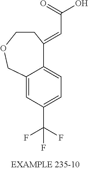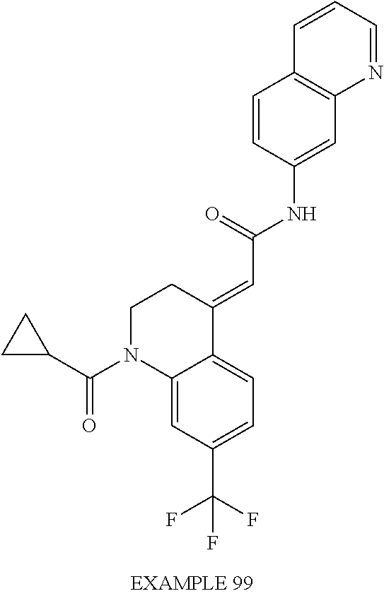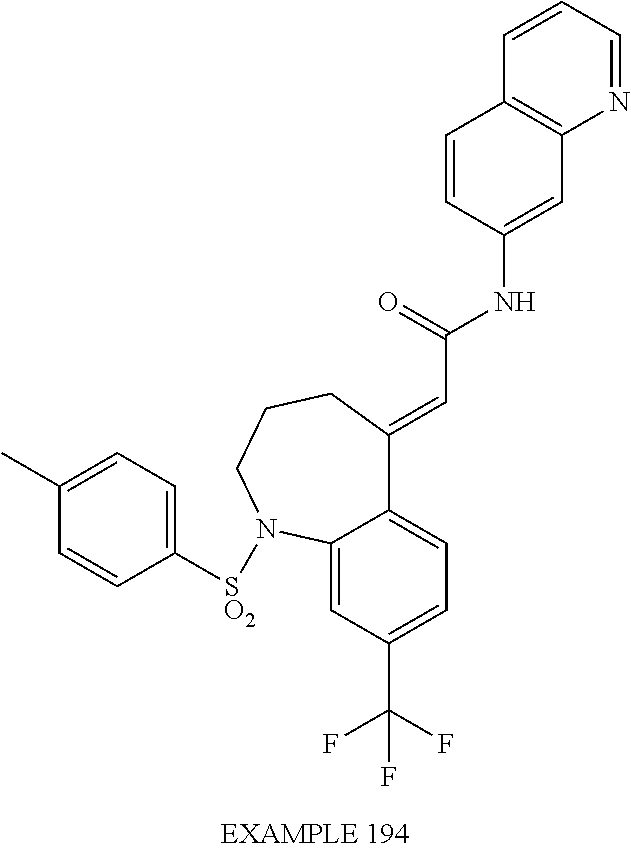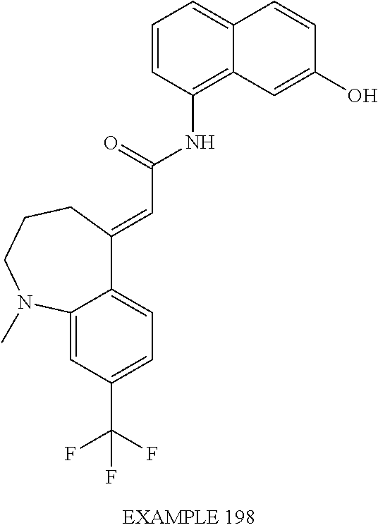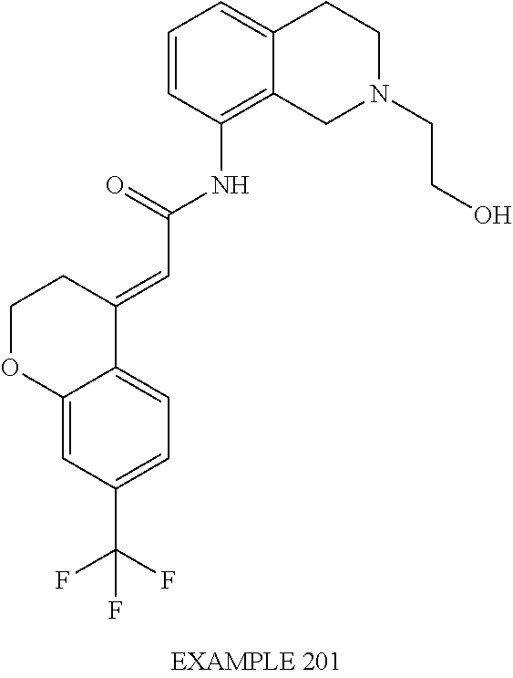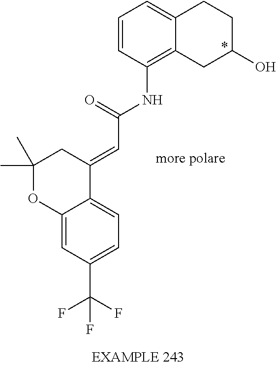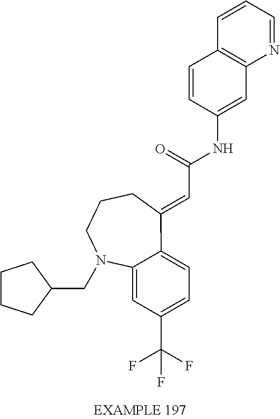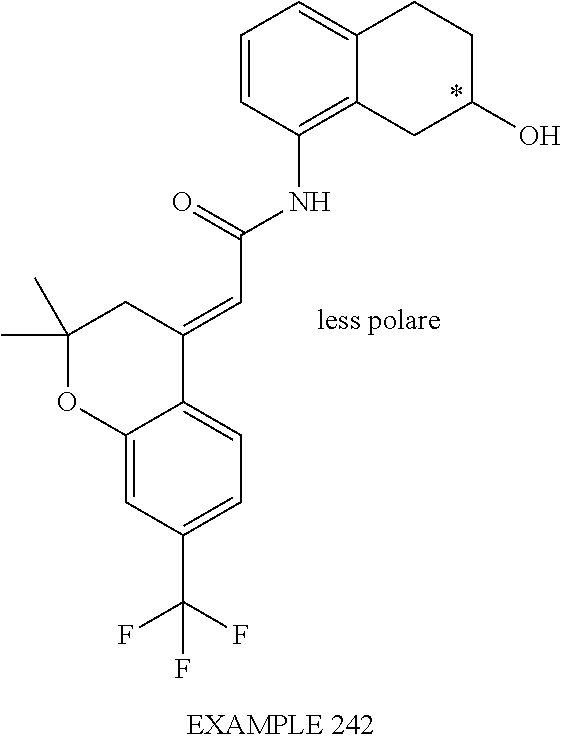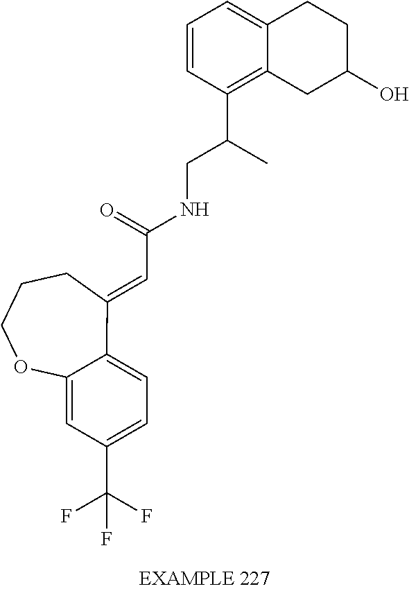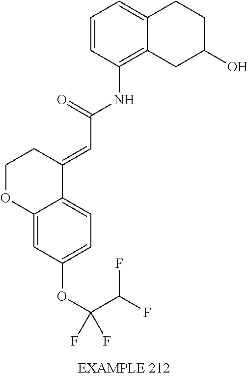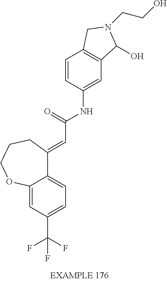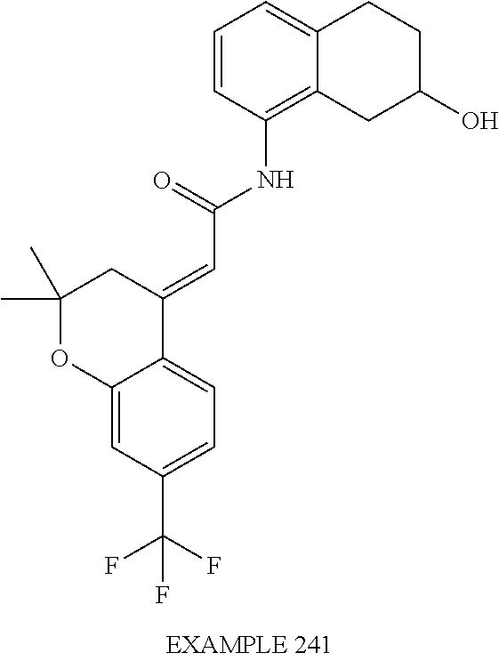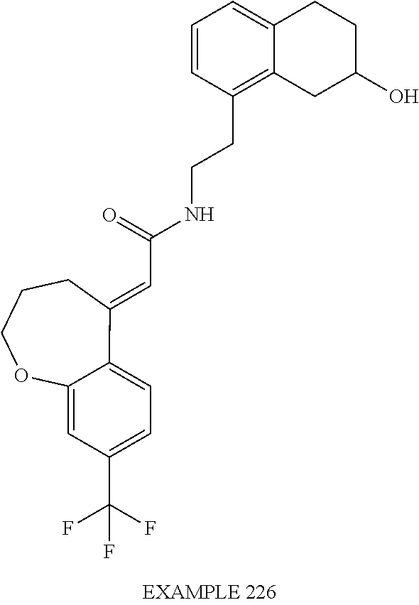 (E)-2-(chroman-4-ylidene)-N-(2,3-dihydrobenzo[b][1,4]dioxin-6-yl)acetamide; (E)-2-(chroman-4-ylidene)-N-(isoquinolin-5-yl)acetamide; (E)-2-(7-tert-butyl-chroman-4-ylidene)-N-(5,6,7,8-tetrahydroquinolin-7-yl)acetamide; (E)-2-(7-tert-butyl-chroman-4-ylidene)-N-(isoquinolin-5-yl)acetamide; (E)-2-(7-tert-butyl-chroman-4-ylidene)-N-(quinolin-7-yl)acetamide; (E)-2-(7-(trifluoromethyl)chroman-4-ylidene)-N-(5,6,7,8-tetrahydro-quinolin-7-yl)-acetamide; (E)-2-(7-(trifluoromethyl)chroman-4-ylidene)-N-(isoquinolin-5-yl)-acetamide; (E)-2-(7-(trifluoromethyl)chroman-4-ylidene)-N-(quinolin-7-yl)-acetamide; (E)-2-(8-trifluoromethyl-3,4-dihydrobenzo[b]oxepin-5(2H)-ylidene)-N-(2,3-dihydrobenzo[b][1,4]dioxin-6-yl)acetamide; (E)-2-(8-trifluoromethyl-3,4-dihydrobenzo[b]oxepin-5(2H)-ylidene)-N-(5,6,7,8-tetrahydroquinolin-7-yl)acetamide; (E)-2-(8-trifluoromethyl-3,4-dihydrobenzo[b]oxepin-5(2H)-ylidene)-N-(isoquinolin-5-yl)acetamide; (E)-2-(8-trifluoromethyl-3,4-dihydrobenzo[b]oxepin-5(2H)-ylidene)-N-(quinoxalin-6-yl)acetamide; (E)-2-(8-trifluoromethyl-3,4-dihydrobenzo[b]oxepin-5(2H)-ylidene)-N-(quinolin-7-yl)acetamide; (E)-2-(8-trifluoromethyl-3,4-dihydrobenzo[b]oxepin-5(2H)-ylidene)-N-(1,2,3,4-tetrahydro-1-methylquinolin-7-yl)acetamide; (E)-2-(8-trifluoromethyl-3,4-dihydrobenzo[b]oxepin-5(2H)-ylidene)-N-(2-methyl-1,3-benzothiazolo-5-yl)acetamide; (E)-2-(8-trifluoromethyl-3,4-dihydrobenzo[b]oxepin-5(2H)-ylidene)-N-(2-morpholinopyridin-3-yl)acetamide; (E)-2-(8-trifluoromethyl-3,4-dihydrobenzo[b]oxepin-5(2H)-ylidene)-N-(4-methyl-2-oxo-2H-chromen-7-yl)acetamide; (E)-2-(8-trifluoromethyl-3,4-dihydrobenzo[b]oxepin-5(2H)-ylidene)-N-(6-phenoxypyridin-3-yl)acetamide; (E)-2-(8-trifluoromethyl-3,4-dihydrobenzo[b]oxepin-5(2H)-ylidene)-N-(1,3-dihydro-1-oxoisobenzofuran-6-yl)acetamide; (E)-2-(8-trifluoromethyl-3,4-dihydrobenzo[b]oxepin-5(2H)-ylidene)-N-(1-(pyridin-2-yl)ethyl)acetamide; (E)-2-(8-trifluoromethyl-3,4-dihydrobenzo[b]oxepin-5(2H)-ylidene)-N-(phenyl(pyridin-2-yl)methyl)acetamide; (E)-2-(8-trifluoromethyl-3,4-dihydrobenzo[b]oxepin-5(2H)-ylidene)-N-((2,3-dihydrobenzo[b][1,4]dioxin-6-yl)methyl)acetamide; (E)-2-(8-trifluoromethyl-3,4-dihydrobenzo[b]oxepin-5(2H)-ylidene)-N-(1-(2,3-dihydrobenzo[b][1,4]dioxin-6-yl)ethyl)acetamide; (E)-2-(8-trifluoromethyl-3,4-dihydrobenzo[b]oxepin-5(2H)-ylidene)-N-((2,3-dihydrobenzo[b][1,4]dioxin-2-yl)methyl)acetamide; (E)-2-(8-trifluoromethyl-3,4-dihydrobenzo[b]oxepin-5(2H)-ylidene)-N-((2,3-dihydrobenzofuran-5-yl)methyl)acetamide; (E)-N-((2-(4-chlorophenyl)-4-methylthiazol-5-yl)methyl)-2-(8-trifluoromethyl-3,4-dihydrobenzo[b]oxepin-5(2H)-ylidene)acetamide; (2E)-N-([1,2,4]triazolo[4,3-a]pyridin-3-yl)methyl)-2-(8-trifluoromethyl-3,4-dihydrobenzo[b]oxepin-5(2H)-ylidene)acetamide; (E)-2-(8-trifluoromethyl-3,4-dihydrobenzo[b]oxepin-5(2H)-ylidene)-N-(1-methyl-1H-pyrazolo[3,4-b]pyridin-3-yl)acetamide; (E)-2-(8-trifluoromethyl-3,4-dihydrobenzo[b]oxepin-5(2H)-ylidene)-N-(1H-indazol-3-yl)acetamide; (E)-N-(1-ethyl-1H-benzo[d]imidazolo-2-yl)-2-(8-trifluoromethyl-3,4-dihydrobenzo[b]oxepin-5(2H)-ylidene)acetamide; (2E)-N-([1,2,4]triazolo[1,5-a]pyrimidin-7-yl)-2-(8-trifluoromethyl-3,4-dihydrobenzo[b]oxepin-5(2H)-ylidene)acetamide; (E)-2-(8-trifluoromethyl-3,4-dihydrobenzo[b]oxepin-5(2H)-ylidene)-N-(6,7,8,9-tetrahydro-5H-cyclohepta[b]pyridin-8-yl)acetamide; (E)-N-(1-tert-butyl-3-methyl-1H-pyrazolo-5-yl)-2-(8-trifluoromethyl-3,4-dihydrobenzo[b]oxepin-5(2H)-ylidene)acetamide; (E)-2-(8-trifluoromethyl-3,4-dihydrobenzo[b]oxepin-5(2H)-ylidene)-N-(4-phenylthiazolo-2-yl)acetamide; (E)-2-(8-trifluoromethyl-3,4-dihydrobenzo[b]oxepin-5(2H)-ylidene)-N-(2-hydroxymethyl-1,3-benzothiazolo-5-yl)acetamide; (E)-2-(8-trifluoromethyl-3,4-dihydrobenzo[b]oxepin-5(2H)-ylidene)-N-(3-hydroxy-2-oxo-1,2,3,4-tetrahydroquinolin-5-yl)acetamide; (E)-2-(8-trifluoromethyl-3,4-dihydrobenzo[b]oxepin-5(2H)-ylidene)-N-(3-hydroxy-1,2,3,4-tetrahydroquinolin-5-yl)acetamide; (E)-2-(8-trifluoromethyl-3,4-dihydrobenzo[b]oxepin-5(2H)-ylidene)-N-(1-methyl-3-hydroxy-1,2,3,4-tetrahydroquinolin-5-yl)acetamide; (E)-N-(3-hydroxy-2-oxo-1,2,3,4-tetrahydroquinolin-5-yl)-2-(7-trifluoromethyl-chroman-4-ylidene)acetamide; (E)-N-(3-hydroxy-1,2,3,4-tetrahydroquinolin-5-yl)-2-(7-trifluoromethyl-chroman-4-ylidene)acetamide; (E)-N-(3-hydroxy-chroman-5-yl)-2-(7-trifluoromethyl-chroman-4-ylidene)acetamide; (E)-2-(8-trifluoromethyl-3,4-dihydrobenzo[b]oxepin-5(2H)-ylidene)-N-(quinolin-7-yl)acetamide methanesulfonate; (E)-2-(8-trifluoromethyl-3,4-dihydrobenzo[b]oxepin-5(2H)-ylidene)-N-(1-(2-methoxyethyl)-1,2,3,4-tetrahydroquinolin-7-yl)acetamide; (E)-2-(8-trifluoromethyl-3,4-dihydrobenzo[b]oxepin-5(2H)-ylidene)-N-(3,4-dihydro-1H-quinolin-2-on-7-yl)acetamide; (E)-2-(8-trifluoromethyl-3,4-dihydrobenzo[b]oxepin-5(2H)-ylidene)-N-(2-quinolon-7-yl)acetamide; (E)-2-(8-trifluoromethyl-3,4-dihydrobenzo[b]oxepin-5(2H)-ylidene)-N-(indol-6-yl)acetamide; (E)-2-(8-trifluoromethyl-3,4-dihydrobenzo[b]oxepin-5(2H)-ylidene)-N-(indol-5-yl)acetamide; (E)-2-(8-trifluoromethyl-3,4-dihydrobenzo[b]oxepin-5(2H)-ylidene)-N-(3,4-dihydro-2H-benzo[b]dioxepin-7-yl)acetamide; (E)-2-(8-trifluoromethyl-3,4-dihydrobenzo[b]oxepin-5(2H)-ylidene)-N-(2,2-difluoro-1,3-benzodioxol-5-yl)acetamide; (E)-2-(8-trifluoromethyl-3,4-dihydrobenzo[b]oxepin-5(2H)-ylidene)-N-(1,3-benzodioxol-5-yl)acetamide; (E)-2-(8-trifluoromethyl-3,4-dihydrobenzo[b]oxepin-5(2H)-ylidene)-N-(1-methylindol-5-yl)acetamide; (E)-2-(8-trifluoromethyl-3,4-dihydrobenzo[b]oxepin-5(2H)-ylidene)-N-(1-(2-hydroxyethyl)indol-6-yl)acetamide; (E)-2-(8-trifluoromethyl-3,4-dihydrobenzo[b]oxepin-5(2H)-ylidene)-N-(1-methylindol-6-yl)acetamide; (E)-2-(8-trifluoromethyl-3,4-dihydrobenzo[b]oxepin-5(2H)-ylidene)-N-(1-(2-hydroxyethyl)indol-5-yl)acetamide; (E)-2-(8-trifluoromethyl-3,4-dihydrobenzo[b]oxepin-5(2H)-ylidene)-N-(3-hydroxymethyl-2,3-dihydro-1,4-benzodioxin-6-yl)acetamide; (E)-2-(8-trifluoromethyl-3,4-dihydrobenzo[b]oxepin-5(2H)-ylidene)-N-(2,3-dihydro-isoindol-1-on-6-yl)acetamide; (E)-2-(8-trifluoromethyl-3,4-dihydrobenzo[b]oxepin-5(2H)-ylidene)