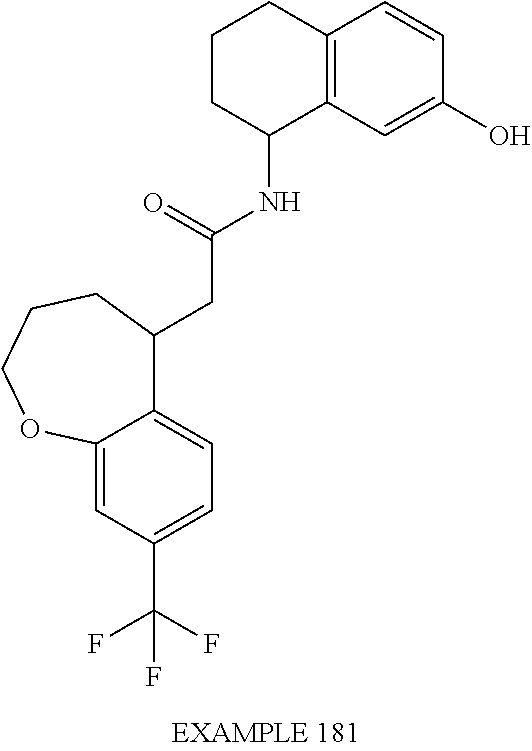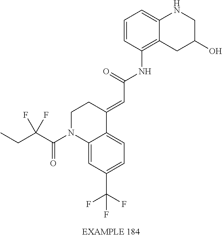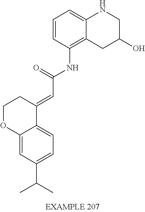 1 B 2 B 3 A 4 A 5 A 6 A 7 A 8 A 9 A 10 A 11 A 12 A 13 A 14 A 15 B 16 A 17 A 18 A 19 A 20 B 21 B 22 B 23 A 24 A 25 B 26 B 27 B 28 B 29 B 30 B 31 B 32 B 33 B 34 B 35 B 36 B 37 B 38 B 39 B 40 B 41 B 42 B 43 B 44 B 45 B 46 B 47 B 48 A 49 B 50 A 51 A 52 A 53 A 54 A 55 A 56 A 57 A 58 A 59 A 60 A 61 A 62 A 63 A 64 A 65 A 66 A 67 A 68 A 69 A 70 A 71 A 72 A 73 A 74 A 75 A 76 A 77 A 78 A 79 A 80 A 81 A 82 A 83 A 84 A 85 A 86 A 87 A 88 A 89 A 90 A 91 A 92 A 93 A 94 A 95 A 96 A 97 A 98 A 99 A 100 A 101 A 102 A 105 A 106 A 107 A 108 A 109 A 110 A 111 A 112 B 113 A 114 A 115 A 116 A 117 A 118 A 119 A 120 A 121 A 122 A 125 A 126 A 127 A 128 A 129 B 130 A 133 A 134 A 135 A 136 A 137 A 138 A 142 A 143 B 144 A 149 A 150 A 151 A 152 A 157 A 160 A 161 B 163 A 164 A 165 A 166 A 167 A 169 A 174 A 175 A 176 B 178 A 179 A 183 A 184 A 185 A 190 A 191 A 192 A 193 A 194 B 195 B 196 A 197 A 198 A 199 A 200 A 202 A 204 A 206 A 207 A 208 A 209 A 210 A 211 A 212 A 213 A 214 A 215 A 216 A 218 A 219 A 220 A 221 A 224 B 226 A 227 A 229 B 231 B 233 A 234 A 235 A 236 A 237 A 238 A 239 A 240 A 241 A 242 A 243 A 244 A 245 A 246 A 247 A 248 A 251 A 252 A 253 A 254 A 1A 324 7.52 2A 317 5.22 3A 377 5.42 4A 373 7.89 5A 373 7.49 6A 389 4.84 7A 385 7.21 8A 385 6.94 9B 406 5.51 10A 403 5.16 11A 399 7.68 12B 400 5.03 13A 399 7.38 14B 404 6.50 15B 416 6.26 16B 378 5.65 17B 417 6.05 18B 414 5.25 19B 419 5.45 20A 434 8.47 21B 430 5.59 22B 441 5.85 23B 416 5.63 24B 404 5.21 25B 461 4.86 26A 497 9.00 27B 509 5.69 28A 476 9.88 29A 439 7.50 30B 377 4.60 31B 439 5.53 32B 420 5.27 33B 434 5.43 34B 420 5.57 35B 404 5.37 36B 447 5.43 37B 446 5.35 38B 428 5.25 39B 493 6.16 40B 403 4.18 41B 403 5.13 42B 388 5.09 43B 416 5.63 44B 390 4.77 45B 419 5.47 46B 352 5.31 (M-55) 47B 431 6.22 48A 426 5.40 49A 388 4.26 50A 468 7.35 51A 482 7.71 52A 494 8.00 53A 496 5.77 54A 488 6.94 55A 489 5.38 56A 498 7.44 57A 494 9.11 58A 461 5.92 59B 435 4.77 60B 392 5.02 61B 416 5.17 62B 418 4.87 63B 418 4.87 64B 418 4.89 65A 434 7.17 66A 434 7.00 67A 433 4.36 68A 419 4.50 69B 433 4.88 70A 404 7.88 71 404 4.73 72 404 4.73 73A 480 4.77 74B 483 8.67 75B 466 4.46 76B 482 4.84 77B 468 4.56 78B 482 4.93 79B 482 4.87 80B 482 4.85 81B 496 5.25 82A 499 8.43 83B 487 5.05 84 485 4.85 85 549 4.90 86 501 5.11 87 487 4.81 88 517 4.68 89 485 4.85 90 499 4.89 91 527 4.80 92 513 4.64 93 541 5.01 94 521 4.78 95 509 5.07 96 491 4.77 97 466 5.83 98 538 7.87 99 452 4.16 100 470 3.80 101 498 3.96 102 494 5.04 103 497 4.78 104 481 3.17 105 471 4.48 106 403 4.34 107 502 4.38 108 488 4.44 109 499 4.99 110 581 5.23 111 497 4.38 112 487 4.08 113 552 4.42 114 431 4.38 115 517 5.27 116 509 4.58 117 523 4.77 118 521 4.74 119 402 4.91 120 400 4.97 121 419 4.12 122 405 4.26 123 417 4.72 124 417 4.70 125 406 4.50 126 414 5.21 127 399 7.40 128 414 5.25 129 428 5.97 130 461 5.95 131 516 3.41 132 474 3.05 133 417 4.68 134 415 4.50 135 446 6.28 136 450 6.49 137 387 5.27 138 387 5.15 139 426 5.18 140 426 5.20 141 417 6.17 142 420 5.65 143 428 6.25 144 392 5.41 145 403 4.56 146 419 4.72 147 410 5.77 148 406 5.31 149 401 5.57 150 414 5.33 151 431 4.94 152 401 5.47 153 487 5.95 154 503 5.25 155 499 5.93 156 415 5.48 (M−) 157 402 5.23 158 402 5.21 159 417 7.80 160 404 8.17 161 446 9.38 162 446 9.31 163 404 8.13 164 431 8.27 165 436 4.81 166 403 4.40 167 403 5.33 168 461 4.91 169 416 8.59 170 445 4.10 171 415 4.50 172 417 4.72 173 415 4.64 174 416 5.46 (M−) 175 404 4.91 176 447 4.23 177 417 4.46 178 431 5.05 179 432 5.25 180 415 3.63 181 418 5.07 182 557 5.59 183 420 4.66 184 510 4.62 185 524 4.46 186 431 4.52 187 389 2.67 188 408 4.83 189 407 4.08 190 501 7.83 191 398 6.60 192 482 6.82 193 494 6.96 194 552 7.79 195 440 5.33 196 412 7.67 197 480 6.11 198 427 5.33 199 431 5.05 200 544 4.26 201 433 2.57 202 388 3.94 203 441 4.24 204 405 3.80 205 441 4.66 206 378 4.77 207 379 4.26 208 370 4.46 209 371 3.96 210 420 4.75 211 421 4.28 212 452 4.66 213 453 4.20 214 422 4.81 215 423 4.34 216 421 4.50 217 440 4.62 218 419 4.32 219 419 4.30 220 432 4.99 221 419 4.27 222 420 4.68 (M−) 223 439 4.64 224 413 4.32 225 440 5.49 226 446 4.93 227 460 5.03 228 433 4.98 229 447 5.25 230 417 3.71 (M−) 231 463 4.70 232 477 4.83 233 449 4.75 234 463 4.58 235 418 4.39 236 419 4.00 237 404 4.40 238 405 3.94 239 419 4.06 240 433 5.09 241 432 5.15 242 432 5.13 243 432 5.13 244 433 4.68 245 433 4.60 246 433 4.58 247 399 3.98 248 436 4.99 249 404 4.66 250 405 4.16 251 444 5.39 252 445 4.95 253 388 4.85 254 388 5.05 255 388 2.79 1* (DMSO-d6) 9.98 (1H, s), 7.63 (1H, d, J = 7 Hz), 7.35-7.24 (2H, m), 7.05- 6.94 (2H, m), 6.88 (1H, d, J = 8 Hz), 6.79 (1H, d, J = 9 Hz), 6.61 (1H, s), 4.28-4.13 (6H, m), 3.36 (2H, t, J = 6 Hz) 3* (DMSO-d6) 8.35-8.30 (1H, m), 8.14 (1H, d, J = 7 Hz), 7.58-7.46 (2H, m), 7.15 (1H, dd, J = 5, 8 Hz), 6.99 (1H, dd, J = 2, 9 Hz), 6.82 (1H, d, J = 2 Hz), 6.47 (1H, s), 4.22-4.08 (3H, m), 3.36-3.25 (2H, m), 3.10 (1H, dd, J = 5, 17 Hz), 2.90-2.70 (3H, m), 2.05-1.93 (1H, m), 1.80-1.65 (1H, m), 1.25 (9H, s) 6* (DMSO-d6) 8.32 (1H, d, J = 4 Hz), 8.20 (1H, bs), 7.77 (1H, d, J = 9 Hz), 7.50 (1H, d, J = 8 Hz), 7.28 (1H, d, J = 8 Hz), 7.19-7.11 (2H, m), 6.64 (1H, s), 4.25 (2H, t, J = 6 Hz), 4.25-4.10 (1H, m), 3.37 (2H, t, J = 6 Hz), 3.18-3.05 (1H, m), 2.90-2.70 (3H, m), 2.06-1.95 (1H, m), 1.82-1.66 (1H, m) 9* (CDCl3) 7.38 (1H, d, J = 9 Hz), 7.28-7.12 (3H, m), 7.00-6.93 (1H, m), 6.83 (1H, d, J = 9 Hz), 6.12 (1H, s), 4.28-4.19 (6H, m), 3.28 (2H, t, J = 7 Hz), 2.30- 2.18 (2H, m) 10* (DMSO-d6) 8.32 (1H, d, J = 5 Hz) 8.26 (1H, d, J = 7 Hz), 7.56-7.44 (2H, m), 7.36 (1H, d, J = 8 Hz), 7.23 (1H, s), 7.18-7.11 (1H, m), 6.30 (1H, s), 4.28- 4.08 (3H, m), 3.18-3.05 (3H, m), 2.90-2.64 (3H, m), 2.12-1.96 (3H, m), 1.84-1.67 (1H, m) 11* (DMSO-d6) 10.26 (1H, s), 9.34 (1H, s), 8.57 (1H, d, J = 6 Hz), 8.23 (1H, d, J = 7 Hz), 8.05 (1H, d, J = 6 Hz), 7.96 (1H, d, J = 8 Hz), 7.75-7.62 (2H, m), 7.47 (1H, d, J = 8 Hz), 7.30 (1H, s), 6.79 (1H, s), 4.25 (2H, t, J = 6 Hz), 3.20 (2H, t, J = 7 Hz), 2.18-2.08 (2H, m) 13* (DMSO-d6) 10.58 (1H, s), 8.85 (1H