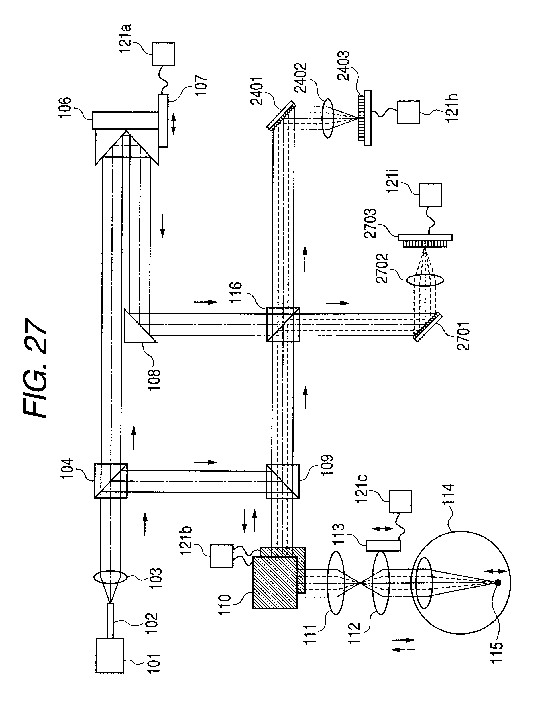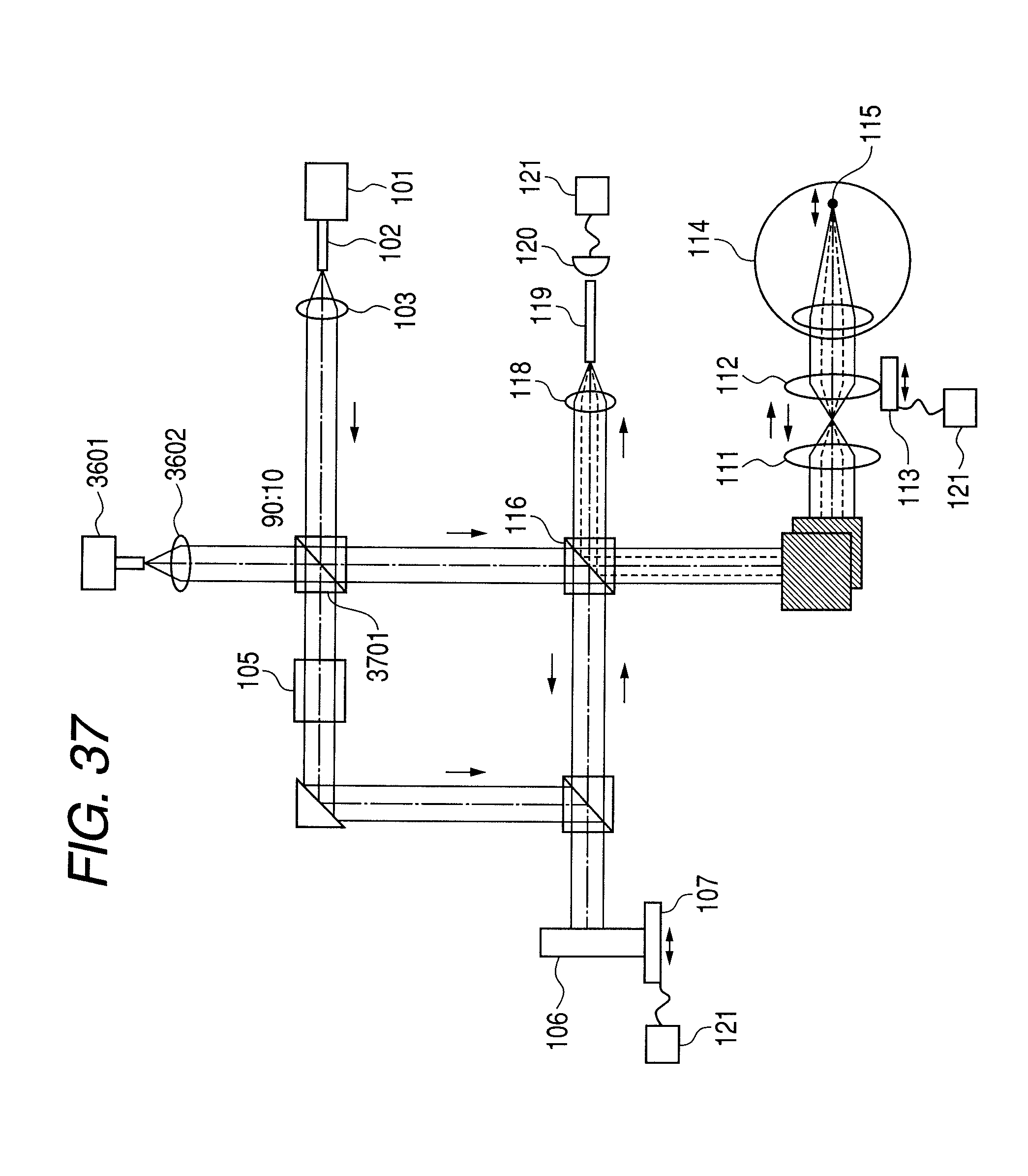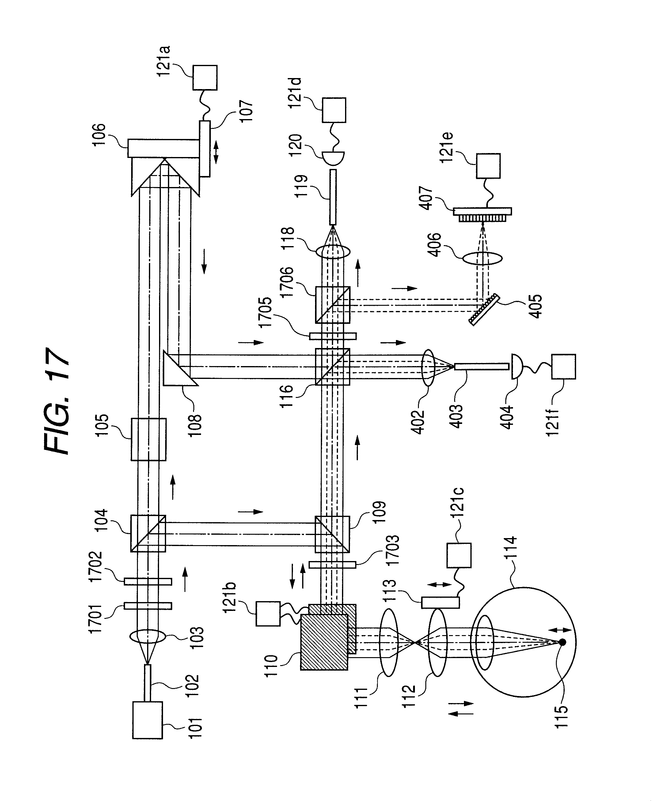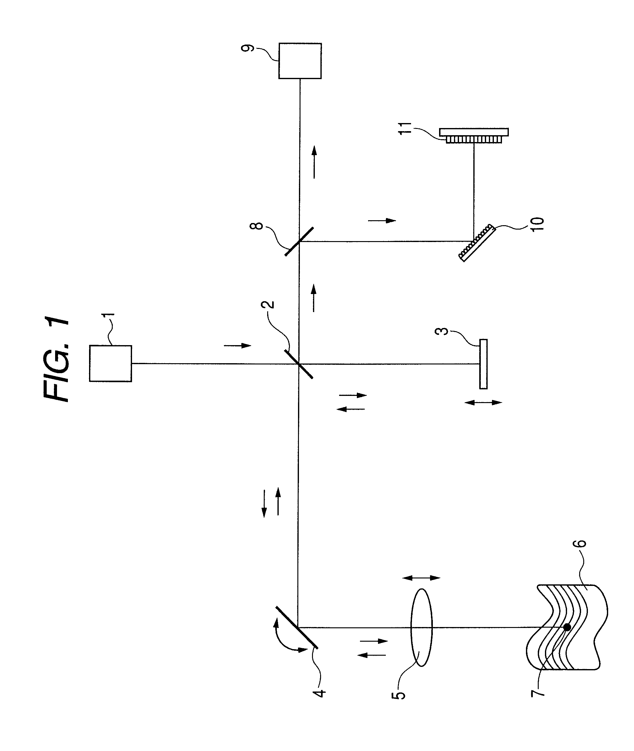 As shown in the formulas (2) and (3), making the lateral resolution high (a value of Rxy becomes small at this time), and making the depth of focus deep has relationship of optically theoretic trade-off. In an eyeground diagnostic system in which OCT is put in practical use, for example, values of λ=0.84 micrometer and NA=0.02 are used, and, when these numerical values are substituted for (formulas 2) and (formula 3), Rxy=20 micrometer and DOF=2 mm hold. A method called DF (dynamic focusing) is disclosed in U.S. Pat. No. 5,321,501 as a method of obtaining a high lateral resolution while keeping a depth of focus in a depth direction of an inspection object. Here, the DF will be described with reference to On the other hand, Here, a region 3402 illustrated by a circle in When the DF is applied to TD-OCT, obtaining measurement data can be continued in a high lateral resolution by making the focusing optical system perform focusing by synchronizing it with an operation of a movable reference mirror. Also in the invention which relates to this embodiment, the dynamic focusing (DF) can be used to define the above-mentioned first focus and a second focus and obtain tomography image information including each of the focuses. In addition, it is needless to say that the DF is applicable also in other embodiments mentioned later. (e) TS-OCT A method called TS-OCT (Transversal Scan OCT) is disclosed in U.S. Pat. No. 5,321,501 and Japanese Application Laid-open No. 2002-515593 (pages 9 to 19, FIG. 1, and FIG. 2)). Also in the invention which relates to this embodiment, a tomography image at each focusing position can be obtained by the TS-OCT at the first image information obtaining step or second image information obtaining step. Although this method is achieved by construction similar to the construction in Unlike a scanning method based on an A scan of the above-described TD-OCT or SD-OCT, the scanning method of the TS-OCT is based on obtaining a two-dimensional image by a C scan (scanning in an in-plane direction which is orthogonal to a depth direction inside an inspection object). Then, a plurality of these two-dimensional images is obtained in the depth direction inside a seen object, and a three-dimensional image is formed using it. In this scanning method, since the movable reference mirror moves in the depth direction inside the inspection object after obtaining a two-dimensional image, there is a temporal margin from certain movement to the next movement in comparison with the A scan. For this reason, the TS-OCT is easy to synchronize a focusing optical system with the movable reference mirror when moving it, and it can be said that it is a scanning method suitable for the above-mentioned DF. (Second Embodiment: Correction of SD-OCT Image with SD-OCT Image) An image forming method using an optical coherence tomography which relates to this embodiment has the following steps. 1. A first image information obtaining step of obtaining a one-dimensional or two-dimensional image of an inspection object at a position, including a first focus, with respect to an optical axis direction, which is a direction in which light is directed onto the inspection object, by a spectral domain optical coherence tomography 2. A second image information obtaining step of obtaining a one-dimensional or two-dimensional image of the inspection object at a position, including a second focus different from the first focus, with respect to the optical axis direction by a spectral domain optical coherence tomography 3. A step of correcting positional relation, with respect to the optical axis direction, between both of image information obtained respectively by the first and second image information obtaining steps using tomography information of the inspection object which is obtained by at least one step of the first or second image information obtaining step, and forming a tomography image or a three-dimensional image of the inspection object. Construction for performing the image forming method which relates to this embodiment is illustrated in In the image forming method in this embodiment, unless a matter described in the above-described first embodiment is contradictory, it is applicable as it is. (Third Embodiment: SD-OCT with DF In addition, an image forming method using an optical coherence tomography which relates to this embodiment is characterized by obtaining by a spectral domain optical coherence tomography a one-dimensional or two-dimensional image of an inspection object in an optical axis direction, in which light is directed onto the inspection object, respectively while changing a focal position with respect to an optical axis direction, and forming a tomography image or a three-dimensional image of the inspection object. A focusing position can be defined by applying the above-described dynamic focusing mechanism. In particular, data volume is reducible by leaving image information at a focusing position selectively, and eliminating the image information in other portions serially. In the image forming method in this embodiment, unless a matter described in the above-described first embodiment is contradictory, it is applicable as it is. (Fourth Embodiment: Apparatus An apparatus which relates to this embodiment is an optical coherence tomograph apparatus for performing the image forming methods described in the embodiments as stated above. Specifically, it has at least a light source for causing light to impinge on an inspection object, a light dividing unit for dividing the light from the above-mentioned light source into signal light and reference light, and a detection unit for dispersing and detecting coherent light of the reference light and signal light. In the following embodiment, each unit will be described in detail. In addition, it can be also constructed as follows as an apparatus which relates to this embodiment. (Apparatus 1) It is equipped with a division optical system which divid