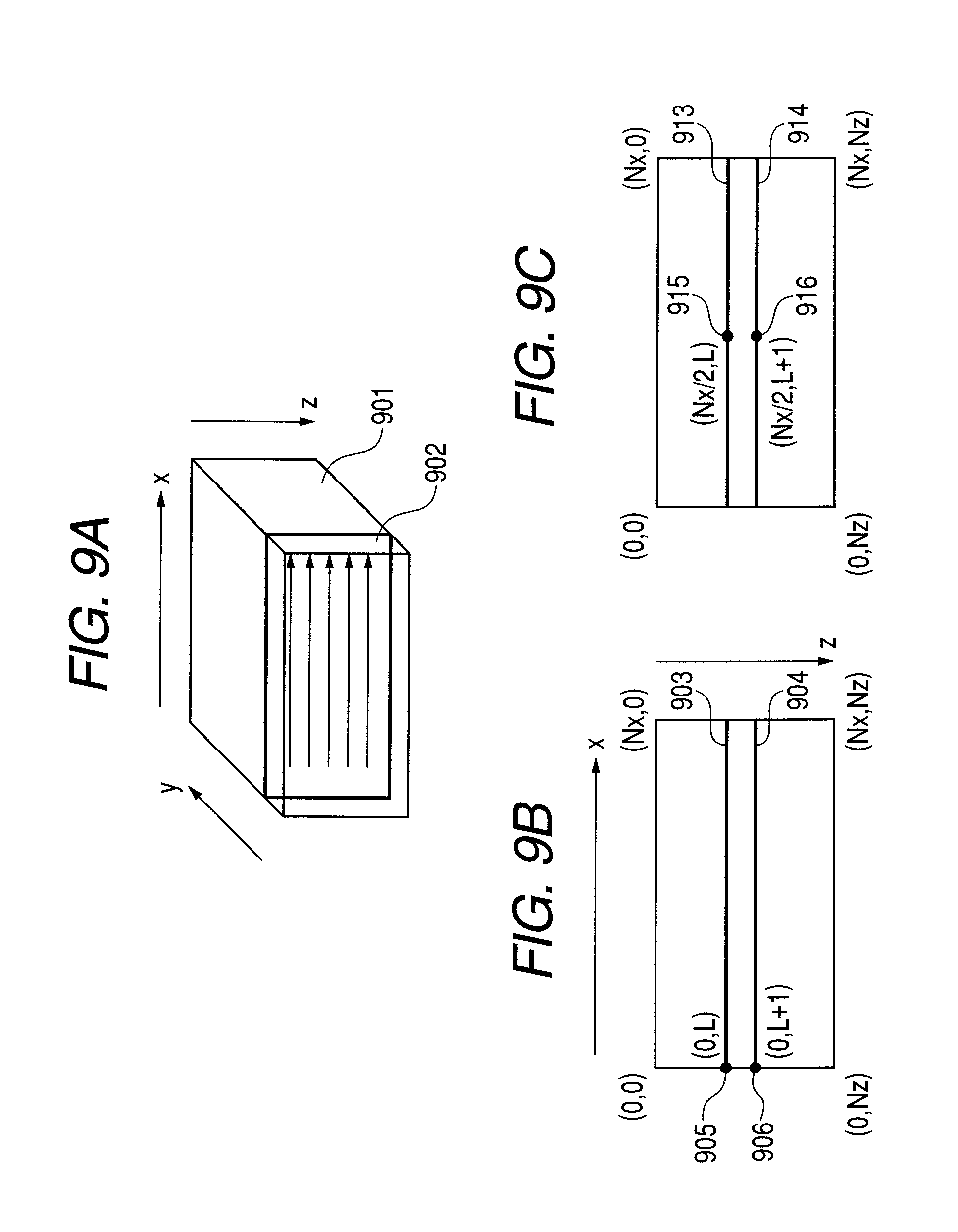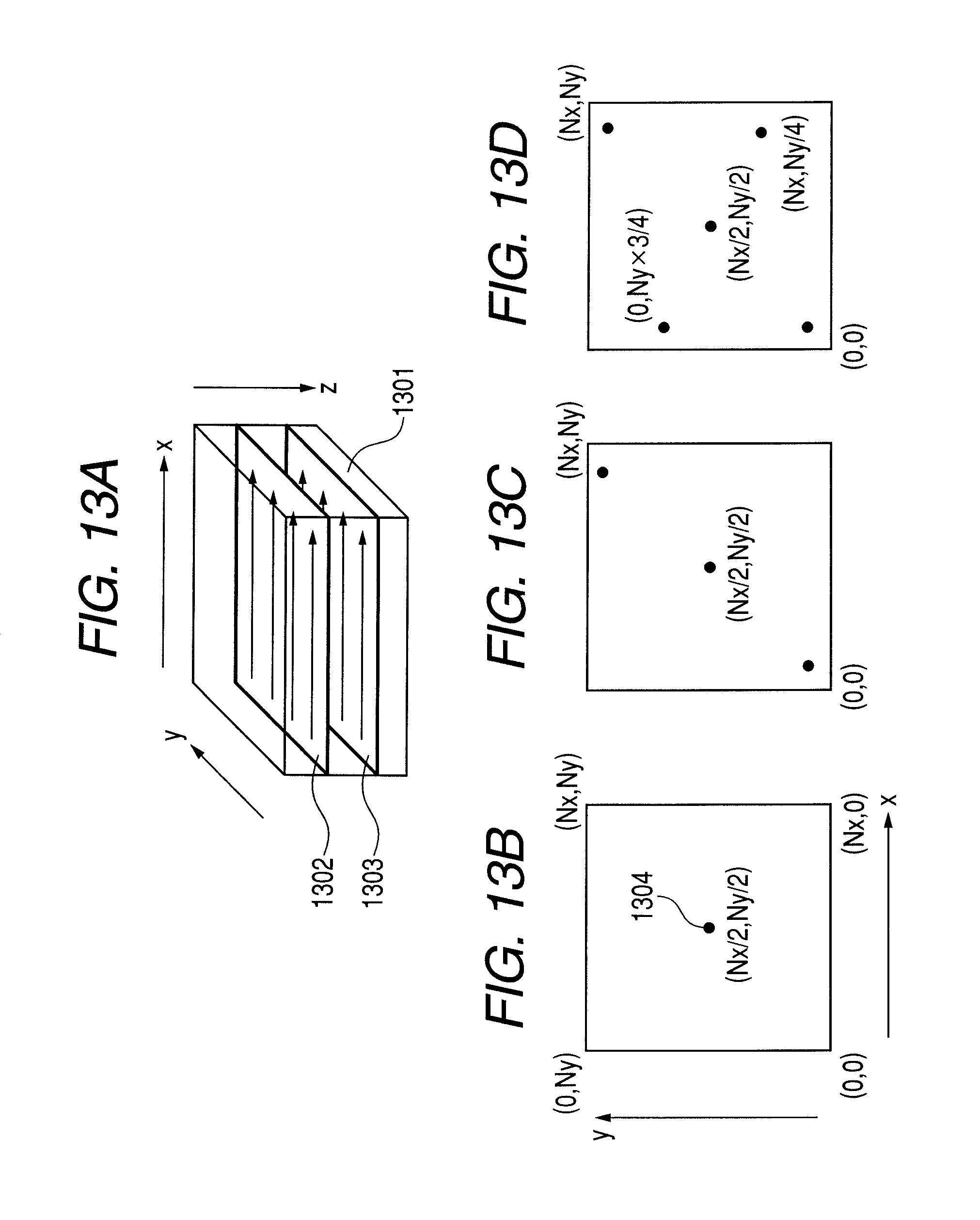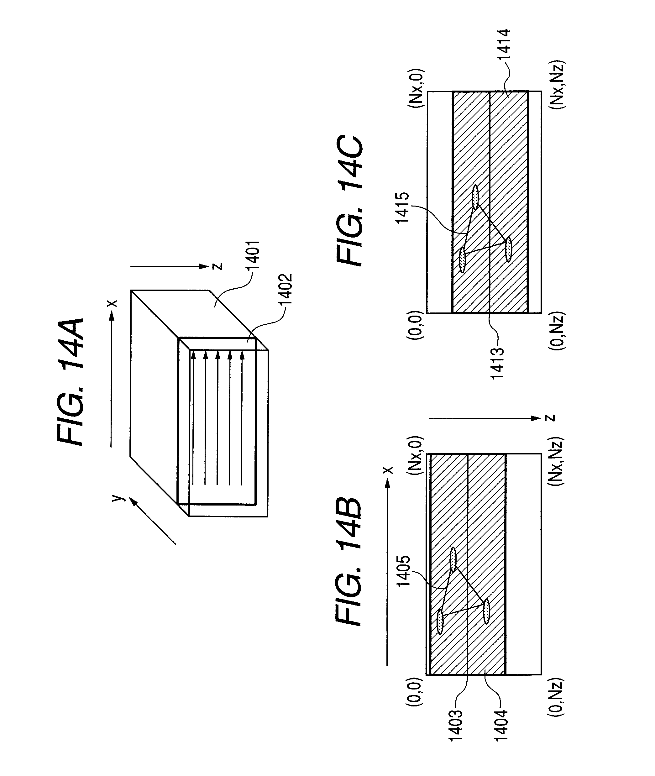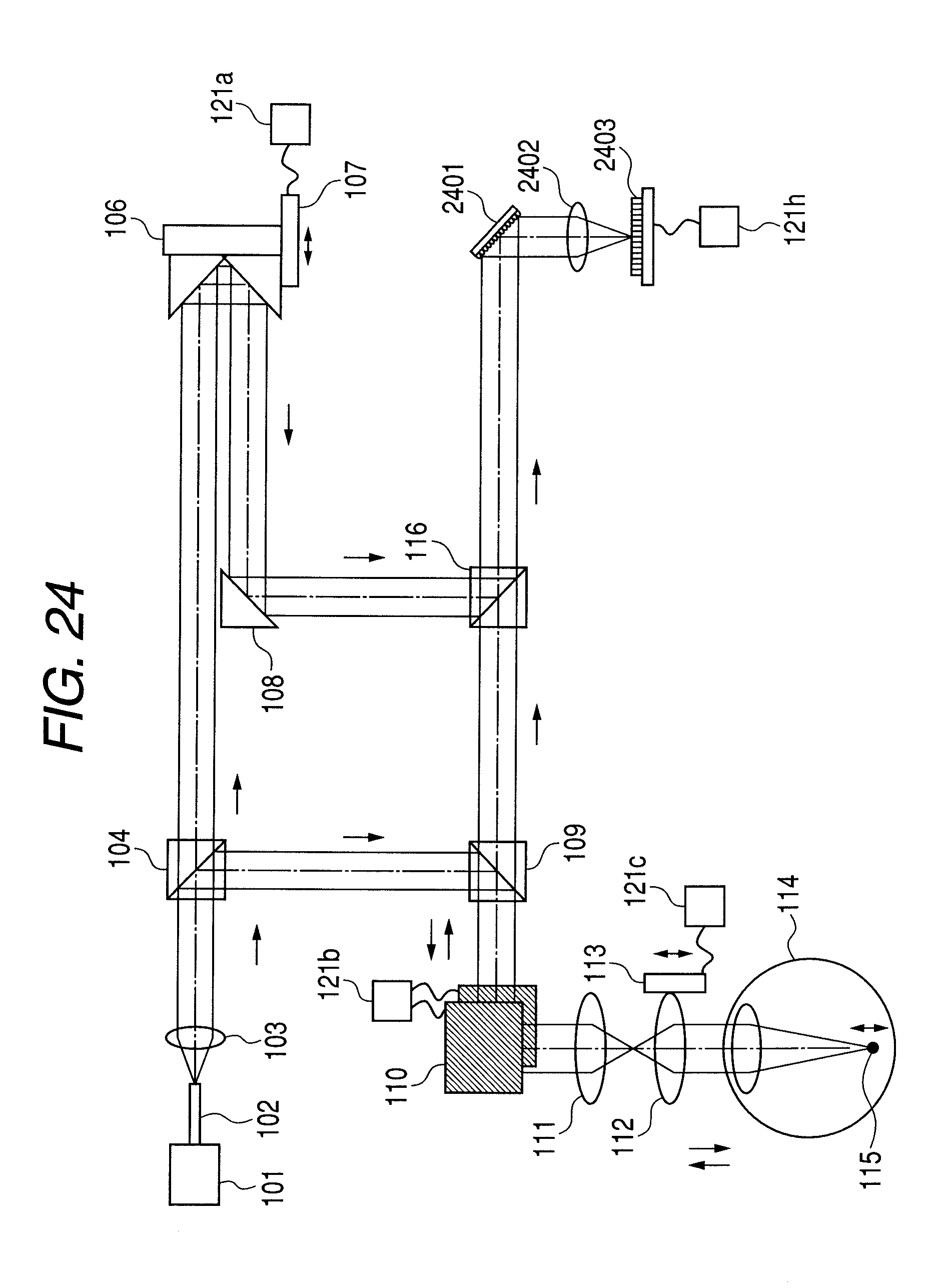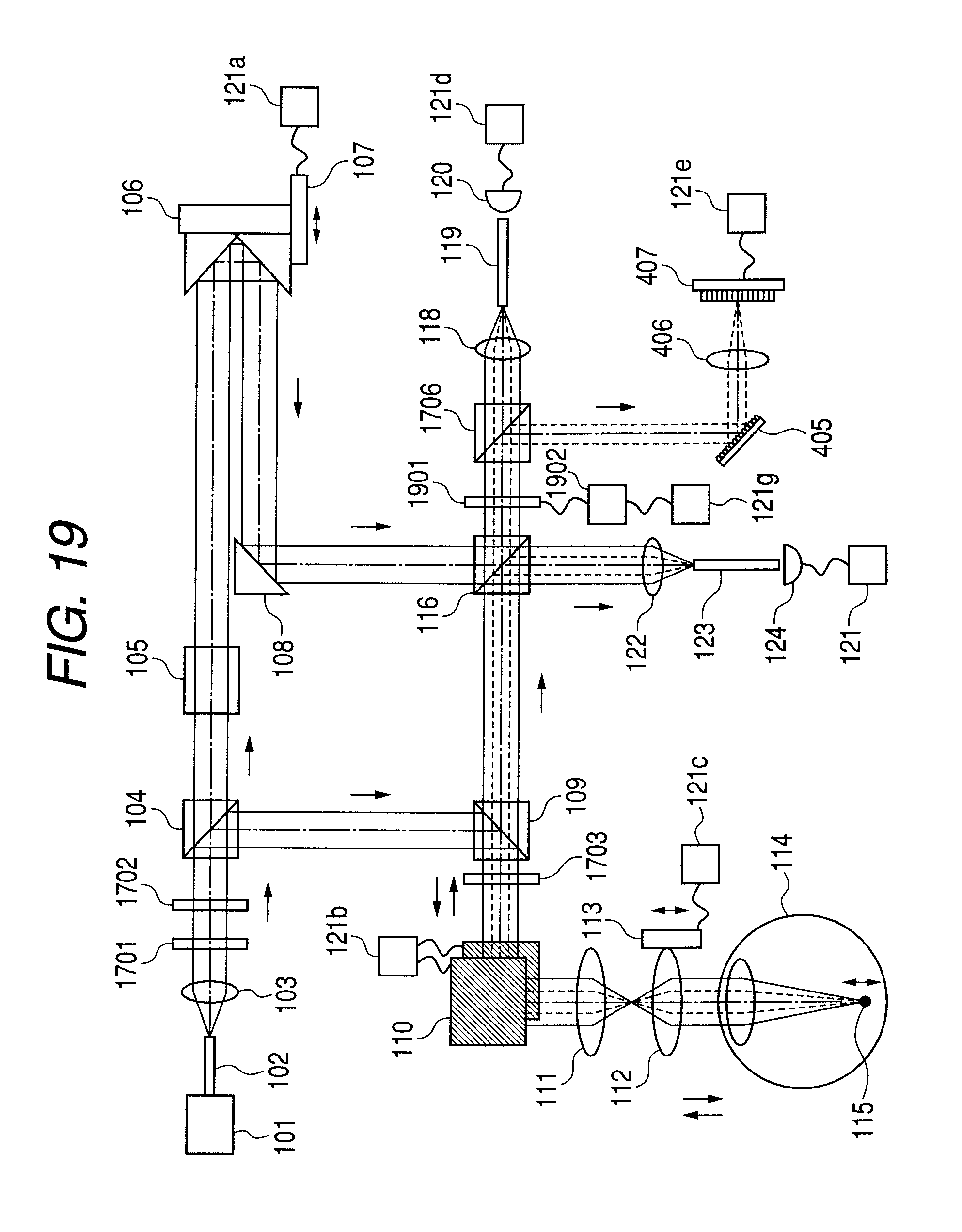 As shown in the formulas (2) and (3), making the lateral resolution high (a value of Rxy becomes small at this time), and making the depth of focus deep has relationship of optically theoretic trade-off. In an eyeground diagnostic system in which OCT is put in practical use, for example, values of λ=0.84 micrometer and NA=0.02 are used, and, when these numerical values are substituted for (formulas 2) and (formula 3), Rxy=20 micrometer and DOF=2 mm hold. A method called DF (dynamic focusing) is disclosed in U.S. Pat. No. 5,321,501 as a method of obtaining a high lateral resolution while keeping a depth of focus in a depth direction of an inspection object. Here, the DF will be described with reference to On the other hand, Here, a region 3402 illustrated by a circle in When the DF is applied to TD-OCT, obtaining measurement data can be continued in a high lateral resolution by making the focusing optical system perform focusing by synchronizing it with an operation of a movable reference mirror. Also in the invention which relates to this embodiment, the dynamic focusing (DF) can be used to define the above-mentioned first focus and a second focus and obtain tomography image information including each of the focuses. In addition, it is needless to say that the DF is applicable also in other embodiments mentioned later. (e) TS-OCT A method called TS-OCT (Transversal Scan OCT) is disclosed in U.S. Pat. No. 5,321,501 and Japanese Application Laid-open No. 2002-515593 (pages 9 to 19, FIG. 1, and FIG. 2)). Also in the invention which relates to this embodiment, a tomography image at each focusing position can be obtained by the TS-OCT at the first image information obtaining step or second image information obtaining step. Although this method is achieved by construction similar to the construction in Unlike a scanning method based on an A scan of the above-described TD-OCT or SD-OCT, the scanning method of the TS-OCT is based on obtaining a two-dimensional image by a C scan (scanning in an in-plane direction which is orthogonal to a depth direction inside an inspection object). Then, a plurality of these two-dimensional images is obtained in the depth direction inside a seen object, and a three-dimensional image is formed using it. In this scanning method, since the movable reference mirror moves in the depth direction inside the inspection object after obtaining a two-dimensional image, there is a temporal margin from certain movement to the next movement in comparison with the A scan. For this reason, the TS-OCT is easy to synchronize a focusing optical system with the movable reference mirror when moving it, and it can be said that it is a scanning method suitable for the above-mentioned DF. (Second Embodiment: Correction of SD-OCT Image with SD-OCT Image) An image forming method using an optical coherence tomography which relates to this embodiment has the following steps. 1. A first image information obtaining step of obtaining a one-dimensional or two-dimensional image of an inspection object at a position, including a first focus, with respect to an optical axis direction, which is a direction in which light is directed onto the inspection object, by a spectral domain optical coherence tomography 2. A second image information obtaining step of obtaining a one-dimensional or two-dimensional image of the inspection object at a position, including a second focus different from the first focus, with respect to the optical axis direction by a spectral domain optical coherence tomography 3. A step of correcting positional relation, with respect to the optical axis direction, between both of image information obtained respectively by the first and second image information obtaining steps using tomography information of the inspection object which is obtained by at least one step of the first or second image information obtaining step, and forming a tomography image or a three-dimensional image of the inspection object. Construction for performing the image forming method which relates to this embodiment is illustrated in In the image forming method in this embodiment, unless a matter described in the above-described first embodiment is contradictory, it is applicable as it is. (Third Embodiment: SD-OCT with DF In addition, an image forming method using an optical coherence tomography which relates to this embodiment is characterized by obtaining by a spectral domain optical coherence tomography a one-dimensional or two-dimensional image of an inspection object in an optical axis direction, in which light is directed onto the inspection object, respectively while changing a focal position with respect to an optical axis direction, and forming a tomography image or a three-dimensional image of the inspection object. A focusing position can be defined by applying the above-described dynamic focusing mechanism. In particular, data volume is reducible by leaving image information at a focusing position selectively, and eliminating the image information in other portions serially. In the image forming method in this embodiment, unless a matter described in the above-described first embodiment is contradictory, it is applicable as it is. (Fourth Embodiment: Apparatus An apparatus which relates to this embodiment is an optical coherence tomograph apparatus for performing the image forming methods described in the embodiments as stated above. Specifically, it has at least a light source for causing light to impinge on an inspection object, a light dividing unit for dividing the light from the above-mentioned light source into signal light and reference light, and a detection unit for dispersing and detecting coherent light of the reference light and signal light. In the following embodiment, each unit will be described in detail. In addition, it can be also constructed as follows as an apparatus which relates to this embodiment. (Apparatus 1) It is equipped with a division optical system which divid