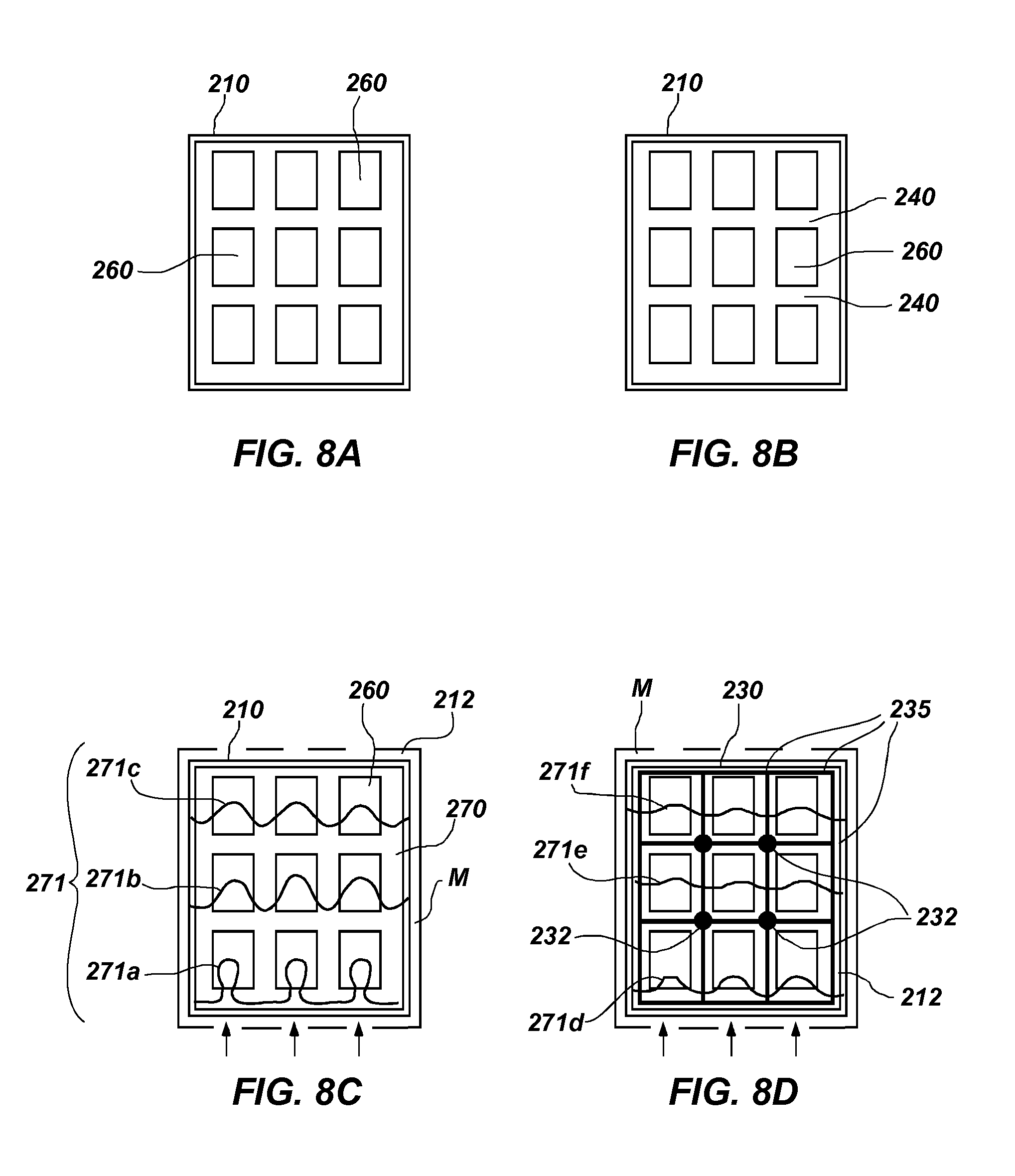 Substrate 210 may be conventionally placed in a mold (not shown) for the purpose of flowing resin 270 over the substrate 210. In a particular embodiment of the invention depicted in FIG. 8D, an insert 230 is placed inside of the mold M and attached to a surface of substrate 210 on which semiconductor dice 260 are mounted. Insert 230 may include a plurality of baffles 235, shown in FIG. 8D as being arranged in a grid pattern. Baffles 235 may be configured to reduce the flow rate of resin 270 in between the semiconductor dice 260 to a flow rate comparable to the flow rate of resin 270 over the tops of semiconductor dice 260. Flow front 271, as depicted at 271d, 271e, and 271f as the resin progresses across substrate 210, illustrates how flow front 271 as depicted at 271a, 271b, and 271c may be modified by the use of insert 230.