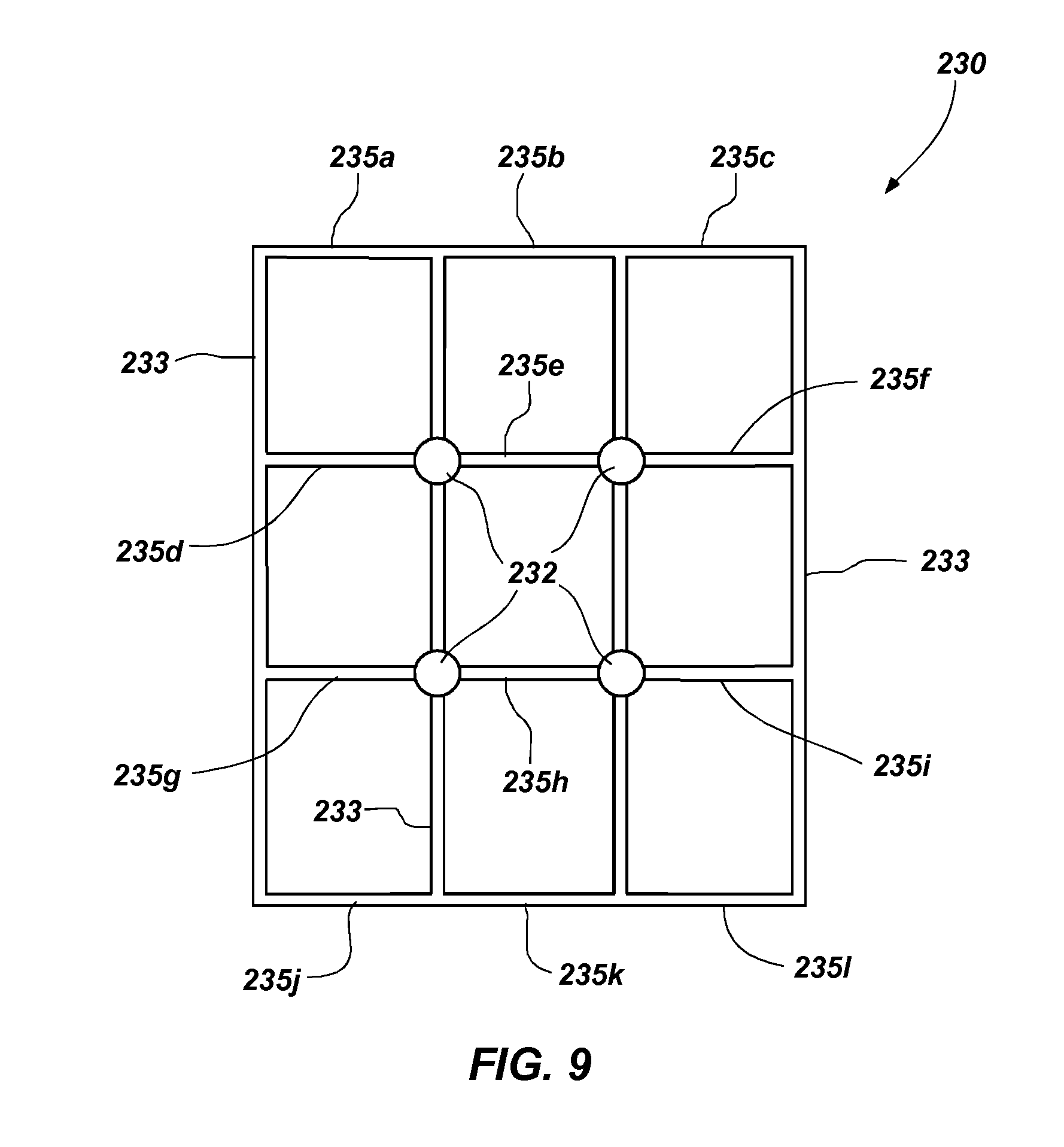FIG. 9 illustrates an enlarged view of the embodiment of insert 230 shown in FIG. 8D. Baffles 235 may include baffles 235a through 235l, as shown in FIG. 9. An insert 230 may include any number of baffles 235, adapted to the number of semiconductor dice 260 mounted to substrate 210. Insert 230 may, optionally, include a plurality of peripheral structural supports 233. The structural supports 233 may interconnect outer ends of the different baffles 235 to each other and support the baffles 235. Structural supports 233 may be any structure adapted for supporting baffles 235. For example, structural supports 233 may comprise a wall, a rod, or a wire. Structural supports 233 may be similar or identical to baffles 235. Additionally, some of the structural supports 233 may not present, such as around the perimeter of insert 230.