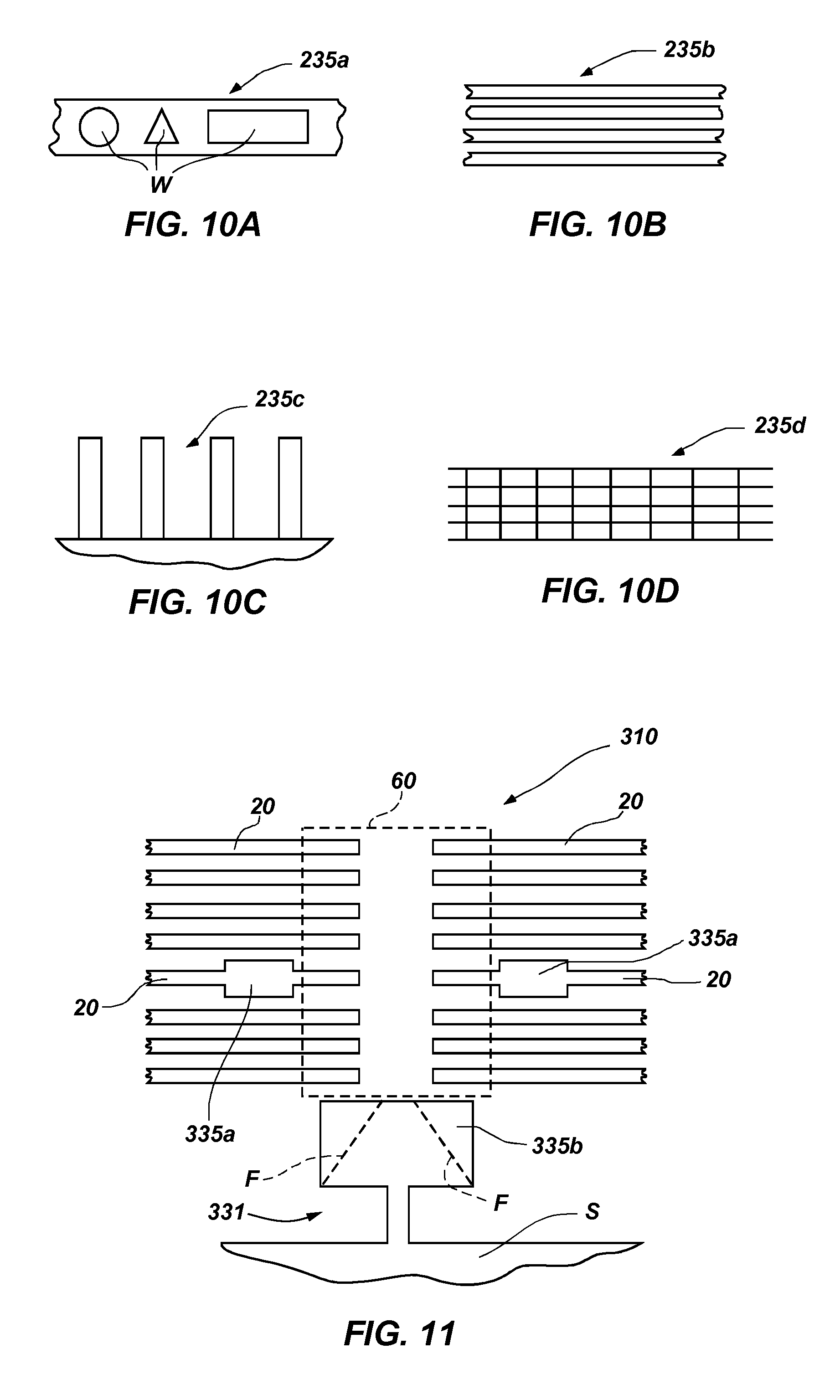 In a particular embodiment, baffles 235 are thin walls of rectangular cross-section and of lesser height than a distance between a surface of substrate 210 and the wall of a mold member extending thereover. In other embodiments, baffles 235 may exhibit a trapezoidal or a triangular cross-section, or any other geometric shape. Baffles 235 may also comprise horizontal rods as depicted in FIG. 10B, or laterally spaced vertical posts or struts as depicted in FIG. 10C, horizontally or vertically oriented spaced wires, wire mesh as depicted in FIG. 10D, or combinations thereof. Baffles 235 may comprise any structure suitable for retarding or directing the flow of a resin 270. Baffles 235 may have any height, width, or thickness necessary. Baffles 235 may specifically include, without limitation, any of the structures discussed with respect to baffles 175, 165, 135, 55, 35, or 25.