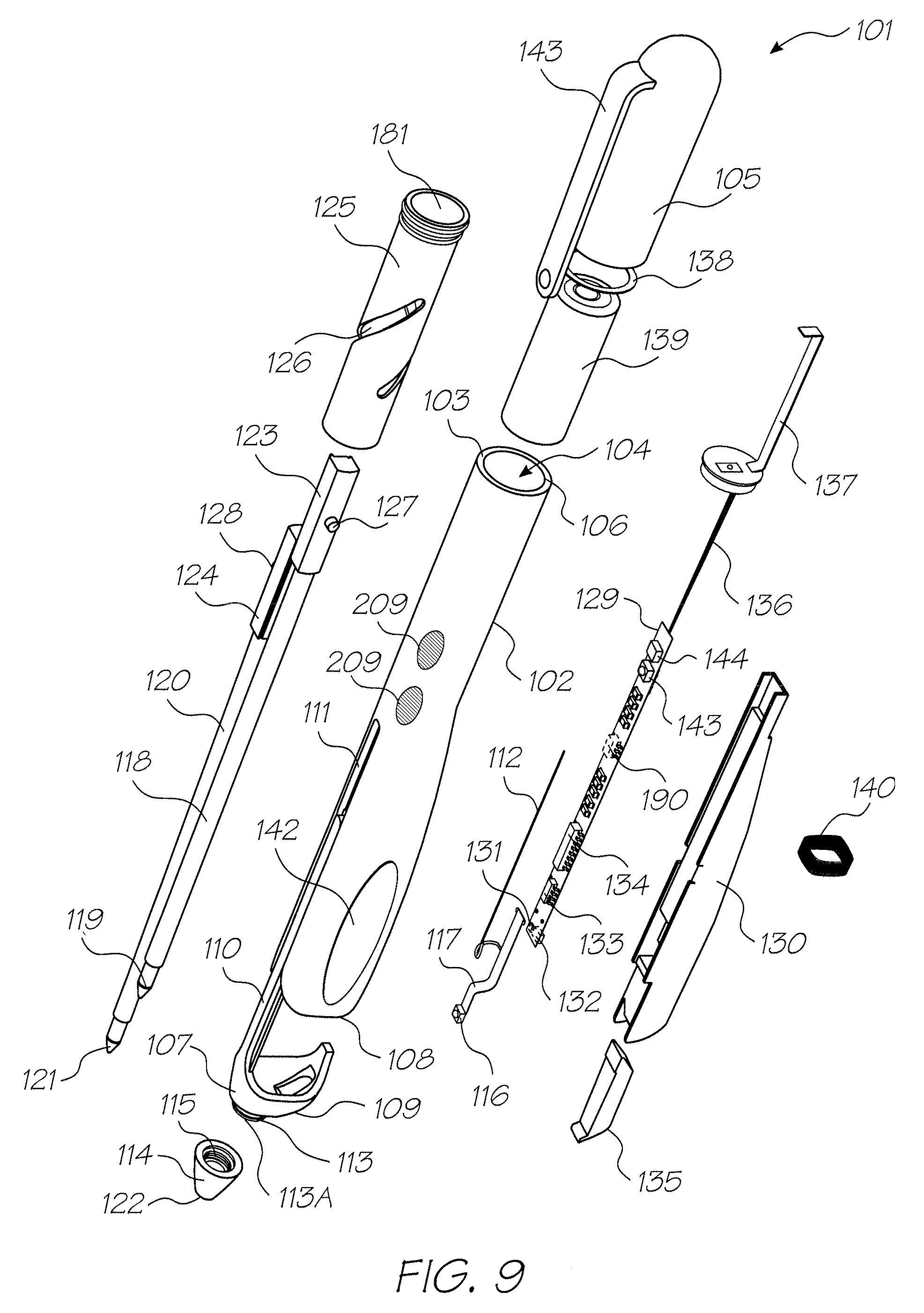 A second flex PCB 129, is mounted on an electronics chassis 130 which sits within the housing 102. The second flex PCB 129 mounts an infrared LED 131 for providing infrared radiation for projection onto the surface. An image sensor 132 is provided mounted on the second flex PCB 129 for receiving reflected radiation from the surface. The second flex PCB 129 also mounts a radio frequency chip 133, which includes an RF transmitter and RF receiver, and a controller chip 134 for controlling operation of the pen 101. An optics block 135 (formed from moulded clear plastics) sits within the cover 107 and projects an infrared beam onto the surface and receives images onto the image sensor 132. Power supply wires 136 connect the components on the second flex PCB 129 to battery contacts 137 which are mounted within the cam barrel 125. A terminal 138 connects to the battery contacts 137 and the cam barrel 125. A three volt rechargeable battery 139 sits within the cam barrel 125 in contact with the battery contacts. An induction charging coil 140 is mounted about the second flex PCB 129 to enable recharging of the battery 139 via induction. The second flex PCB 129 also mounts an infrared LED 143 and infrared photodiode 144 for detecting displacement in the cam barrel 125 when either the stylus 120 or the ink cartridge 118 is used for writing, in order to enable a determination of the force being applied to the surface by the pen nib 119 or stylus nib 121. The IR photodiode 144 detects light from the IR LED 143 via reflectors (not shown) mounted on the slider blocks 123 and 124. Rubber grip pads 141 and 142 are provided towards the end 108 of the housing 102 to assist gripping the pen 101, and top 105 also includes a clip 142 for clipping the pen 101 to a pocket. 7.2 Pen Controller The pen 101 is arranged to determine the position of its nib (stylus nib 121 or ink cartridge nib 119) by imaging, in the infrared spectrum, an area of the surface in the vicinity of the nib. It records the location data from the nearest location tag, and is arranged to calculate the distance of the nib 121 or 119 from the location tab utilising optics 135 and controller chip 134. The controller chip 134 calculates the orientation (yaw) of the pen using an orientation indicator in the imaged tag, and the nib-to-tag distance from the perspective distortion observed on the imaged tag. Utilising the RF chip 133 and antenna 112 the pen 101 can transmit the digital ink data (which is encrypted for security and packaged for efficient transmission) to the computing system. When the pen is in range of a relay device 601, the digital ink data is transmitted as it is formed. When the pen 101 moves out of range, digital ink data is buffered within the pen 101 (the pen 101 circuitry includes a buffer arranged to store digital ink data for approximately 12 minutes of the pen motion on the surface) and can be transmitted later. In Applicant's U.S. Pat. No. 6,870,966, the contents of which is incorporated herein by reference, a pen 101 having an interchangeable ink cartridge nib and stylus nib was described. Accordingly, and referring to The nib ID allows the computing system to identify which nib (stylus nib 121 or ink cartridge nib 119) is presently being used. The computing system can vary its operation depending upon which nib is being used. For example, if the ink cartridge nib 119 is being used the computing system may defer producing feedback output because immediate feedback is provided by the ink markings made on the surface. Where the stylus nib 121 is being used, the computing system may produce immediate feedback output. Since a user may change the nib 119, 121 between one stroke and the next, the pen 101 optionally records a nib ID for a stroke 175. This becomes the nib ID implicitly associated with later strokes. Cartridges having particular nib characteristics may be interchangeable in the pen. The pen controller 134 may interrogate a cartridge to obtain the nib ID 175 of the cartridge. The nib ID 175 may be stored in a ROM or a barcode on the cartridge. The controller 134 notifies the system of the nib ID whenever it changes. The system is thereby able to determine the characteristics of the nib used to produce a stroke 175, and is thereby subsequently able to reproduce the characteristics of the stroke itself. The controller chip 134 is mounted on the second flex PCB 129 in the pen 101. FIG. 10 is a block diagram illustrating in more detail the architecture of the controller chip 134. The pen controller chip 134 includes a controlling processor 145. Bus 146 enables the exchange of data between components of the controller chip 134. Flash memory 147 and a 512 KB DRAM 148 are also included. An analog-to-digital converter 149 is arranged to convert the analog signal from the force sensor photodiode 144 to a digital signal. An image sensor interface 152 interfaces with the image sensor 132. A transceiver controller 153 and base band circuit 154 are also included to interface with the RF chip 133 which includes an RF circuit 155 and RF resonators and inductors 156 connected to the antenna 112. The controlling processor 145 captures and decodes location data from tags from the surface via the image sensor 132, monitors the force sensor photodiode 144, controls the LEDs 116, 131 and 143, and handles short-range radio communication via the radio transceiver 153. It is a medium-performance (˜40 MHz) general-purpose RISC processor. The processor 145, digital transceiver components (transceiver controller 153 and baseband circuit 154), image sensor interface 152, flash memory 147 and 512 KB DRAM 148 are integrated in a single controller ASIC. Analog RF components (RF circuit 155 and RF resonators and inductors 156) are provided in the separate RF chip. The image sensor is a 215×215 pixel CCD (such a sensor is produced by Matsushita Electronic Corporation, and is described in a paper by Itakura, K T Nobusada, N Okusenya, R Nagayosh