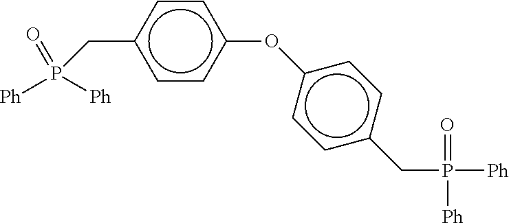 % PA 66 Resin 30.2 50 40 % Zytel 70G43L 69.8 70 70 70 Resin(a) % Glass 30 30 Compound V 30 Compound VI 30 Compound VIII 30 Compound X 20 30 UL-94 Burn Results Ave. T1/T2, s >30, BD/BTC(c) 3/2(c) 13/3 23/24 20/2 9/2 Total Burn Time N/A 15/10 64/14 113/5 100/8 44/9 T1/T2, s Dripping(b) BD/BTC BD BD BD BD none Rating Fail V-2 V-2 V-2 V-2 V-1 (a)A 43% Glass - PA66 resin concentrate from DuPont. (b)BD = Burning Drip: Indicates burning material from the bar ignited the cotton. BTC = burned completely to the clamp. (c)UL Test on 1/32″ thick sample bars. EXAMPLE 8
