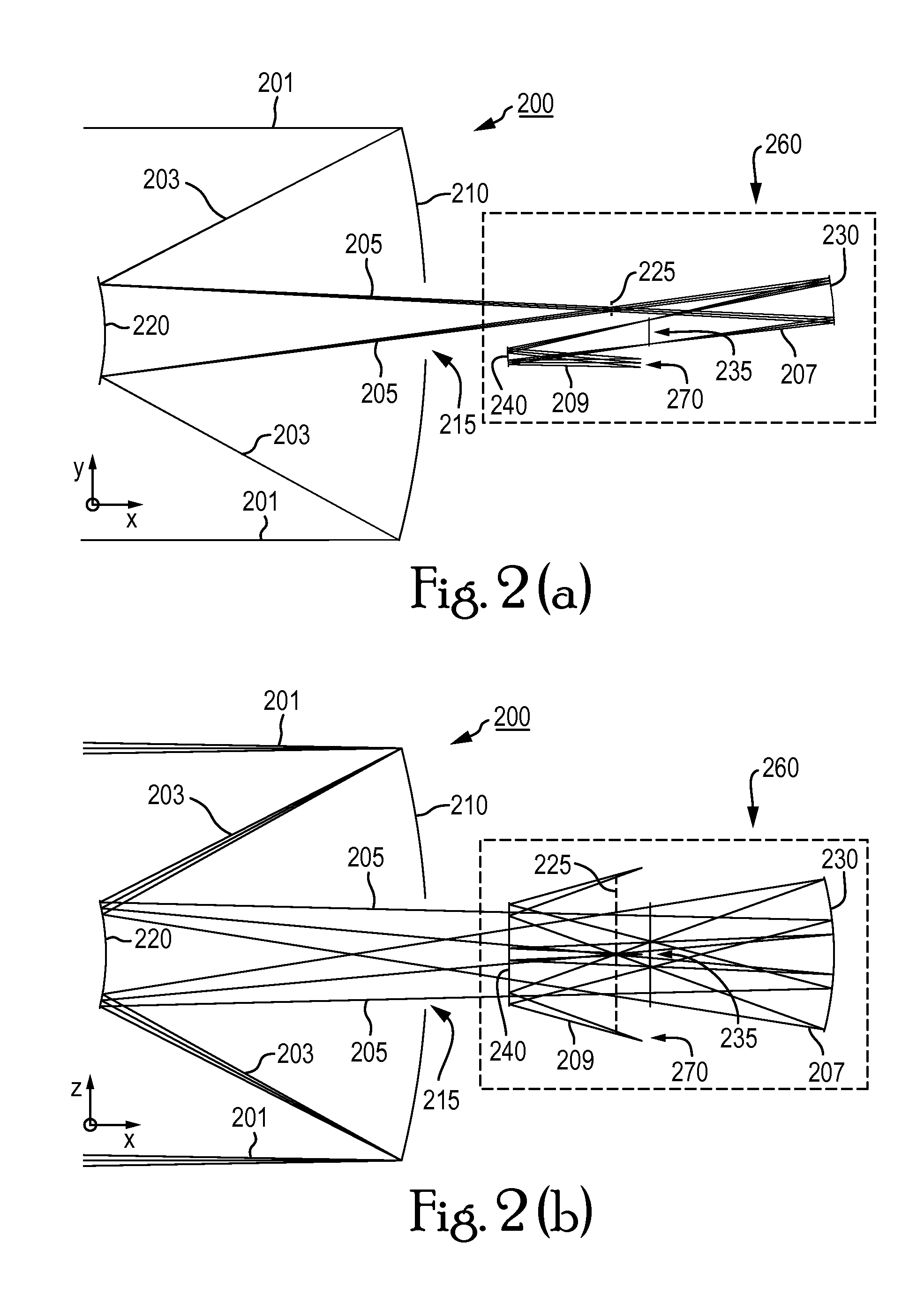 a primary mirror of a positive-powered concave substantially paraboloidal configuration configured to reflect light incident thereupon; a secondary mirror of a negative-powered convex hyperboloidal configuration facing the primary mirror configured to receive the light reflected from the primary mirror and redirect the light reflected from the primary mirror; a positive-powered tertiary mirror configured to substantially reimage and reflect divergent light rays incident from the secondary mirror; and a quaternary mirror configured to receive the reimaged light rays from the tertiary mirror, and to relay the received reimaged light rays to a focal point of the optical system to produce a focal point image. 2. The optical system according to 3. The optical system according to 4. The optical system according to 5. The optical system according to 6. The optical system according to 7. The optical system according to 8. The optical system according to 9. The optical system according to 10. The optical system according to 11. The optical system according to 12. The optical system according to 13. A method comprising: