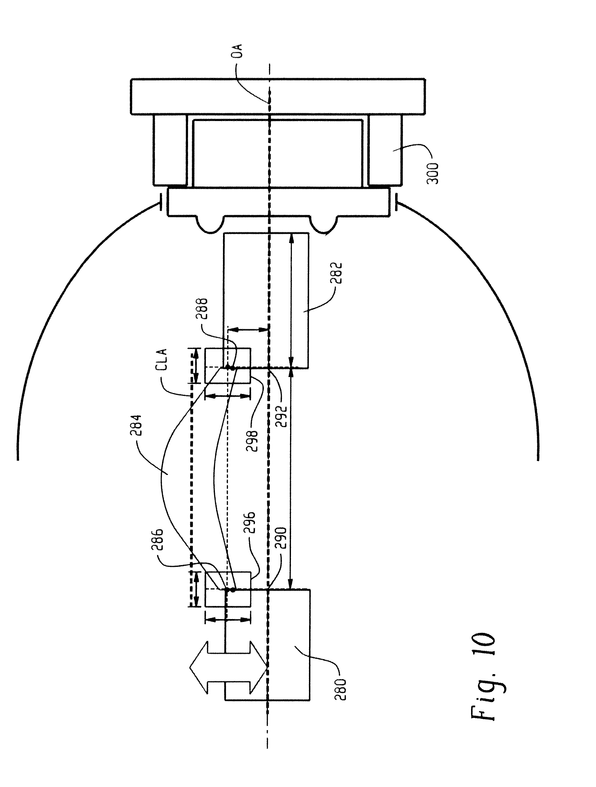 This disclosure relates to a vehicle headlamp system, and more particularly to a headlamp system that employs a compact high intensity discharge lamp having at least two different lighting functions or modes (e.g., “high beam” and “low beam” modes) integrated into a single headlamp assembly. Selected aspects of this disclosure may also find application in related headlamp arrangements. Light collection efficiency of state of the art ellipsoidal projector modules of a projector-type automotive headlamp is moderate. Limitations associated with the light collection efficiency are basically driven by light absorption by the cut-off shield inserted into the module to block unwanted light rays when operated in “low beam” mode. The unwanted light rays in this mode are those that would otherwise be directed by the headlamp toward the eyes of an oncoming driver approaching the vehicle from the opposite direction. The cut-off shield defines a sharp light-to-dark cut-off in the headlamp beam. The cut-off line produced by the light blocking cut-off shield is preferably a straight, substantially horizontal line in the lanes of oncoming traffic. Further, the cut-off line is a skewed straight line in the lanes of the driver having the headlamp installed in his vehicle. In other words, beam cut-off is a means to avoid glare to oncoming drivers and partly to avoid glare for drivers moving in front of or close to the vehicle when in a “low beam” mode of the headlights. The beam cut-off also allows lighting of the road edge in the driving direction so that, for example, roadway signs are illuminated by the headlamp in the “low beam” mode. Light collecting efficiency of a projector module can be increased by making an ellipsoidal projector module more compact and with a smaller opening area for the projector lens. Unfortunately, this proposed solution also has drawbacks. For example, the small surface area of the projector lens means higher surface brightness, which can cause discomfort glare to oncoming drivers. Accordingly, a diameter of the lens is thus preferably limited to be not less than approximately 60 millimeters minimum, since the glare can be uncomfortable or disturbing with lenses of diameters as low as less than 60 millimeters. Consequently, a new ellipsoidal projector module construction that eliminates, or at least reduces, light losses due to cut-off shield absorption and other loss mechanisms in the projector modules could have an advantageous impact in headlamp design technology. An automotive headlamp includes a light source and a light reflecting surface or “reflector” that receives light from the light source and directs the light toward a lens. A curved mirror is interposed between the light source and the lens for re-directing a portion of the light heading originally toward the lens back toward the reflector. A shield is movable between first and second positions, and in the first or blocking position, the shield selectively blocks a portion of the light from the light source from passing through the shield, and the shield supports the curved mirror. In a second position of the shield, an opening in the reflector receives the curved mirror. The shield preferably includes an additional curved mirror segment for conforming to the curved surface of the reflector in the second position of the shield. In a preferred arrangement, the reflector is a truncated substantially ellipsoidal surface, and the light source is located at a first focal point of the reflector. The shield is preferably located between the first focal point and a second focal point of the substantially ellipsoidal reflector. Auxiliary mirror segments extend from the truncated substantially ellipsoidal reflector and direct light from the light source toward the first focal point or toward the second focal point of the reflector. In one arrangement, the light source is an arc discharge lamp and is purposefully offset from the first focal point of a substantially ellipsoidal reflector by a predetermined dimension. A central optical axis of the arc discharge light source is preferably positioned in parallel and vertically offset below a horizontal longitudinal optical axis of the substantially ellipsoidal reflector, and an adjustment member may also be provided for selectively altering the offset of the arc discharge light source from the first focal point. The curved mirror is purposefully imperfect so that re-directed light rays do not overheat the light source in one arrangement. A primary benefit is the improved light collection efficiency of a projector type automotive headlamp, and significant increase of beam intensity in the “low beam” mode of operation. Improved positioning accuracy can also be achieved by a lamp fixation method in an automotive headlamp. By virtue of increased light collection efficiency, the total lumen output, road illuminance levels and projected beam angle of the projector type automotive headlamp can be increased using teachings of the present disclosure. Another benefit is enhanced visibility on the road, or the ability to use a light source with a lower power consumption which, in turn, can lead to better fuel efficiency of a vehicle. Still another advantage relates to enhancing light collection efficiency by the use of auxiliary mirrors and mirror segments rather than altering the overall dimensions of the projector module. Still other benefits and advantages of the present disclosure will become more apparent upon reading and understanding the following detailed description. Turning first to More particularly, since the light source 102 is located at the first focal point 104 of the substantially ellipsoidal reflector, light is directed toward the image of the light source formed at the second focal point 114, passes through the second focal point, and continues through the headlamp assembly toward the lens 120. The lens transmits and orients the light rays in 