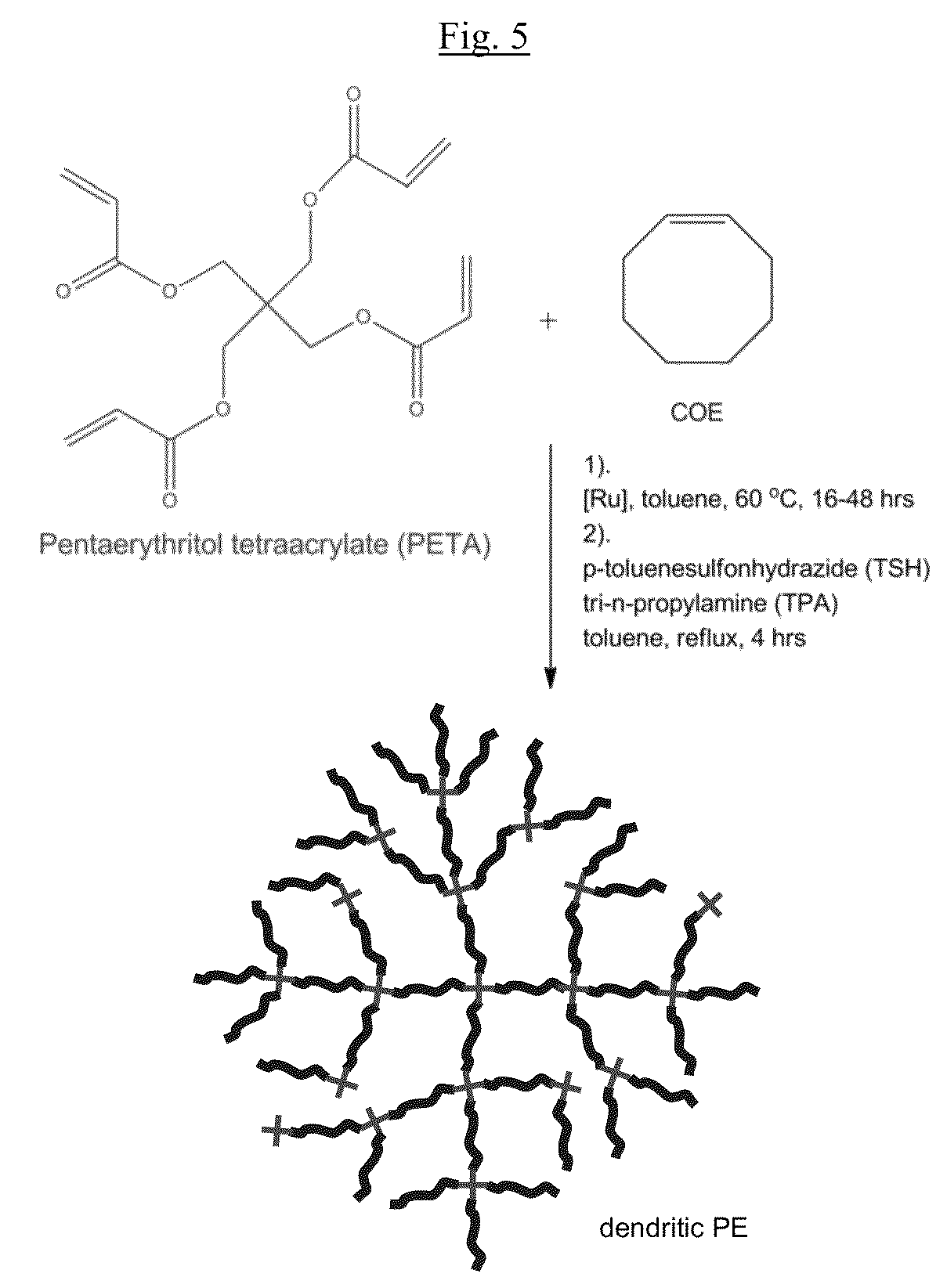 A reaction flask was charged with 60 mmol cyclooctene (COE), 0.363 mmol pentaerythritol tetraacrylate (PETA) and 20 milliliters of toluene. The solution was stirred by a magnetic stirrer. A small volume of 85 milligrams of Grubbs 2nd generation catalyst solution in toluene (1 milliliter) was prepared and injected into the stirred monomer solution. The reaction mixture was stirred at 60° C. under slow nitrogen flow for 16-48 hours before it was quenched by several drops of ethyl vinyl ether. During the synthesis, no gels were formed. A small amount of reaction mixture was taken out by syringe and dried for NMR and GPC analyses. To the same reaction flask, excess p-toluenesulfonhydrazide (TSH, normally 3 equivalents to olefins), 10-40 milligrams BHT, and 150 milliliters toluene were added. The mixture was heated to reflux followed by an injection of excess tri-n-propylamine (TPA, normally 3 equivalents to olefins). After refluxing for 4 hours, the mixture was poured into 1.5 liter methanol while it was still hot. The white precipitate was filtered and washed with 100 milliliters of methanol three times. The reaction scheme is shown in FIG. 5.