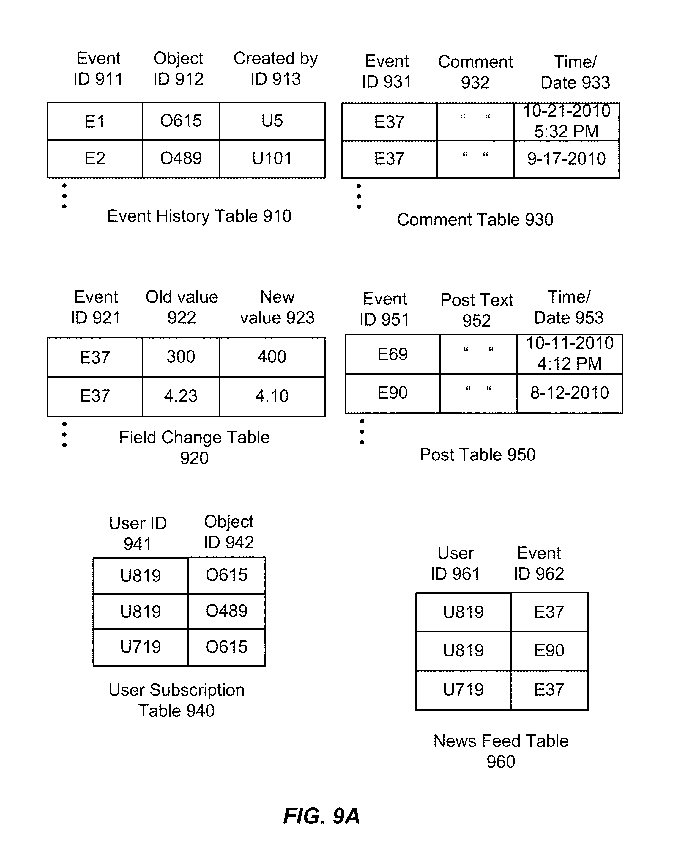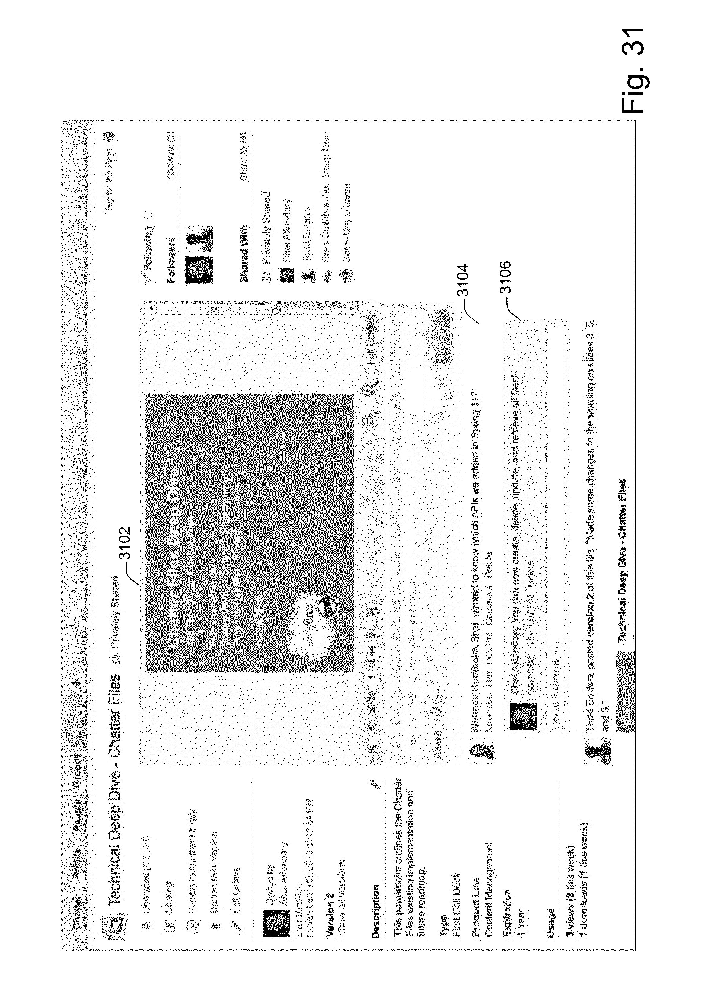This application claims priority to and commonly assigned U.S. Provisional Patent Application No. 61/419,606, titled Chatter Files, by Prabaker, et al., filed on Dec. 3, 2010, which is hereby incorporated by reference in its entirety and for all purposes. A portion of the disclosure of this patent document contains material, which is subject to copyright protection. The copyright owner has no objection to the facsimile reproduction by anyone of the patent document or the patent disclosure, as it appears in the Patent and Trademark Office patent file or records, but otherwise reserves all copyright rights whatsoever. The present application relates generally to providing on-demand services in a network using a database system and, more specifically, to techniques for publishing updates to records in the database system over the network. “Cloud computing” services provide shared resources, software, and information to computers and other devices upon request. In cloud computing environments, software can be accessible over the Internet rather than installed locally on in-house computer systems. Cloud computing typically involves over-the-Internet provision of dynamically scalable and often virtualized resources. Technological details can be abstracted from the users, who no longer have need for expertise in, or control over, the technology infrastructure “in the cloud” that supports them. Database resources can be provided in a cloud computing context. However, using conventional database management techniques, it is difficult to know about the activity of other users of a database system in the cloud or other network. For example, the actions of a particular user, such as a salesperson, on a database resource may be important to the user's boss. The user can create a report about what the user has done and send it to the boss, but such reports may be inefficient, not timely, and incomplete. Also, it may be difficult to identify other users who might benefit from the information in the report. The included drawings are for illustrative purposes and serve only to provide examples of possible structures and process operations for the disclosed inventive systems, apparatus, and methods for presenting files in a social networking environment. These drawings in no way limit any changes in form and detail that may be made by one skilled in the art without departing from the spirit and scope of the disclosed embodiments. Examples of systems, apparatus, and methods according to the disclosed embodiments are described in this section. These examples are being provided solely to add context and aid in the understanding of the disclosed embodiments. It will thus be apparent to one skilled in the art that implementations may be practiced without some or all of these specific details. In other instances, well known process/method steps have not been described in detail in order to avoid unnecessarily obscuring embodiments. Other applications are possible, such that the following examples should not be taken as definitive or limiting either in scope or setting. In the following detailed description, references are made to the accompanying drawings, which form a part of the description and in which are shown, by way of illustration, specific embodiments. Although these embodiments are described in sufficient detail to enable one skilled in the art to practice the disclosed implementations, it is understood that these examples are not limiting, such that other embodiments may be used and changes may be made without departing from their spirit and scope. For example, the blocks of methods shown and described herein are not necessarily performed in the order indicated. It should also be understood that the methods may include more or fewer blocks than are indicated. In some implementations, blocks described herein as separate blocks may be combined. Conversely, what may be described herein as a single block may be implemented in multiple blocks. Various embodiments described or referenced herein are directed to different methods, apparatus, systems, and computer program products for facilitating the publication of updates regarding social files on an information feed in an on-demand database service environment. In some embodiments, the disclosed methods, apparatus, systems, and computer program products may be configured or designed for use in a multi-tenant database environment. The “following” of a database record, as described in greater detail below, allows a user to track the progress of that record. Updates to the record, also referred to herein as changes, can occur and be noted on an information feed such as the record feed or the news feed of a user subscribed to the record. With the disclosed embodiments, updates are often presented as an item or entry in the feed, but can also be presented as a collection of individual of items. Types of such updates can include field changes in a data record, posts such as explicit text or characters submitted by a user, status updates, uploaded files, and links to other data or records. Also, one type of update is the creation of the record itself. Updates can also be group-related, e.g., a change to group status information for a group of which the user is a member. Users following the record are capable of viewing updates on the user's feed. The disclosed implementations provide for social files. Implementations of the disclosed systems, apparatus, and methods are configured to provide access to documents within a social networking system. The access may include viewing, editing, sharing, updating, publishing, or performing any other operations related to the documents. The access may be provided in the context of a social network, In some implementations, a social file may provide an digital interface for accessing one or more file objects associated with the social file. Each file object may provide access to a document. Different file objects 