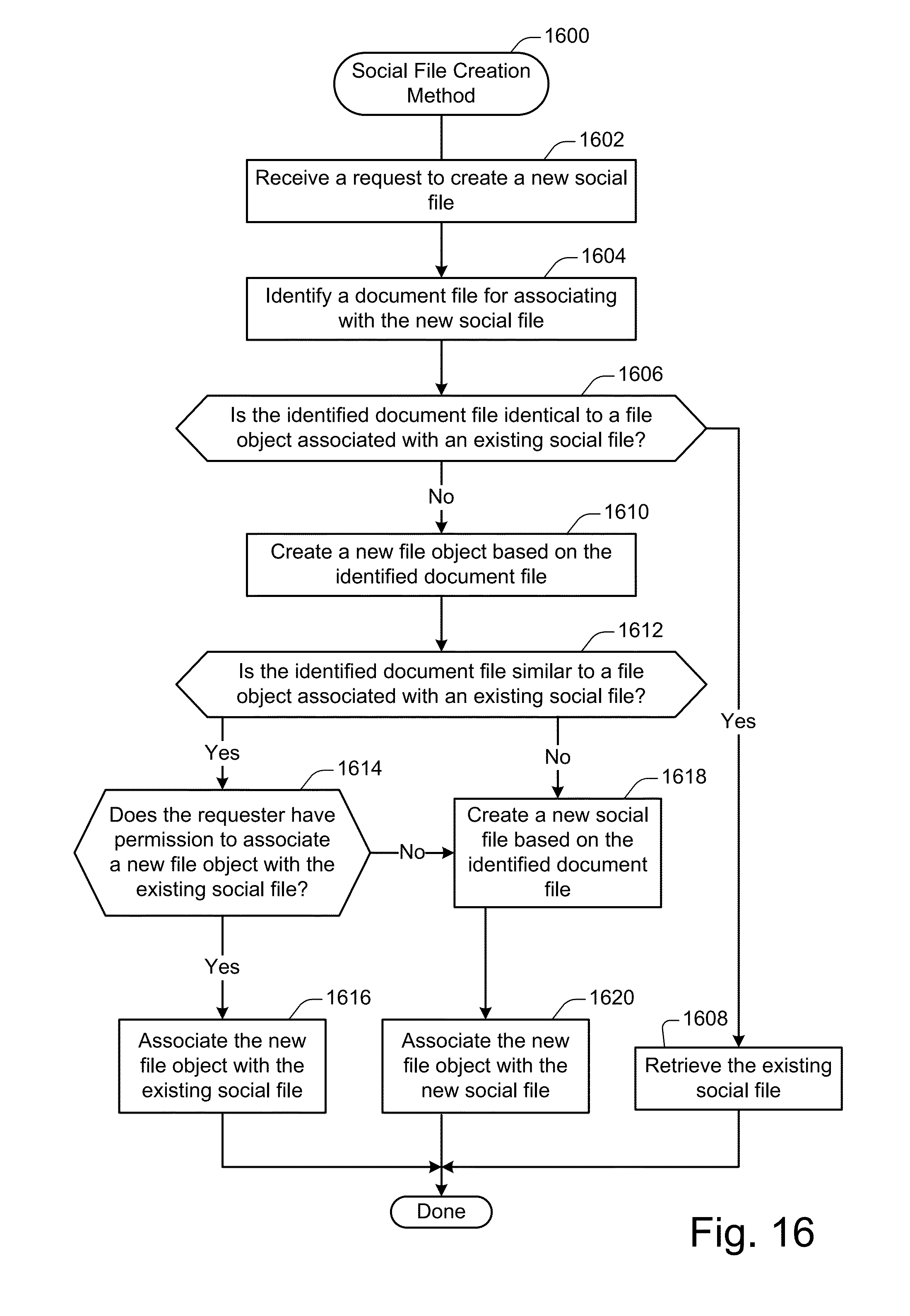 receive a first document file, the first document file capable of being displayed on a display device; store the first document file on a storage medium accessible via the network; select a second document file stored on the storage medium; compare the first document file with the second document file to identify one or more similarities between the first document file and the second document file; designate the first document file as being associated with a social file, the social file providing access to the first document file within a social network, the social file capable of being accessed by user accounts associated with the social network; and store a reference to the social file as a first one of a plurality of feed items in a feed table in a database, the feed items capable of being published in an information feed displayed on a display device. 11. The computing system recited in determine that the first document file is not similar to an existing document file; and create the social file based on the first document file. 12. The computing system recited in identify first metadata for the first document file; and retrieve second metadata for the second document file, wherein the comparison comprises comparing at least a portion of the identified metadata with at least a portion of the retrieved metadata. 13. The computing system recited in determine, based on the comparison of the first document file with the second document file, whether a portion of the first document file is identical to a portion of the second document file. 14. The computing system recited in determining, based on the comparison of the first document file with the second document file, whether a portion of the first document file is similar but not identical to a portion of the second document file. 15. The computing system recited in designate the second document file as being associated with the social file, the social file providing access to the second document file via the social network. 16. The computing system recited in 17. One or more computer readable media having instructions stored therein for performing a method, the method comprising: