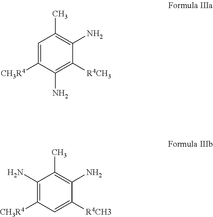 Another embodiment is where the mono-aromatic primary diamine of Formulas IIIa or IIIb is selected from the group consisting of 3,5-diethyltoluene-2,4-diamine, 3,5-diethyltoluene-2,6-diamine or mixtures thereof. The mixture of these two compounds is commonly named DEDTA and an example of a commercial product is Ethacure 100 from Albemarle Corporation.