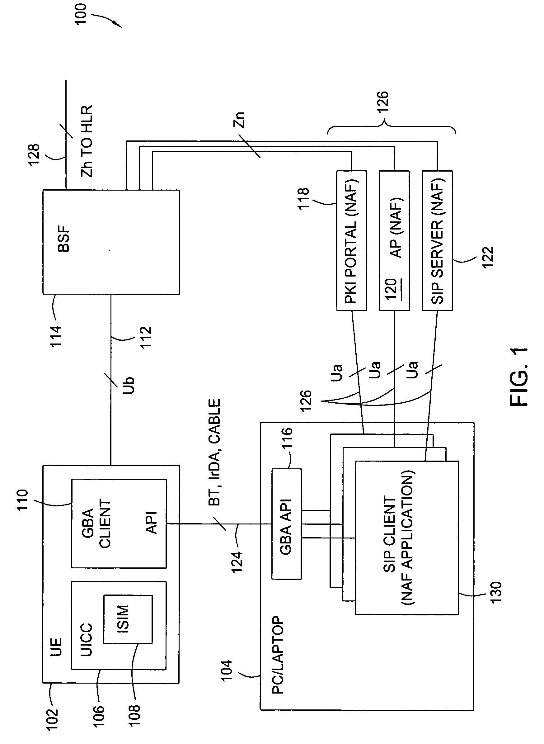 The generic bootstrapping architecture application programming interface 116 in the user equipment personal computer 104 communicates with the generic bootstrapping architecture client 110 in the mobile phone or user equipment 102 over a local connection 124. This connection is used to request generic bootstrapping architecture credentials by applications that want to use them in an authentication process with a server that supports the generic bootstrapping architecture, i.e., towards an NAF. For example, in a Windows® environment, the generic bootstrapping architecture application programming interface could be a service, for example