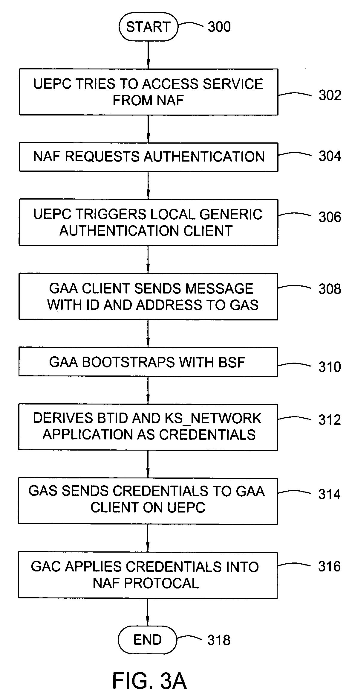In another embodiment of the invention, the steps that are completed when the user equipment personal computer 104 wants to authenticate to a network application function 126 are shown in FIG. 3A. The method begins at step 300 and at step 302 the user equipment personal computer 104 tries to access the service provided by the network application function. The network application function then requests authentication from the user equipment personal computer 104 at step 304. The authentication mechanism may be http-digest, TLS, SASL, or another known authentication mechanism compatible with the present invention. At step 306, the user equipment personal computer triggers the local generic authentication architecture client, which starts fetching new valid credentials from the user equipment mobile terminal. At step 308, the generic authentication architecture client in the user equipment personal computer 104 sends a message containing an NAF identifier. At step 310, the generic authentication architecture server starts bootstrapping (Ub) communication with the bootstrapping server function 114. The bootstrapping server function server address is generally pre-configured or derived from the interoperable message passing interface (IMPI). In this phase, the universal subscriber identity module authentication using authentication and key agreement (AKA) is carried out. Also, this bootstrapping mechanism then derives a BTID (a username) and a Ks (a master password) as GBA credentials. At step 312, the generic authentication architecture server derives the network application specific GBA credentials (Ks_NAF). At step 314, the generic authentication architecture server sends the network application function specific GBA credentials (BTID, Ks_NAF) to generic authentication architecture client 130 in the user equipment personal computer 104 in the response. At step 316, the generic authentication architecture client 130 then applies these credentials into the network application function 126 specific authentication protocol properly, and the method generally ends at step 318.