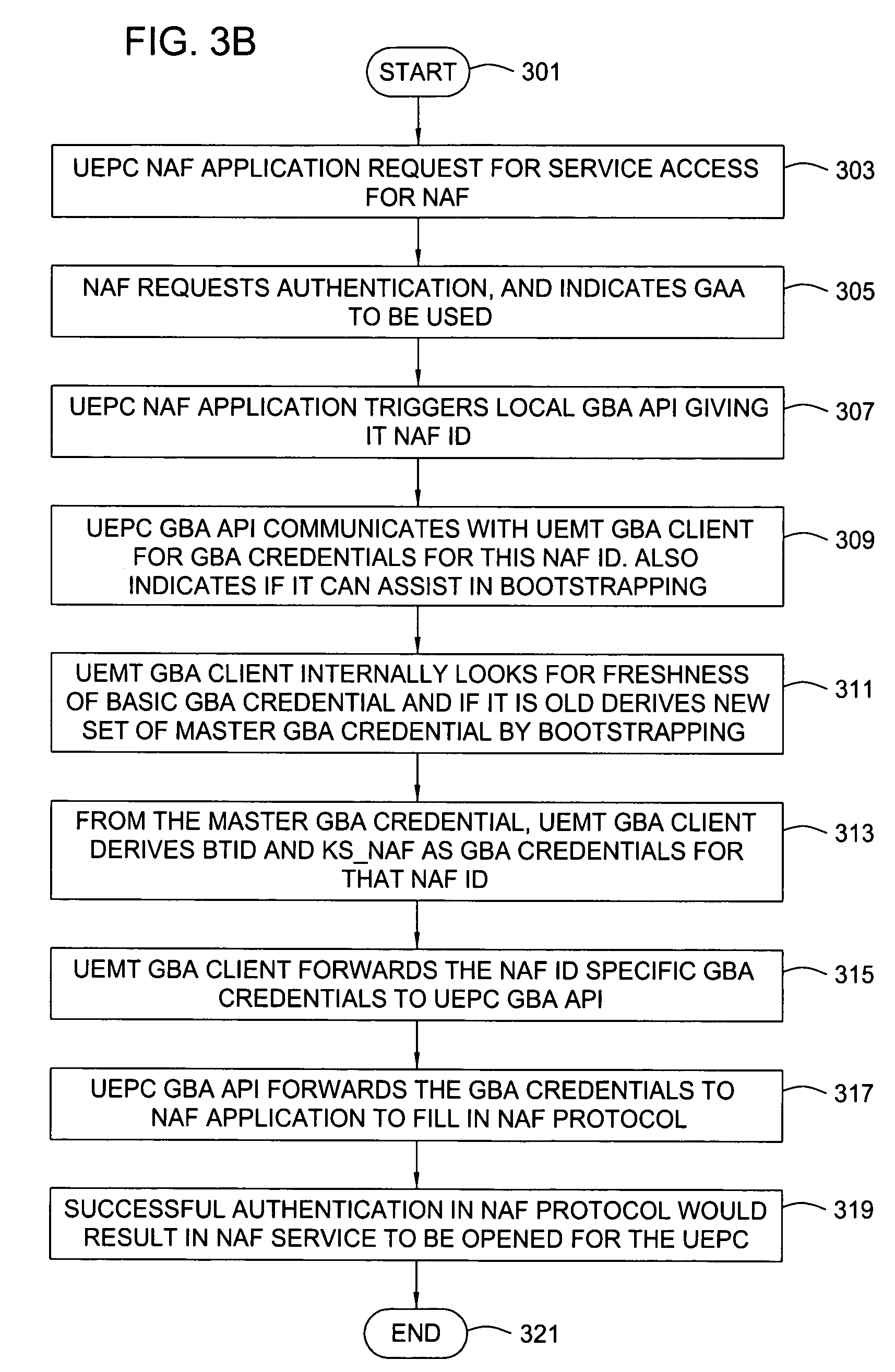 In another embodiment of the invention, the steps that are completed when the user equipment personal computer 104 wants to authenticate to a network application function 126 are shown in FIG. 3B. The method begins at step 301 and continues to step 303, where the user equipment personal computer requests service access for the network application function. The method then continues to step 305, wherein the network application function requests authentication from the user equipment personal computer and indicates the generic authentication architecture to be used. The method then continues to step 307, where the user equipment personal computer network application function triggers the local generic bootstrapping architecture application programming interface giving it the network application function identifier. Thereafter, the method continues to step 309, where the user equipment personal computer generic bootstrapping architecture application programming interface communicates with the user equipment mobile terminal generic bootstrapping architecture client for generic bootstrapping architecture credentials corresponding to the network application function identifier. Thereafter, the method continues to step 311, where the user equipment mobile terminal generic bootstrapping architecture client internally looks for freshness of basic generic bootstrapping architecture credentials, and if the credentials are old, then it derives a new set of master generic bootstrapping architecture credentials (B-TID, Ks) through bootstrapping. The method then continues to step 313, where the master generic bootstrapping architecture credential (Ks), the user equipment mobile terminal generic bootstrapping architecture client derives the network application function specific generic bootstrapping architecture specific credentials (Ks_NAF) for the particular network application function identifier. The method continues to step 315, where the user equipment mobile terminal generic bootstrapping architecture client forwards the network application function specific generic bootstrapping architecture credentials to the user equipment personal computer generic bootstrapping architecture application programming interface. The user equipment personal computer generic bootstrapping architecture application programming interface then forwards the generic bootstrapping architecture credentials to the network application function application to fill in the network application function protocol at step 317. Thereafter, successful authentication in the network application function protocol will result in network application function service being opened in the user equipment personal computer at step 319, and the method ends at step 321.