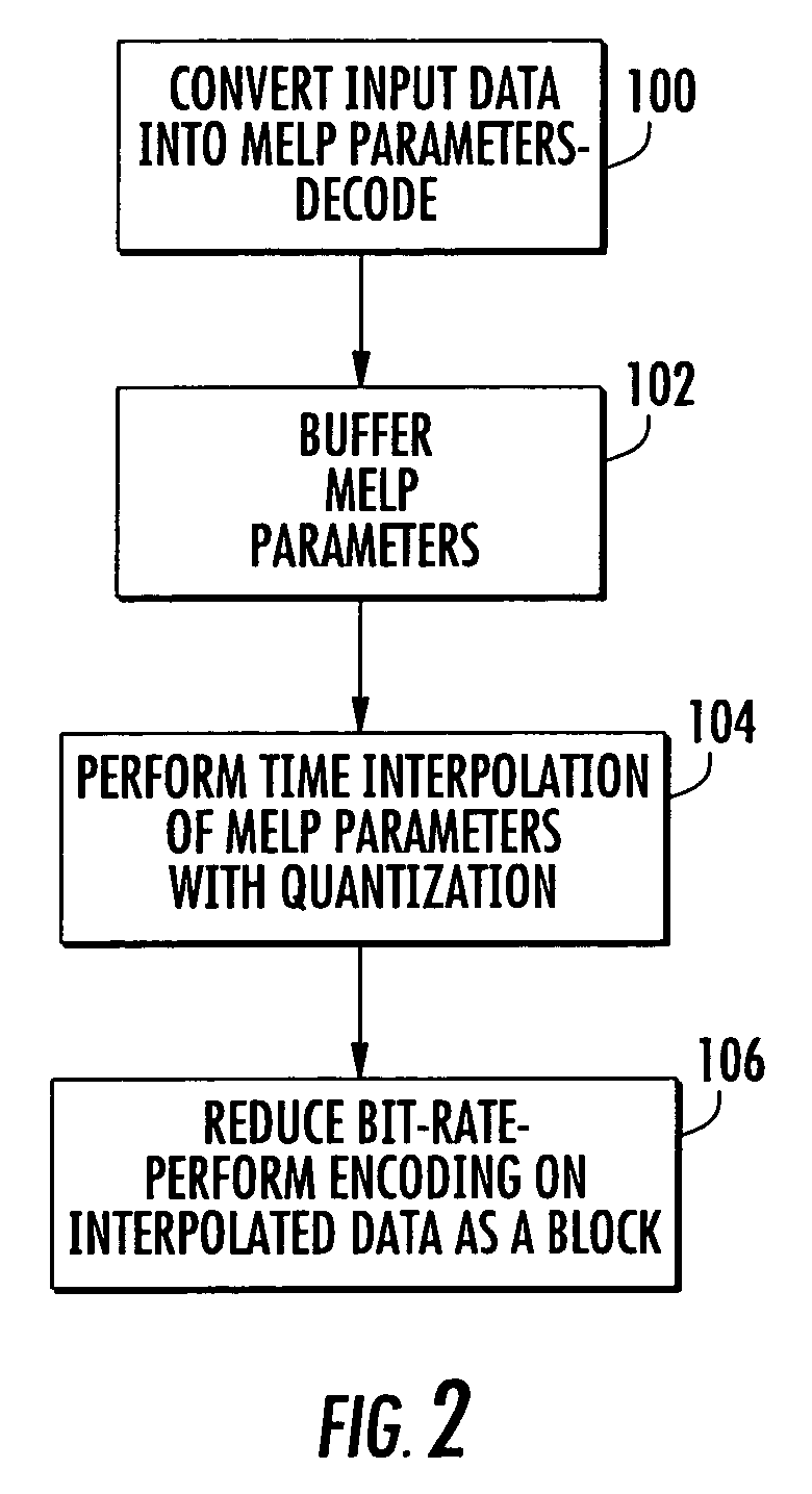 quantizing MELP parameters for a block of voice data into quantized MELP parameters; encoding within an encoder circuit the quantized MELP parameters into a serial bit stream of encoded data having a first bit rate; converting the encoded data into MELP parameters; decoding the MELP parameters; buffering the decoded MELP parameters; generating perceptual inverse power spectrum weights using coefficients derived from line spectral frequencies and from the decoded MELP parameters; time interpolating the MELP parameters from frames of speech data using the inverse power spectrum weights; updating interpolation values as new MELP parameters if the number of speech frames exceeds a predetermined number and interpolating the new MELP parameters and iterating over the new MELP parameters; and encoding the interpolated data as a block of bits corresponding to frames of speech data and iterating to generate output speech samples having a second bit rate that is a multiple of the first bit rate, wherein the first and second bit rates are not the same. 2. The method according to 3. A method according to 4. A method according to 5. A method according to 6. A method according to 7. A method of transcoding Mixed Excitation Linear Prediction (MELP) encoded speech data, which comprises: