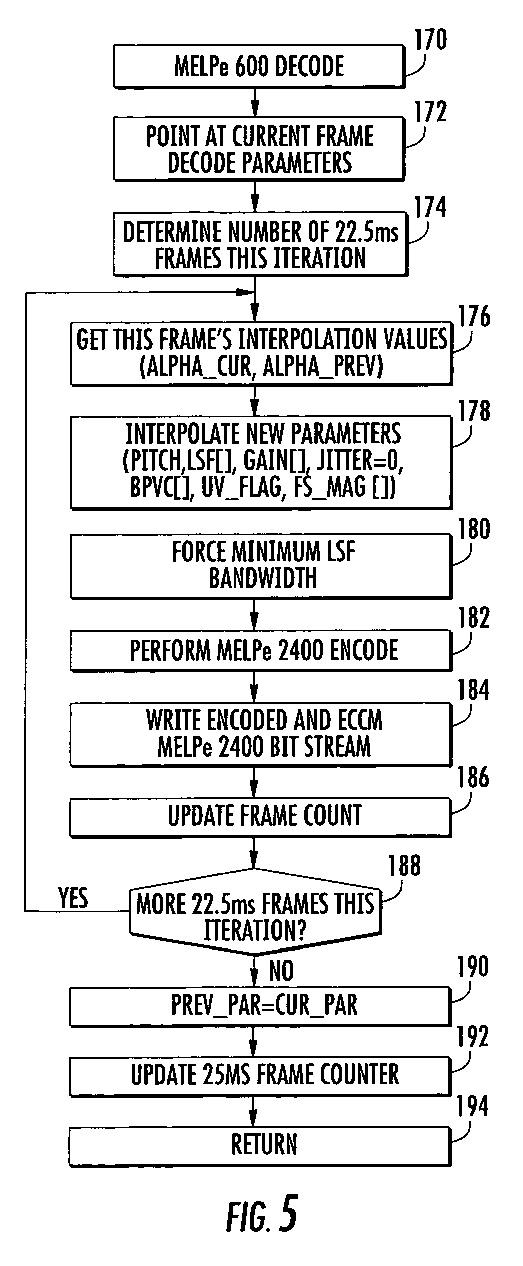 The present invention relates to communications, more particularly, the present invention relates to voice coders (vocoders) used in communications. Voice coders, also termed vocoders, are circuits that reduce bandwidth occupied by voice signals, such as by using speech compression technology, and replace voice signals with electronically synthesized impulses. For example, in some vocoders an electronic speech analyzer or synthesizer converts a speech waveform to several simultaneous analog signals. An electronic speech synthesizer can produce artificial sounds in accordance with analog control signals. A speech analyzer can convert analog waveforms to narrow band digital signals. Using some of this technology, a vocoder can be used in conjunction with a key generator and modulator/demodulator device to transmit digitally encrypted speech signals over a normal narrow band voice communication channel. As a result, the bandwidth requirements for transmitting digitized speech signals are reduced. A new military standard vocoder (MIL-STD-3005) algorithm is referred to as the Mixed Excitation Linear Prediction (MELP), which operates at 2.4 Kbps. When a vocoder is operated using this algorithm, it has good voice quality under benign error channels. When the vocoder is subjected to a HF channel with typical power output of a ManPack Radio (MPR), however, the vocoder speech quality is degraded. It has been found that a 600 bps vocoder provides a significant increase in secure voice availability relative to the 2.4 Kbps vocoder. A need exists for a low rate speech vocoder with the same or better speech quality and intelligibility as compared to that of a typical 2.4 Kbps Linear Predictive Coding (LPC10e) based system. A MELP speech vocoder at 600 bps would take advantage of robust and lower bit-rate waveforms than the current 2.4 Kbps LPC10e standard, and also benefit from better speech quality of the MELP vocoder parametric model. Tactical ManPack Radios (MPR) typically require lower bit-rate waveforms to ensure 24-hour connectivity using digital voice. Once HF users receive reliable, good quality digital voice, wide acceptance will provide for better security by all users. An HF user will also benefit from the inherent digital squelch of digital voice and the elimination of atmospheric noise in the receive audio. Current 2.4 Kbps vocoders using the LPC10e standard have been widely used within encrypted voice systems on HF channels. A 2.4 Kbps system, however, allows for communication on narrow-band HF channels with only limited success. A typical 3 kHz channel requires a relatively high signal-to-noise ratio (SNR) to allow reliable secure communications at the standard 2.4 Kbps bit rate. Even use of MIL-STD-188-110B waveforms at 2400 bps would still require a 3 kHz SNR of more than +12 dB to provide a usable communication link over a typical fading channel. While HF channels typically permit a 2400 bps channel using LPC10e to be relatively error free, the voice quality is still marginal. Speech intelligibility and acceptability of these systems are limited to the amount of background noise level at the microphone. The intelligibility is further degraded by the low-end frequency response of communications handsets, such as the military H-250. The MELP speech model has an integrated noise pre-processor that improves sensitivity in the vocoder to both background noise and low-end frequency roll-off. The 600 bps MELP vocoder would benefit from this type of noise pre-processor and the improved low-end frequency insensitivity of the MELP model. In some systems vocoders are cascaded, which degrades the speech intelligibility. A few cascades can reduce intelligibility below usable levels, for example, RF 6010 standards. Transcoding between cascades greatly reduces the intelligibility loss in which digital methods are used instead of analog. Transcoding between vocoders with different frame rates and technology has been found difficult, however. There are also known systems that transcode between “like” vocoders to change bit rates. One prior art proposal has created transcoding between LPC10 and MELPe. A source code can also provide MELP transcoding between MELP1200 and 2400 systems. A vocoder and associated method transcodes Mixed Excitation Linear Prediction (MELP) encoded data for use at different speech frame rates. Input data is converted into MELP parameters used by a first MELP vocoder. These parameters are buffered and a time interpolation is performed on the parameters with quantization to predict spaced points. An encoding function is performed on the interpolated data as a block to produce a reduction in bit-rate as used by a second MELP vocoder at a different speech frame rate than the first MELP vocoder. In yet another aspect, the bit-rate is transcoded with a MELP 2400 vocoder to bit-rates used with a MELP 600 vocoder. The MELP parameters can be quantized for a block of voice data from unquantized MELP parameters of a plurality of successive frames within a block. An encoding function can be performed by obtaining unquantized MELP parameters and combining frames to form one MELP 600 BPS frame, creating unquantized MELP parameters, quantizing the MELP parameters of the MELP 600 BPS frame, and encoding them into a serial data stream. The input data can be converted into MELP 2400 parameters. The MELP 2400 parameters can be buffered using one frame of delay. Twenty-five millisecond spaced points can be predicted, and in one aspect, the bit-rate is reduced by a factor of four. In yet another aspect, a vocoder and associated method transcodes Mixed Excitation Linear Prediction (MELP) encoded data by performing a decoding function on input data in accordance with parameters used by a second MELP vocoder at a different speech frame rate. The sampled speech parameters are interpolated and buffered and an encoding function on the interpolated parameters is performed to increase the bit-rate. T