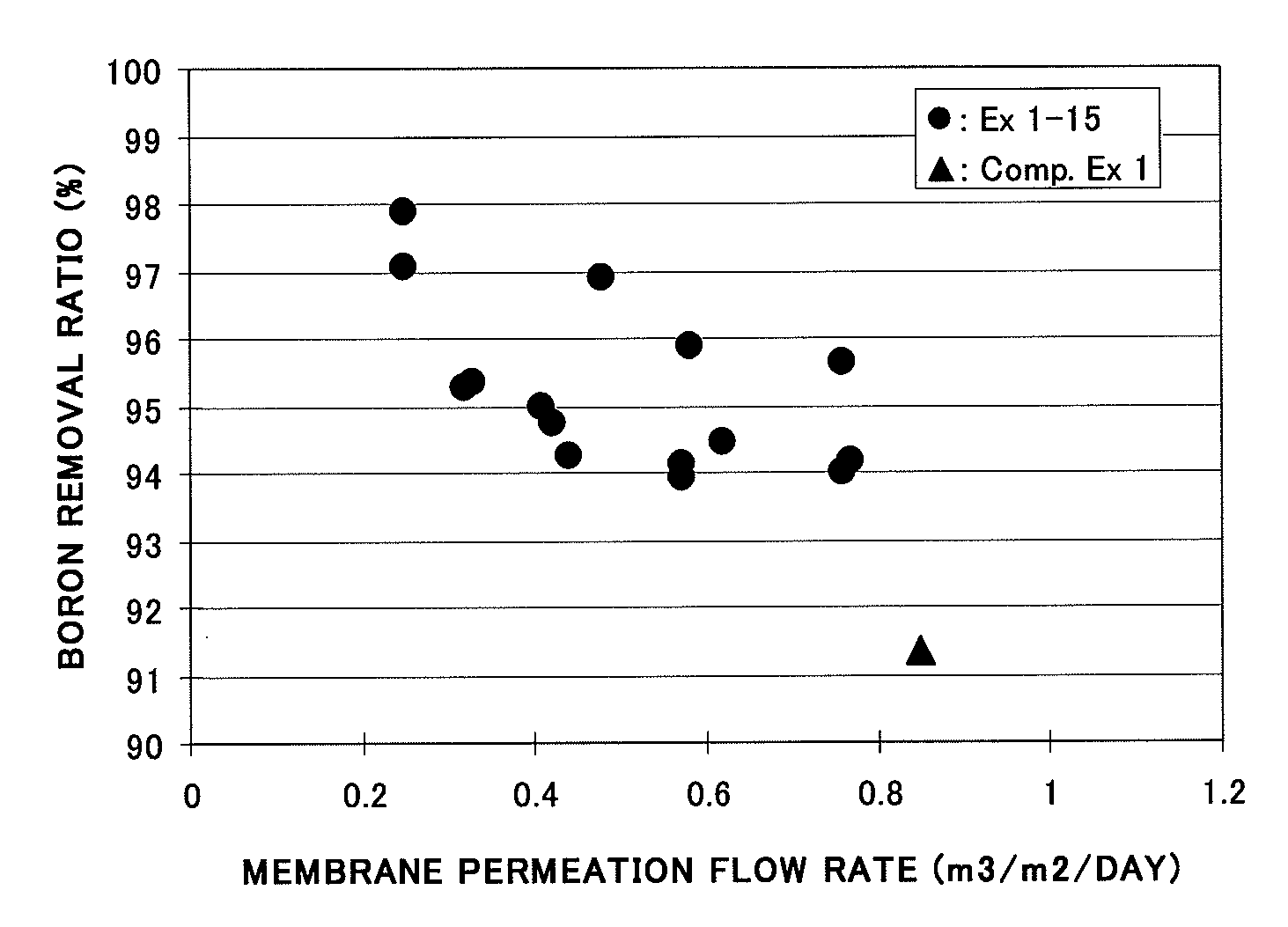 Membrane Permeation Flow Rate When water (seawater) was supplied, the amount (cubic meter) of water passing through the membrane is determined per square meter of the membrane surface per day to give the membrane permeation flow rate (m3/m2/day). Boron Removal Ratio The boron concentration of each of the water supplied and the permeate is analyzed with an ICP emission spectrometer, and the boron removal ratio is determined according to the following formula: