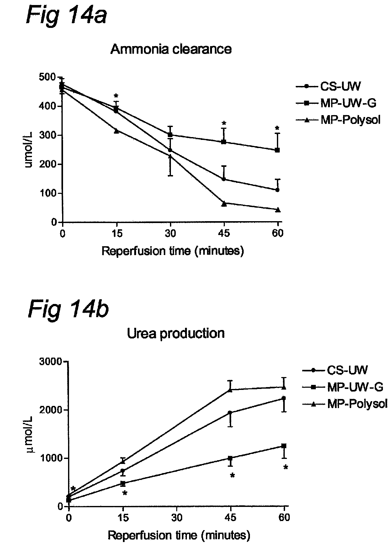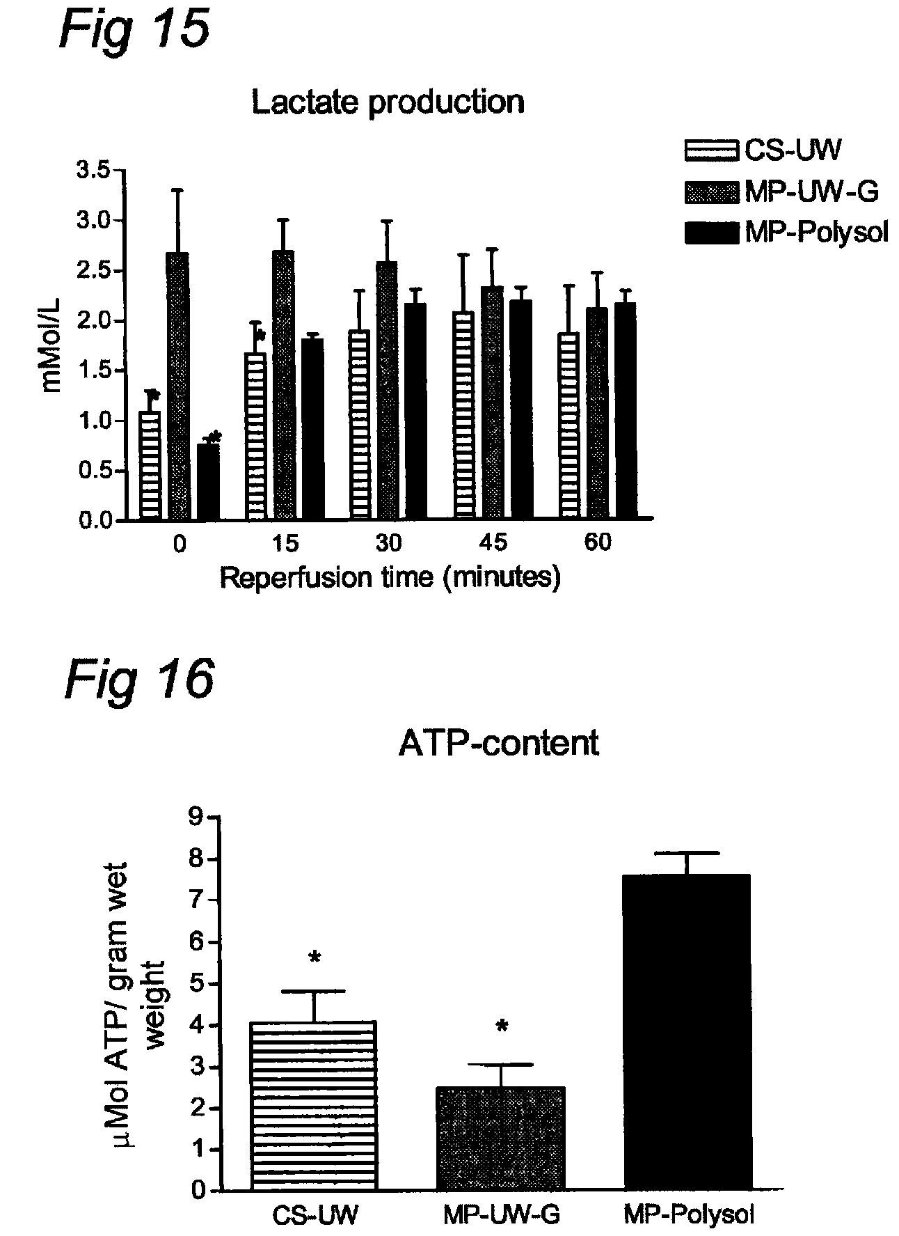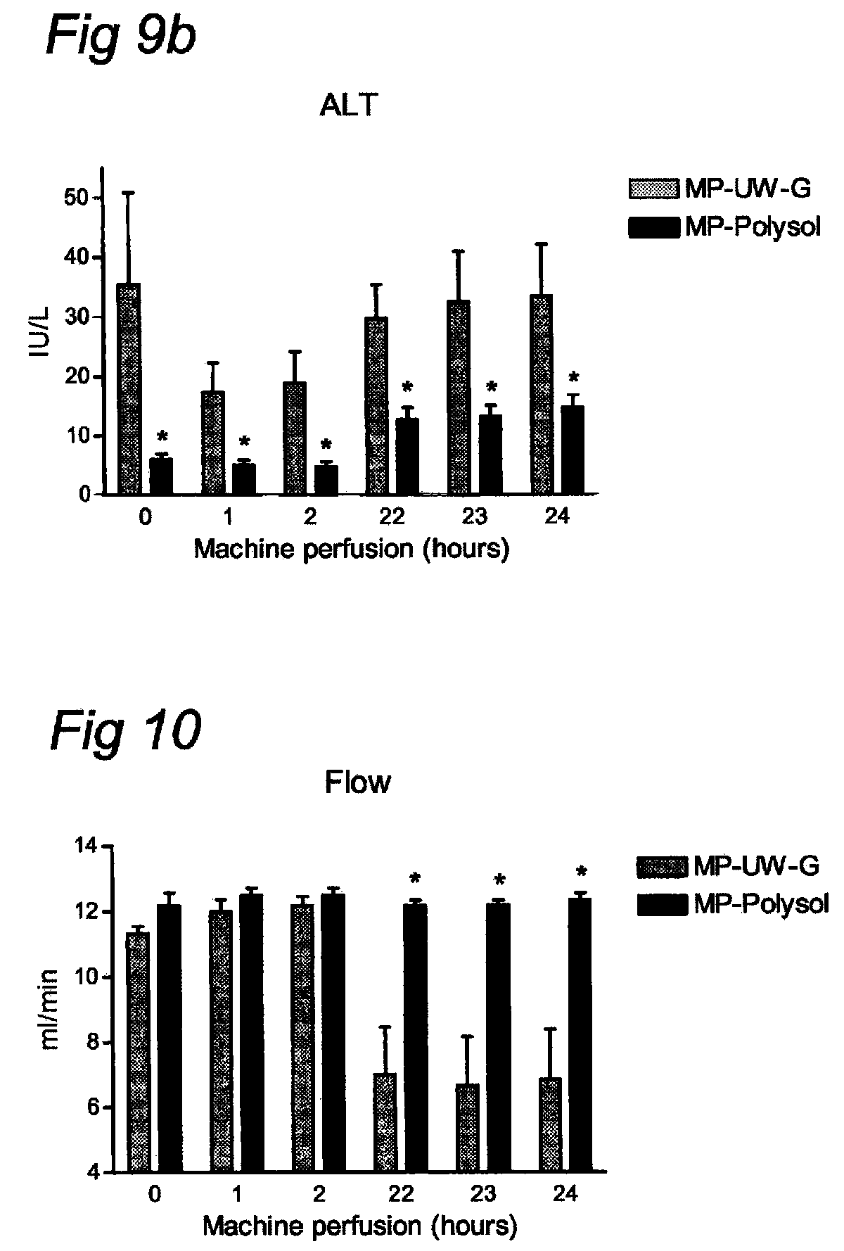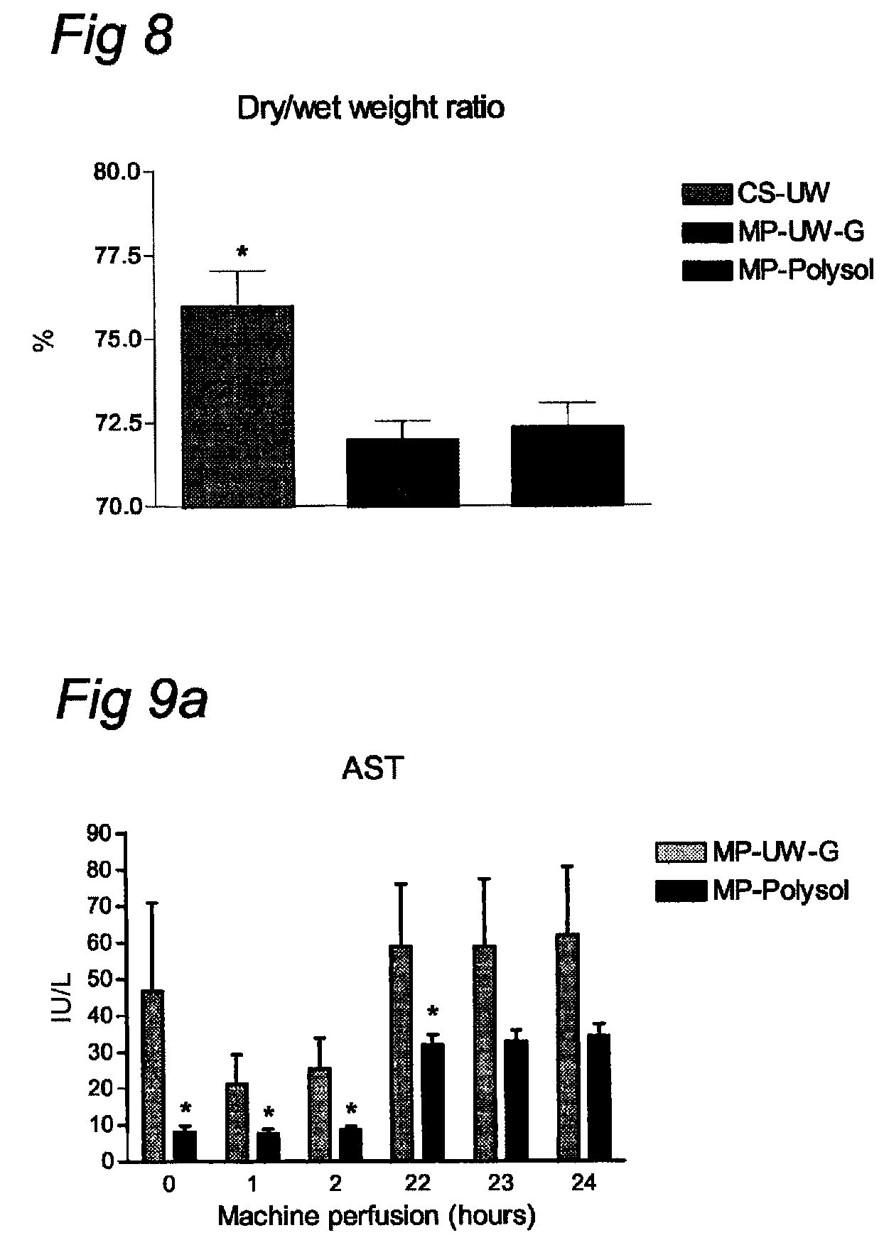 The most important components of UW, UW-G and Polysol Components: UW UW-G Polysol Colloid HES (5%) HES (5%) PEG (1%) Na/K ratio 30/120 mM 125/25 mM 120/20 mM Buffer KH2PO4 HEPES HEPES KH2PO4 KH2PO4 Histidine Antioxidants Allopurinol Allopurinol Glutathion Glutathion Glutathion Alpha-tocopherol Ascorbic acid Energy Glucose Glucose substrates Impermeants Lactobionate Na-Gluconate Na-Gluconate K-Gluconate K-Gluconate Mg-Gluconate Raffinose Raffinose Raffinose Trehalose Amino acids — — Various Vitamines — — Various pH-indicator — — Phenol-red Example 4