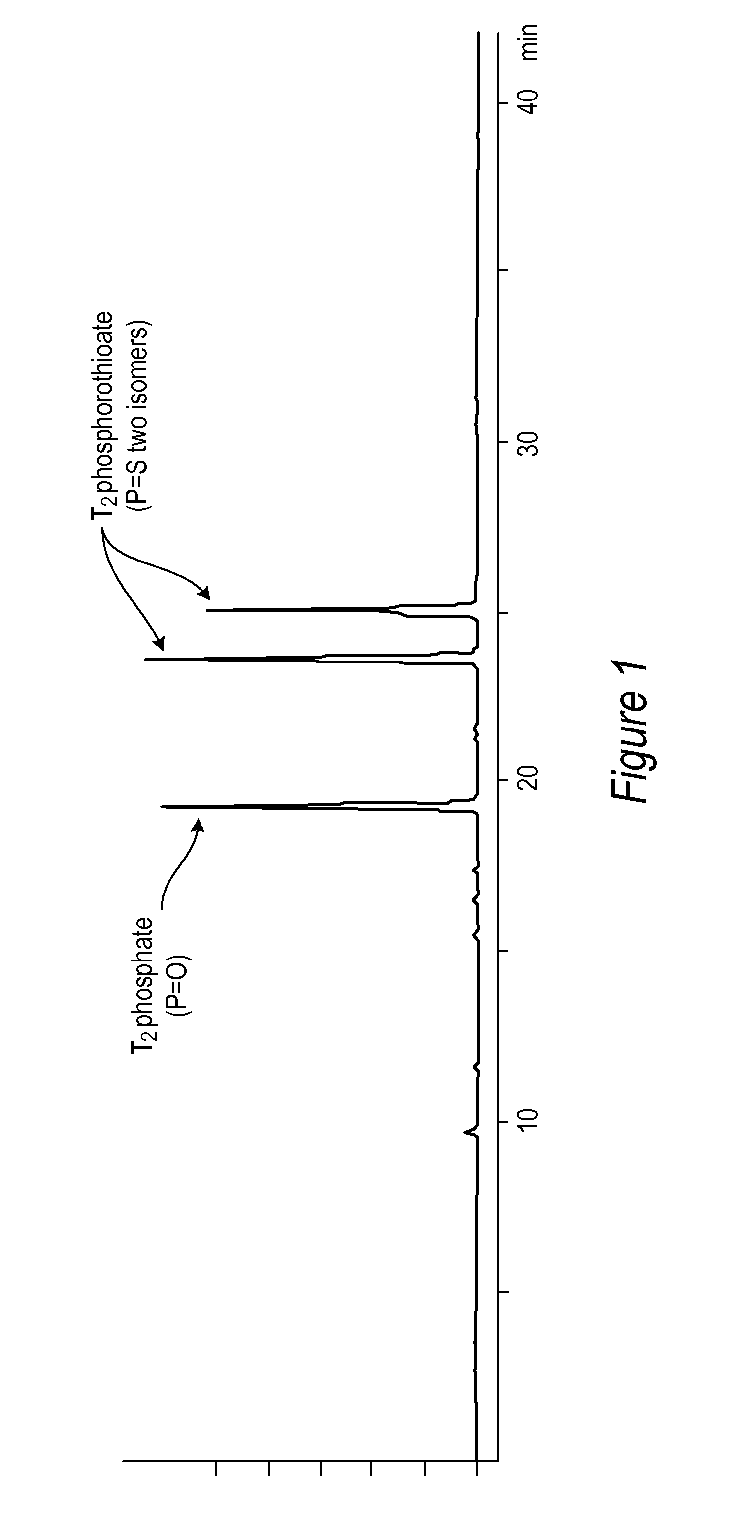 It is important to note that even very small increases in the percentage of internucleotide bond that is sulfurized at each step can have drastic and significant impact on the overall sulfurization of the desired oligonucleotide product. For clinical application it is desirable to maximize the overall sulfurization of the molecule (PS) and minimize the oxidation (PO). For oligonucleotides used in clinical applications, a typical sequence can have at least 20 sulfurized internucleotide bonds. The overall effective sulfurization of the molecule is calculated by taking the single step sulfurization yield and raising it to the power of the number sulfurized internucleotide bonds. As an example a 99.0% stepwise sulfurization for 20 internucleotide bonds results in an overall sulfurization efficiency of 82%; whereas, a 99.8% stepwise sulfurization for 20 internucleotide bonds results in an overall sulfurization efficiency of 96%. In this example there is a significant and important difference between an oligonucleotide that 82% sulfurized internucleotide bonds and an oligonucleotide that has 96% sulfurized internucleotide bonds; this difference can have a significant clinical impact.
