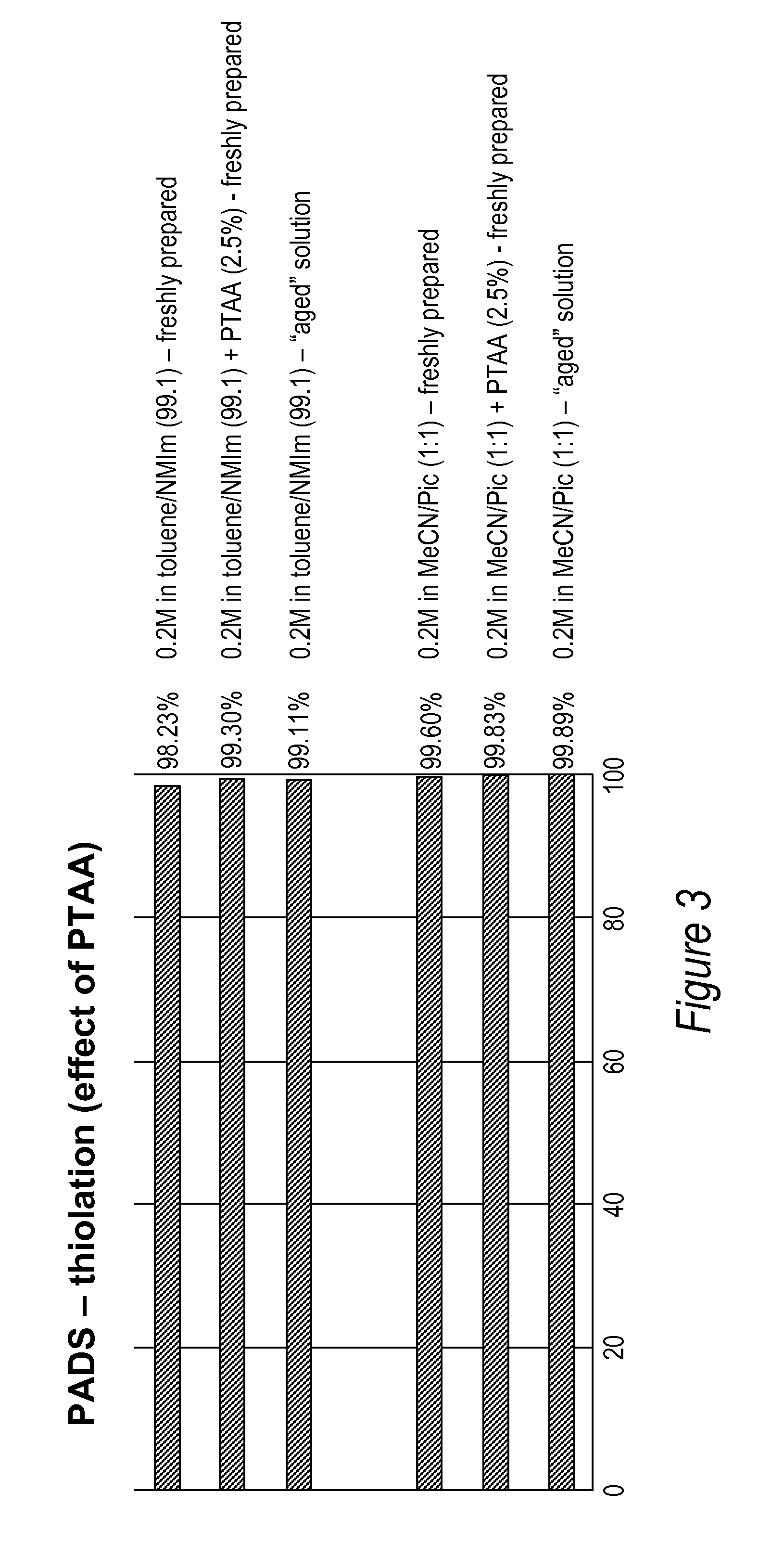 A series of experiments were carried out to evaluate the efficiency of PADS thiolation in conjunction with the use or without the use of phenylthioacetic acid and N-methylimidazole on a TT dimer in toluene. The solutions containing optionally the phenylthioacetic acid were used immediately after preparation or “aged” for 24 hrs prior use in the thiolation reaction. The efficiency of the thiolation reaction was calculated as explained above by determining the ratio of phosphodiester to phosphorothioatediester by peak integration on an Agilent HPLC. The results are summarized in the FIGS. 3, 4a and 4b.