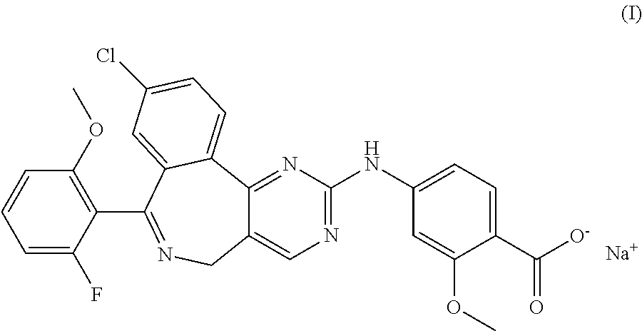 WO 05/111039, U.S. Pat. No. 7,572,784, US Publication No. 2007/0185087, US Publication No. 2008/0045501, WO 08/063525, US Publication No. 2008/0167292, and US Publication No. 2010/0310651 hereby incorporated by reference in their entirety, disclose compounds that inhibit Aurora kinase enzymes. For example, the compound 4-{[9-chloro-7-(2-fluoro-6-methoxyphenyl)-5H-pyrimido[5,4-d][2]benzazepin-2-yl]amino}-2-methoxybenzoic acid of formula (II):