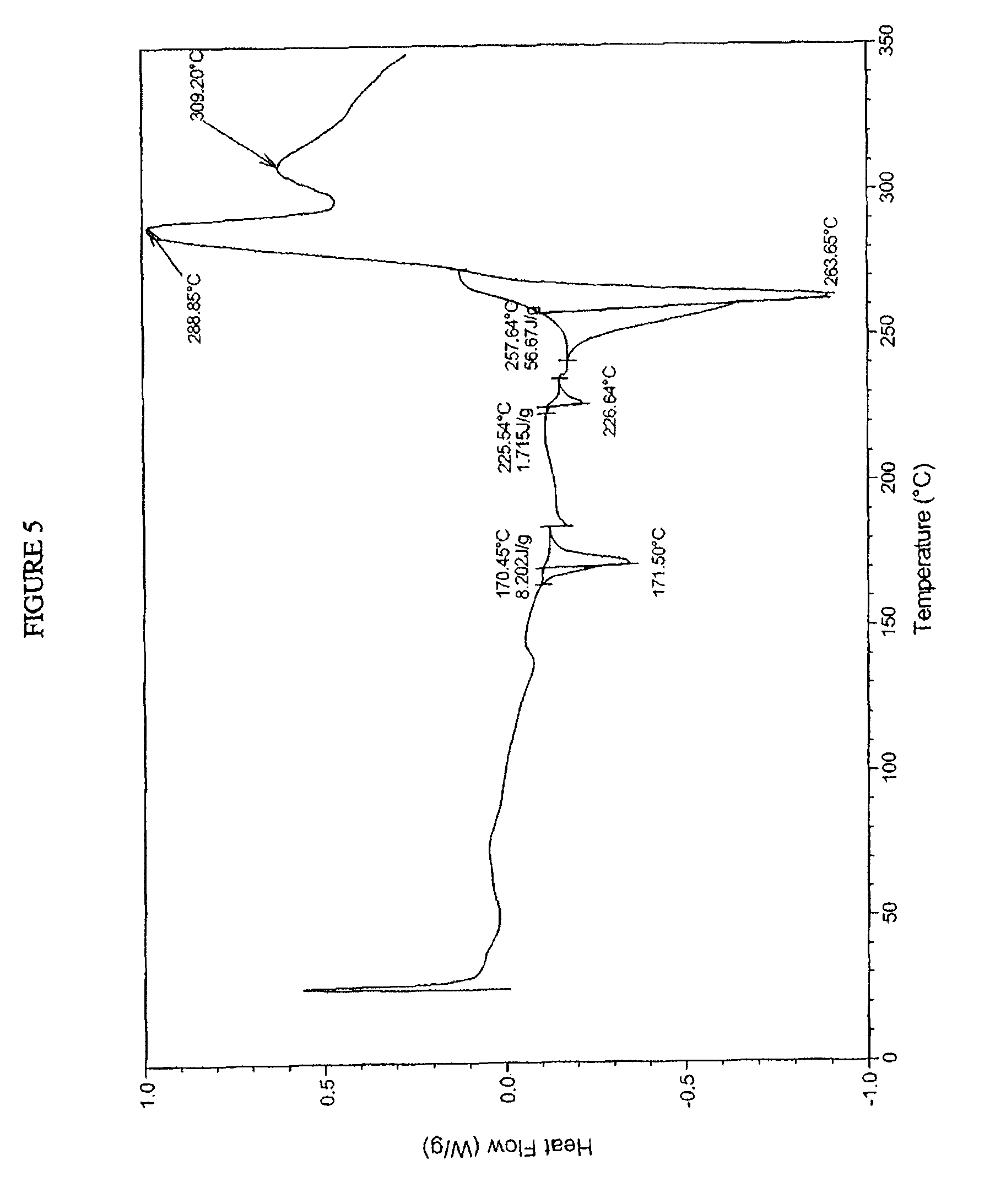 • ii) a TA Instruments DSC Q2000 differential scanning calorimeter. Between 1 mg and 2 mg of sample is sealed in an aluminum pan with a lid. The sample is heated at a ramp rate of 10° C. per minute between 25° C. and 350° C., while the nitrogen sample puge is kept constant at 50 mL/min. The thermograms are analyzed using Thermal Advantage for Q Series software.