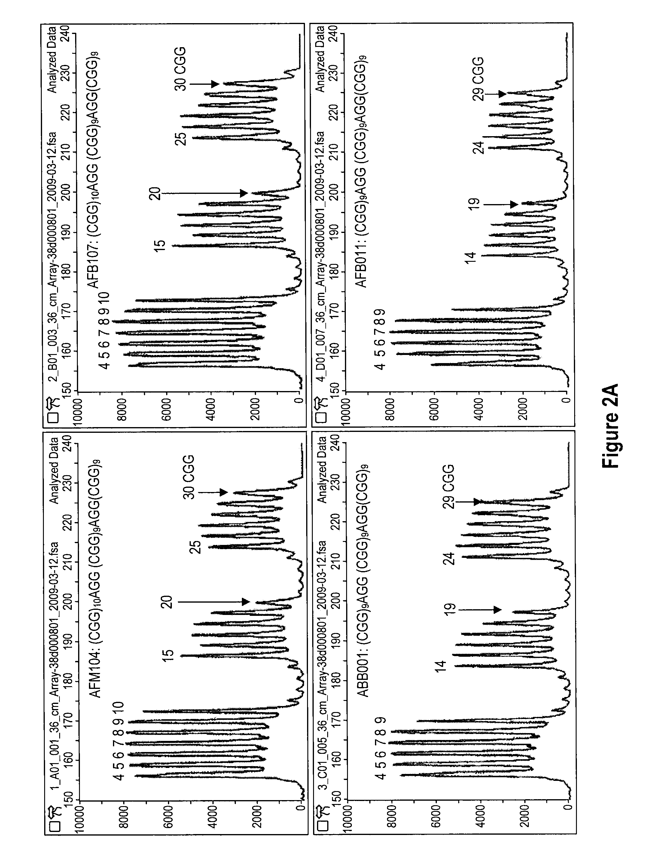 3. The method of either of embodiments 1 or 2, comprising deriving information about whether an interruptor sequence is present in the CGG-rich region from said representation. 4. The method of either of embodiments 1 or 2, comprising deriving information about where within the CGG-rich region an interruptor sequence is located from said representation. 5. The method of either of embodiments 1 or 2, wherein the interruptor sequence is an AGG element. 6. The method of either of embodiments 1 or 2, further comprising deriving information about CGG repeat number from said representation. 7. The method of embodiment 6, wherein said information about CGG repeat number determines whether the CGG-rich repeat region comprises more or less than 200 CGG repeats. 8. The method of embodiment 6, wherein said information about CGG repeat number determines the number of CGG repeats present in the CGG-rich region. 9. The method of either of embodiments 1 or 2, with the proviso that an external standard or calibrator is not used in the deriving of information about whether an interruptor sequence is present in the CGG-rich region or where within the CGG-rich region an interruptor sequence is located from said representation. 10. The method of either of embodiments 1 or 2, wherein the CGG-rich region is comprised by a 5′ UTR of FMR1. 11. The method of either of embodiments 1 or 2, wherein the CGG-rich region is comprised by a 5′ UTR of FMR2. 12. The method of either of embodiments 1 or 2, wherein the high resolution technique can resolve products differing in length by 3 nucleotides or base pairs. 13. The method of either of embodiments 1 or 2, wherein the high resolution technique is capillary electrophoresis. 14. The method of either of embodiments 1 or 2, wherein the high resolution technique is polyacrylamide gel electrophoresis. 15. The method of either of embodiments 1 or 2, wherein the representation is an electropherogram. 16. The method of either of embodiments 1 or 2, wherein the representation is an image or graph recorded from photons or beta particles emitted by the products of the PCR or by dye molecules bound to the products. 17. The method of either of embodiments 1 or 2, wherein deriving information about whether an interruptor sequence is present in the CGG-rich region or where within the CGG-rich region an interruptor sequence is located from said representation comprises determining positions where binding of the first primer was substantially reduced. 18. The method of either of embodiments 1 or 2, wherein deriving information about whether an interruptor sequence is present in the CGG-rich region or where within the CGG-rich region an interruptor sequence is located from said representation comprises determining one or more product lengths at which the amount of product is substantially reduced compared to the amount of neighboring length products. 19. The method of either of embodiments 1 or 2, wherein deriving information about whether an interruptor sequence is present in the CGG-rich region or where within the CGG-rich region an interruptor sequence is located from said representation comprises determining one or more product lengths at which the amount of product is reduced by at least 50% compared to the amount of neighboring length products. 20. The method of either of embodiments 1 or 2, wherein deriving information about whether an interruptor sequence is present in the CGG-rich region or where within the CGG-rich region an interruptor sequence is located from said representation comprises determining one or more product lengths at which the amount of product is reduced by at least 90% compared to the amount of neighboring length products. 21. The method of either of embodiments 1 or 2, wherein deriving information about whether an interruptor sequence is present in the CGG-rich region or where within the CGG-rich region an interruptor sequence is located from said representation comprises determining one or more product lengths at which the amount of product is reduced by at least 25% compared to the amount of neighboring length products, wherein the CGG-rich region is from an individual heterozygous for the allele comprising the CGG-rich region. 22. The method of either of embodiments 1 or 2, wherein the first primer comprises four or five CGG or CCG repeats. 23. The method of either of embodiments 1 or 2, wherein the second primer is chosen from SEQ ID NOs 1-38. 24. The method of either of embodiments 1 or 2, wherein at least one of the primers comprises a radiologically or electromagnetically detectable moiety. 25. The method of either of embodiments 1 or 2, wherein at least one of the primers comprises a fluorophore. 26. The method of either of embodiments 1 or 2, wherein the method is an anchored assay. 27. The method of embodiment 26, wherein the first primer comprises a subsequence chosen from A, T, AG, CT, AGG, and CCT among or at the 3′ end of the CGG, CCG, GCG, CGC, GCC, or GGC repeats. 28. The method of embodiment 27, wherein the first primer comprises an A at the 3′ end of the CGG, CCG, GCG, CGC, GCC, or GGC repeats. 29. The method of embodiment 27, wherein the first primer comprises a CCT at the 3′ end of the CGG, CCG, GCG, CGC, GCC, or GGC repeats. 30. The method of embodiment 26, further comprising detecting at least one interruptor element comprised by the at least one CGG-rich region. 31. The method of embodiment 30, further comprising determining whether the sample comprises major and minor alleles with differently positioned interruptor elements. 32. The method of either of embodiments 1 or 2, wherein the method is a non-anchored assay. 33. The method of embodiment 2, wherein the first primer and third primer are provided at concentrations such that the third primer is at least 100-fold more abundant than the first primer by molarity. 34. The method of embodiment 2, wherein the first primer and third primer are provided at concentrations such th