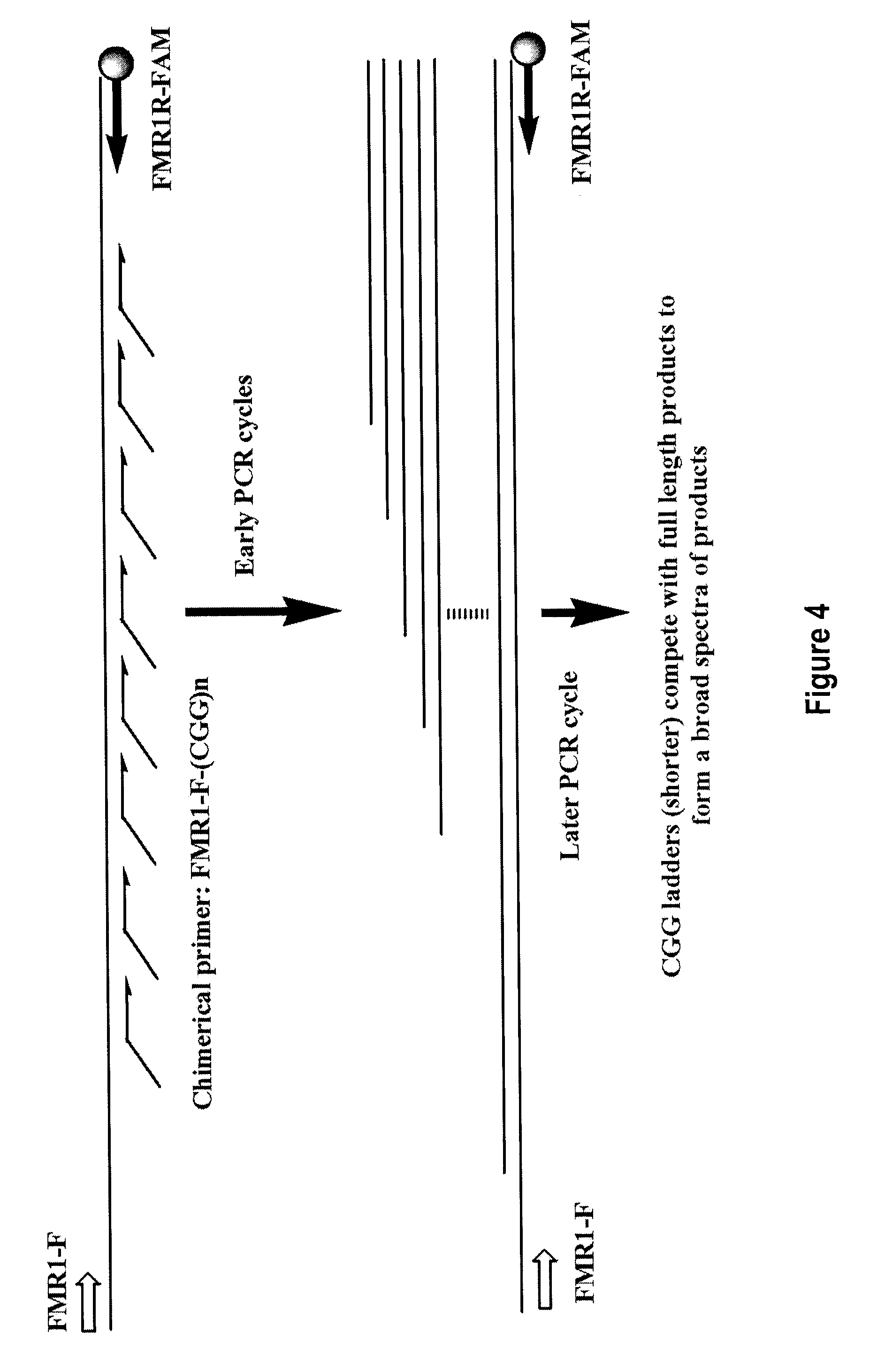 A template comprising (CGG)10AGG(CGG)9AGG(CGG)9(SEQ ID NO: 42) is shown. It represents a possible CGG repeat region in the 5′ UTR of FMR1. The primer Tag-(GCC)4can bind internally at multiple positions in the repeat region; with the FAM labeled forward primer (FAM-FX-F), which anneals upstream of the CGG repeat region, it can amplify a plurality of PCR products. The shortest CGG amplicon will have 4 CGG repeats and the longest CGG amplicon will comprise the full length of SEQ ID NO: 40. Any products that are significantly longer than the full length products are considered non-specific products.