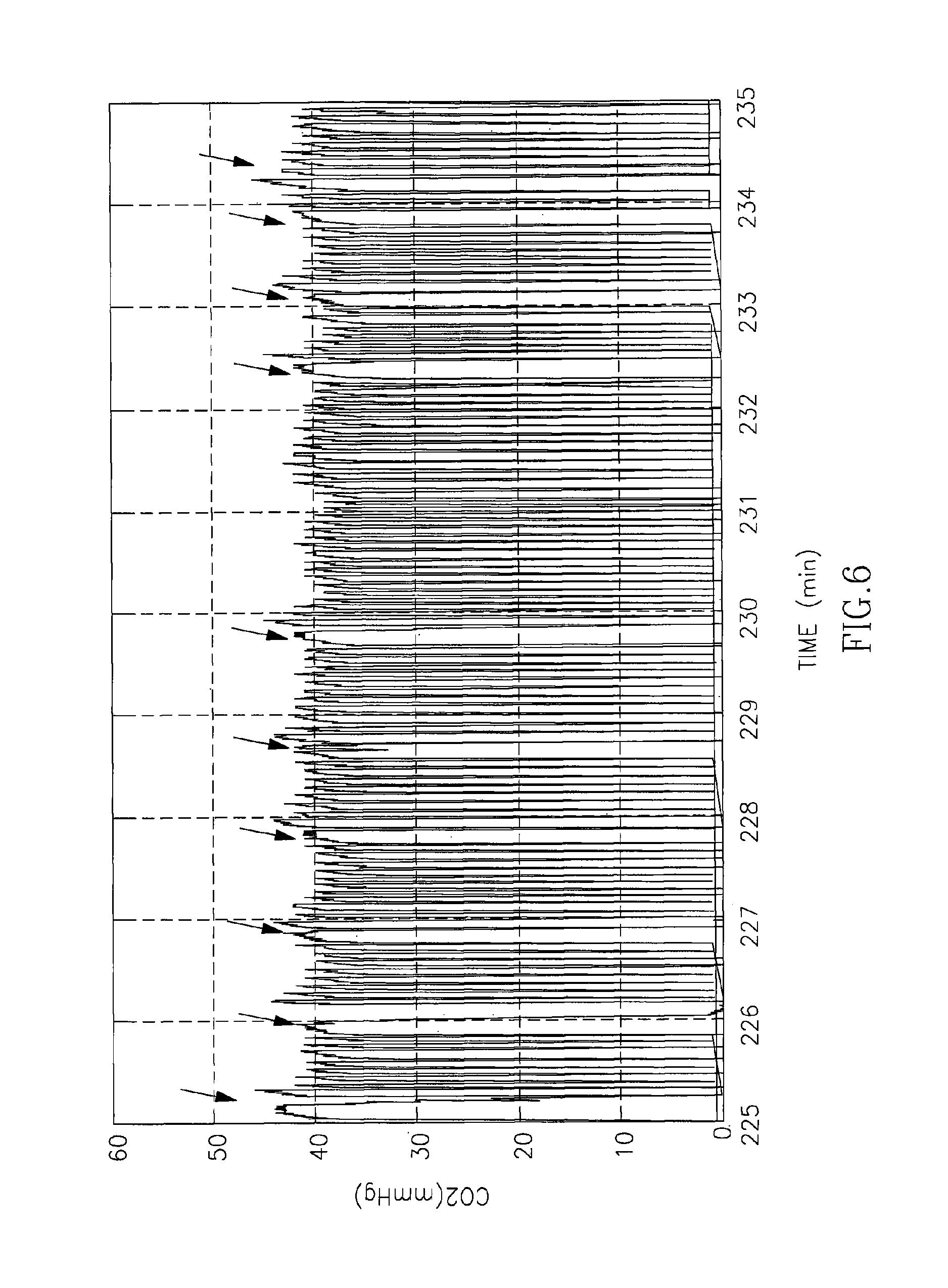 The prevalence and frequency of the waveforms characteristics, such as the above mentioned events as an indicator may be different for different ventilator modes. In other words, depending on the ventilator mode the event (for example, “sigh event”) frequency may have a different meaning. One could also perform coordinated changes in the ventilator parameters/modes (for example, reductions of pressure support) and evaluate the consequent change in event pattern and accordingly continue or stop the process. The processing logic may be further configured to provide the signal to the ventilator based on other parameters, in addition to the characteristics of the CO2 waveforms. Such parameters may include general patient parameters, such as age, medical condition, medical history, medications or any other parameter. The parameters may also include respiratory related parameters such as respiration rate, tidal volumes, minute ventilation (the total lung ventilation per minute), inspiration rate and expiration rate at ambient pressure in the absence of ventilator assistance, ventilator mode, ventilator setup parameters or any other parameter. In accordance with some embodiments of the invention, there is provided a method for monitoring weaning of a subject from a respiratory ventilator, the method comprising characterizing distinct patterns in a series of CO2waveforms obtained from expired breath of a subject undergoing respiratory ventilation weaning, wherein said distinct patterns are indicative to the effectiveness of a weaning process and wherein said distinct patterns are selected from a group consisting of “sigh events”, “spike events” and “pools” and providing an indication relating to the effectiveness of the weaning process. The method may further include providing a signal to a ventilator at least partially based on the characterized distinct patterns in the series of CO2waveforms and thus inducing a change in one or more parameters of the ventilator. In accordance with some embodiments of the invention, there is provided a device for monitoring weaning of a subject from a respiratory ventilator, the device comprising: processing logic configured to characterize distinct patterns in the series of CO2waveforms, wherein said distinct patterns are indicative to the effectiveness of a weaning process and wherein said distinct patterns are selected from a group consisting of “sigh events”, “spike events” and “pools”, wherein said processing logic is further configured to provide an indication relating to the effectiveness of the weaning process. In accordance with some embodiments of the invention, there is provided a system for monitoring weaning of a subject from a respiratory ventilator, the system comprising: a capnograph configured to provide a series of CO2waveforms obtained from expired breath of a subject undergoing respiratory ventilation weaning; and processing logic configured to characterize distinct patterns in the series of CO2waveforms, wherein said distinct patterns are indicative to the effectiveness of a weaning process and wherein said distinct patterns are selected from a group consisting of “sigh events”, “spike events” and “pools”, wherein said processing logic is further configured to provide an indication relating to the effectiveness of the weaning process. The change in one or more parameters of the ventilator may include a change in the level of support to the ventilation, allowing the patient to rest from weaning attempts, changing a mode/program of weaning or any combination thereof. Providing a signal to the ventilator may further be based on one or more additional parameters selected from the group consisting of: age of the subject, medical condition of the subject, medical history of the subject and medications administered to the subject. Providing a signal to the ventilator may further be based on one or more additional parameters selected from the group consisting of: respiration rate, tidal volumes, minute ventilation (the total lung ventilation per minute), inspiration rate and expiration rate at ambient pressure in the absence of ventilator assistance, ventilator mode and ventilator setup parameters. Characterizing distinct patterns in a series of CO2waveforms may include segmenting the series of CO2waveforms into breaths (waveforms), and calculating for each breath one or more features. The one or more features ay include: area under the curve (AUC), breath duration (inhalation, expiration or both), I to E ratio, maximal CO2value, minimal CO2value or any combination thereof. Characterizing distinct patterns in the series of CO2waveforms may include determining the extent and/or frequency of appearance of said distinct patterns. Characterizing distinct patterns in the series of CO2waveforms may include determining the ratios between the distinct patterns. The processing logic may further be configured to provide a signal to a ventilator at least partially based on the characterized distinct patterns in the series of CO2waveforms and thus inducing a change in one or more parameters of the ventilator. In addition to the exemplary aspects and embodiments described above, further aspects and embodiments will become apparent by reference to the figures and by study of the following detailed description. Exemplary embodiments are illustrated in referenced figures. Dimensions of components and features shown in the figures are generally chosen for convenience and clarity of presentation and are not necessarily shown to scale. It is intended that the embodiments and figures disclosed herein are to be considered illustrative rather than restrictive. The figures are listed below. In accordance with some embodiments of the invention, certain types of distinct breathing patterns (characteristics) in data obtained from ventilated patients during weaning process were found and evaluated. According to some embodiments, the CO