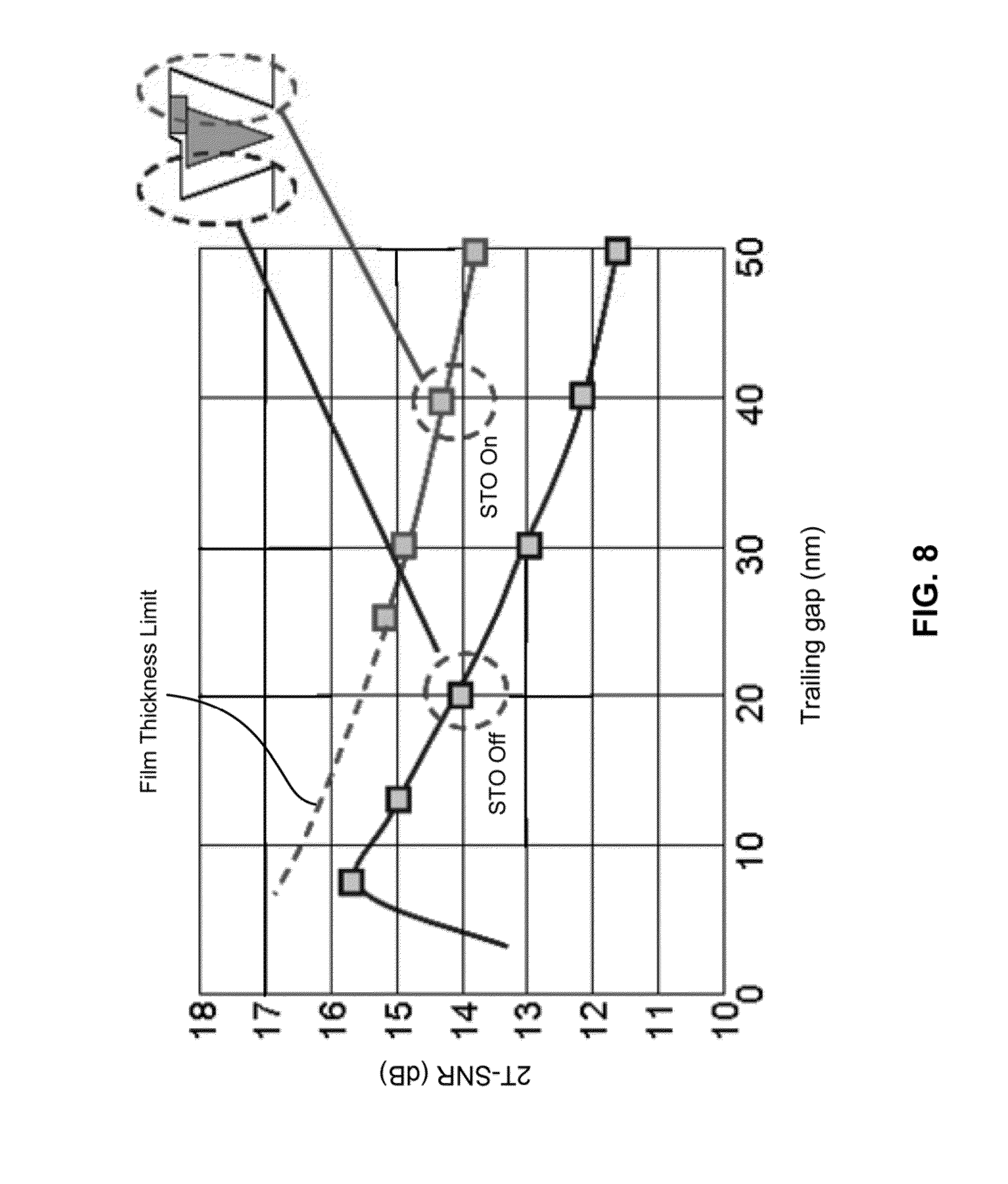 A magnetic data storage system according to one embodiment includes a magnetic head adapted to record data according to a shingled magnetic recording (SMR) process. The magnetic head includes a main pole adapted to produce a writing magnetic field, a trailing shield positioned above a trailing side of the main pole, wherein a trailing gap is defined between the trailing shield and the main pole, and a spin torque oscillator (STO) positioned above a first trailing corner of the main pole at an STO-side of the main pole, wherein the trailing gap has a greater length in a film thickness direction near the STO-side of the main pole and a lesser length in the film thickness direction near a second trailing corner of the main pole opposite the first trailing corner in a track width direction of the main pole.
