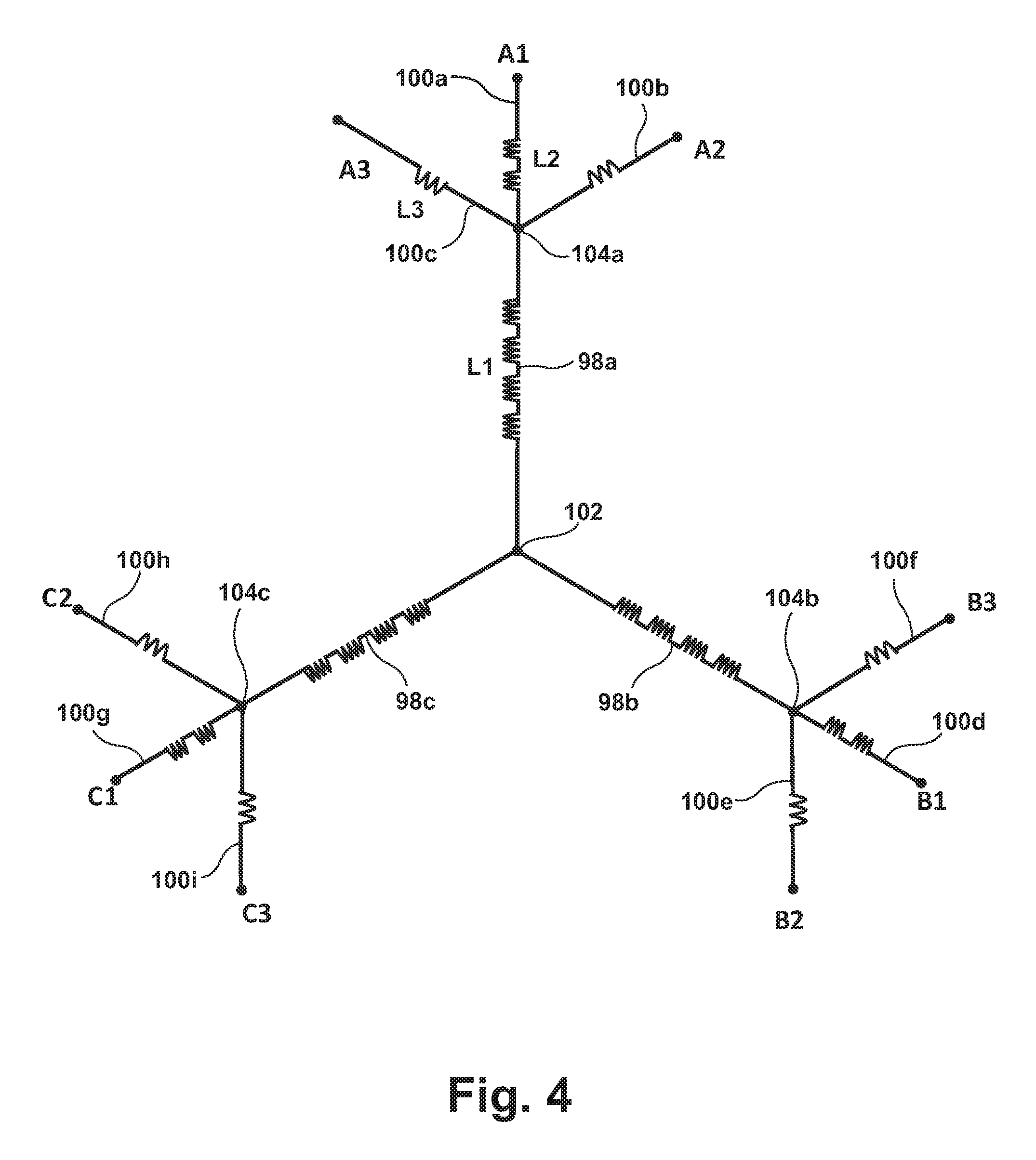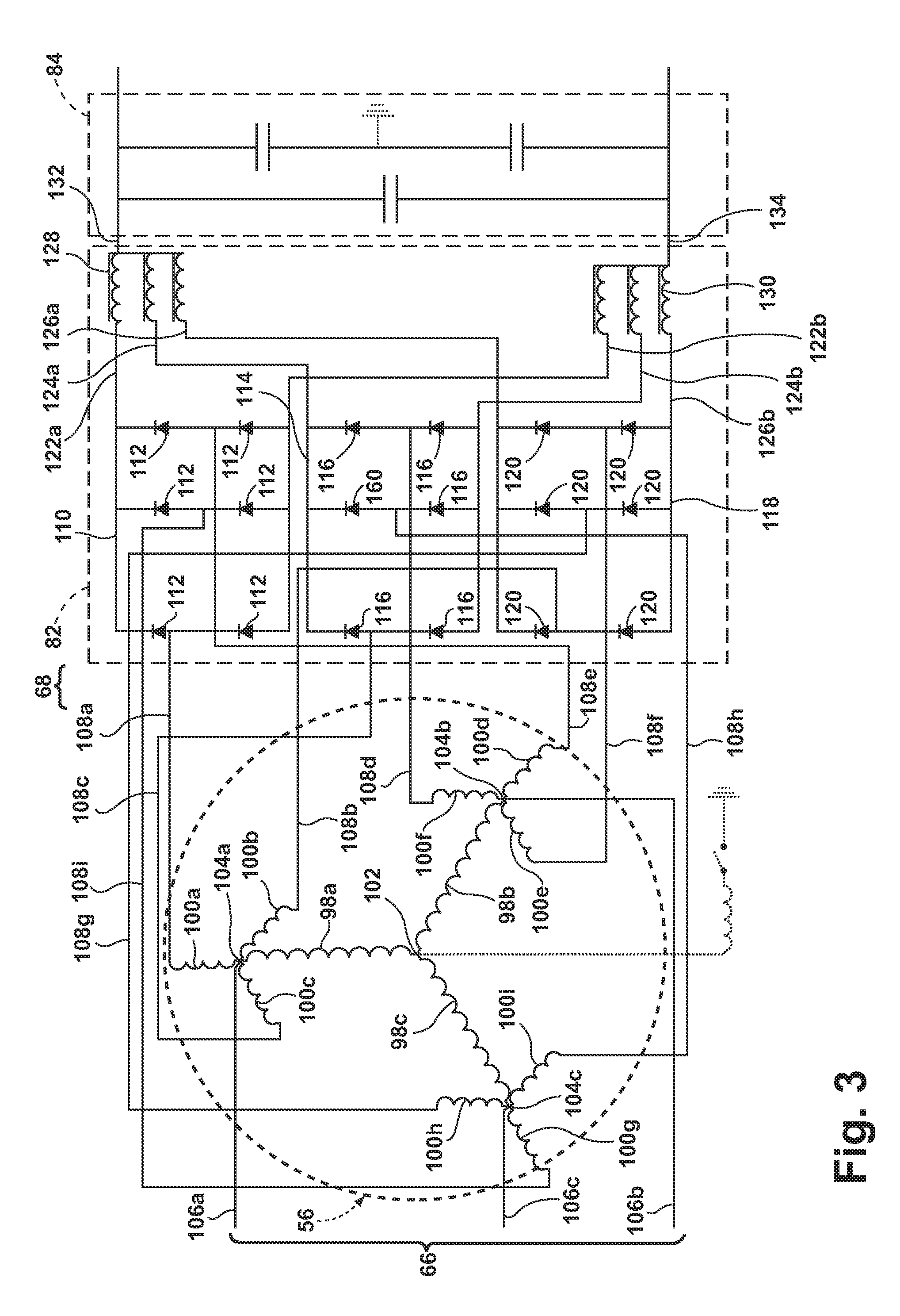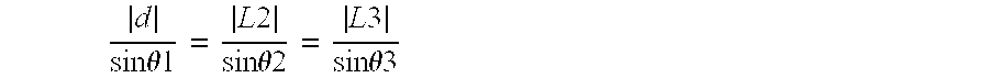 In this example, it can be given that N=18 and θ1=60°. Thus, angle α=20°, angle θ3=80° and angle θ2=40°. It is understood that θ2 or θ3 could be given instead of θ1. The relationship between the lengths L2, L3, d and the angles θ1, θ2, and θ3 is known from the law of sines as: The distance d from the end of main vector A1 to the end of main vector A3 is given by the following relationship: Using the law of sines, the lengths L2 and L3 are therefore given by the following relationships: Using the relationship between the voltage V and lengths L1, L2, the length L1 can be determined using the following relationship:
