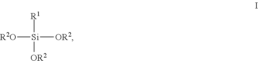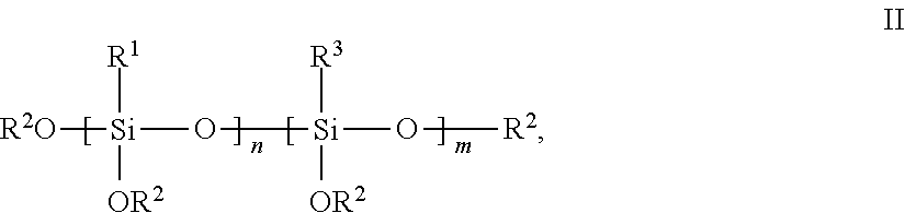 in which groups R1and R3, independently of one another, are C1-C18-alkyl groups which may contain substituents having one or more heteroatoms from the series consisting of N, O, Cl, P and S, groups R2are identical or different and R2is a hydrogen atom or an alkyl radical having 1 to 6 carbon atoms, preferably having 1 or 2 carbon atoms, i.e. methyl or ethyl, and (n+m) represents the degree of oligomerization with a numerical value of 2 to 50, preferably 2 to 30, in particular preferably 3 to 20, in particular 3 to 15. These are advantageously oligomer mixtures having an average degree of oligomerization of 2 to 50 (including all numbers in between), preferably of 2 to 30, the average molar mass preferably being 300 to 10 000 g/mol (including all numbers in between). The silane oligomers of the general formula II may be present as linear, cyclic and/or branched units. The determination of the molar mass or average molar mass of said oligomers can be effected, for example, by means of GPC analysis.