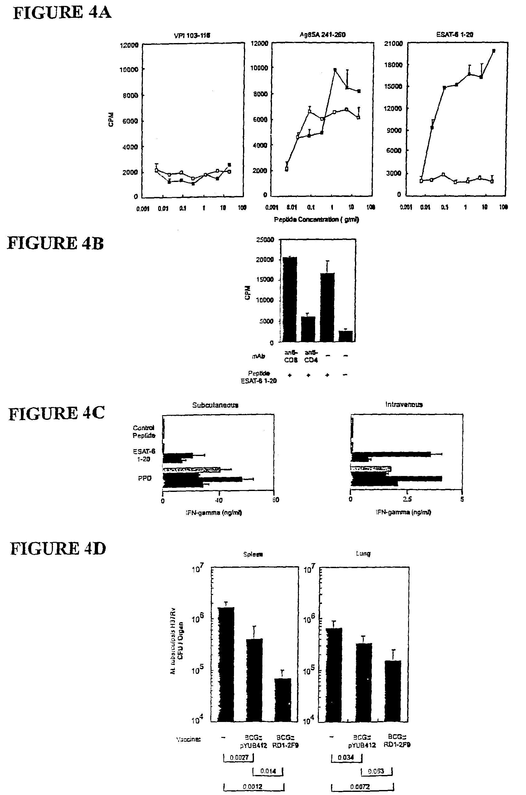[0165]Further characterization of the immune responses was carried out. Splenocytes from mice immunized with BCG::RD1-2F9 or control BCG both proliferated in response to the immunodominant antigen 85A peptide (FIG. 13A). The strong splenocyte proliferation in the presence of ESAT-6 was abolished by an anti-CD4 monoclonal antibody but not by anti-CD8 indicating that the CD4+ T-cell subset was involved (FIG. 13B). Interestingly, as judged by in vitro IFN-γ response to PPD and the ESAT peptide, subcutaneous immunization generated much stronger T-cell responses (FIG. 13C) compared to intravenous injection. After subcutaneous immunisation with BCG::RD1-2F9 strong ESAT-6 specific responses were also detected in inguinal lymph nodes (data not shown). These experiments demonstrated that the ESAT-6 T-cell immune responses to vaccination with BCG::RD1-2F9 were potent, reproducible and robust making this recombinant an excellent candidate for protection studies.